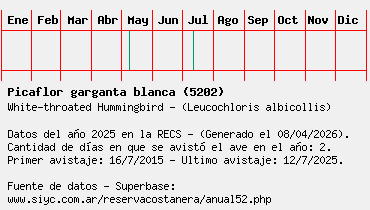 Lista avistajes en la RECS para una especie definida: 5202 - Picaflor garganta blanca
