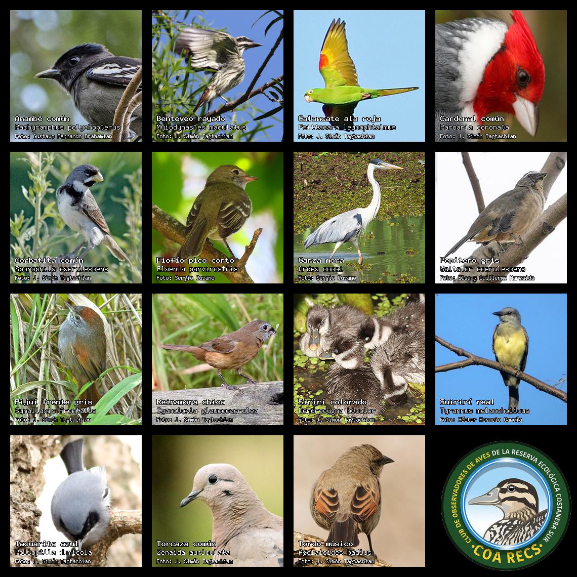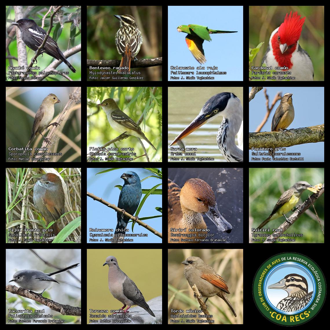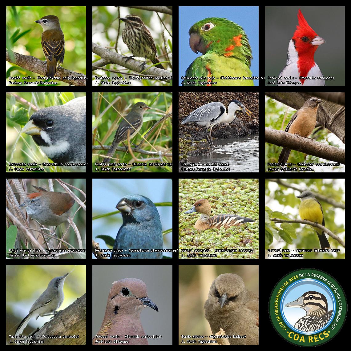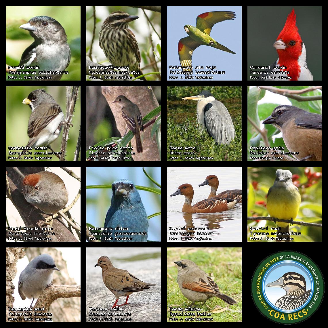 (Gavilán mixto, Carancho, Chimango, Benteveo común, Hornero, Carpintero real y Estornino pinto)