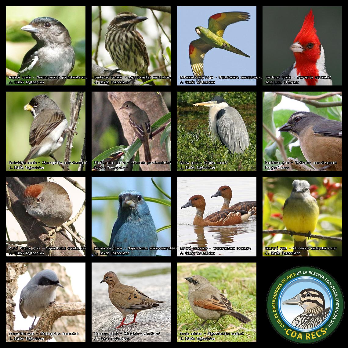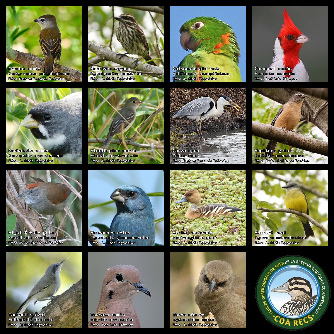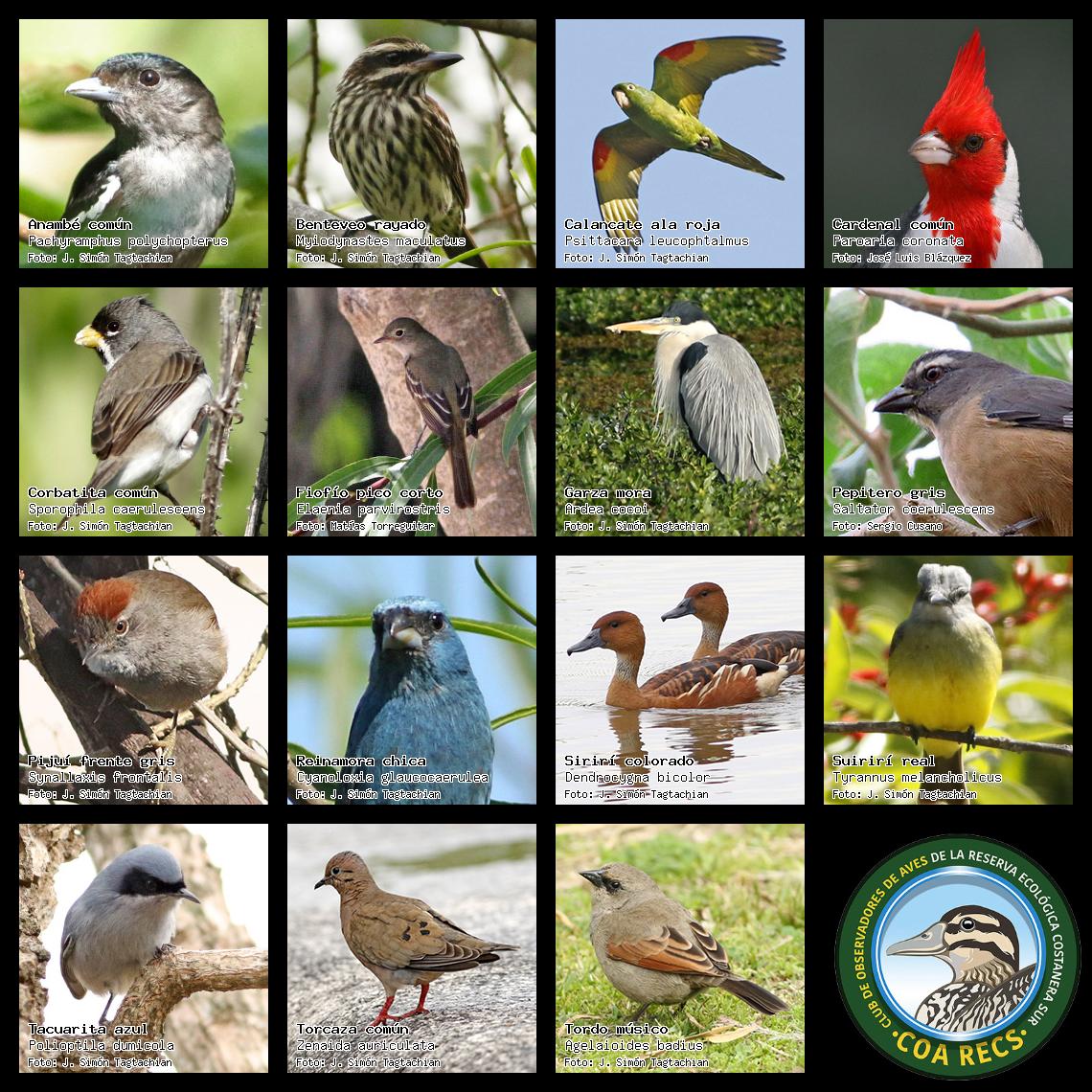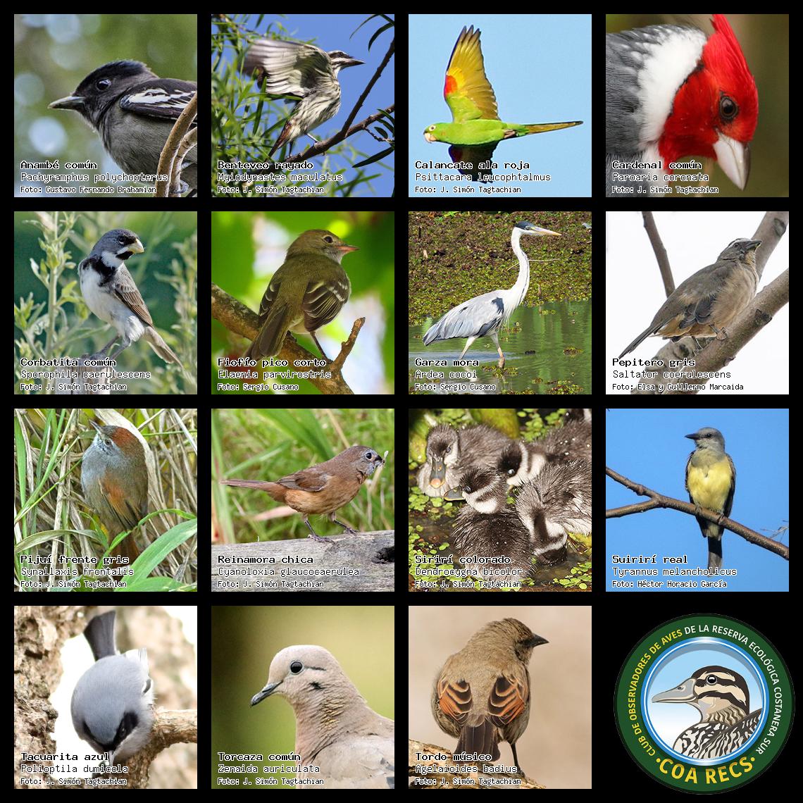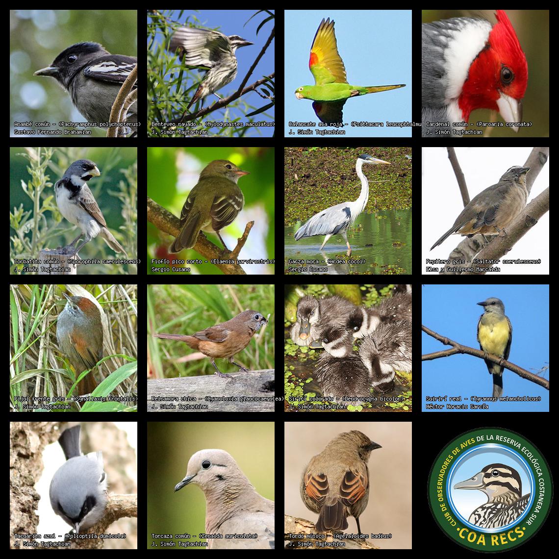 (Gavilán mixto, Carancho, Chimango, Benteveo común, Hornero, Carpintero real y Estornino pinto)