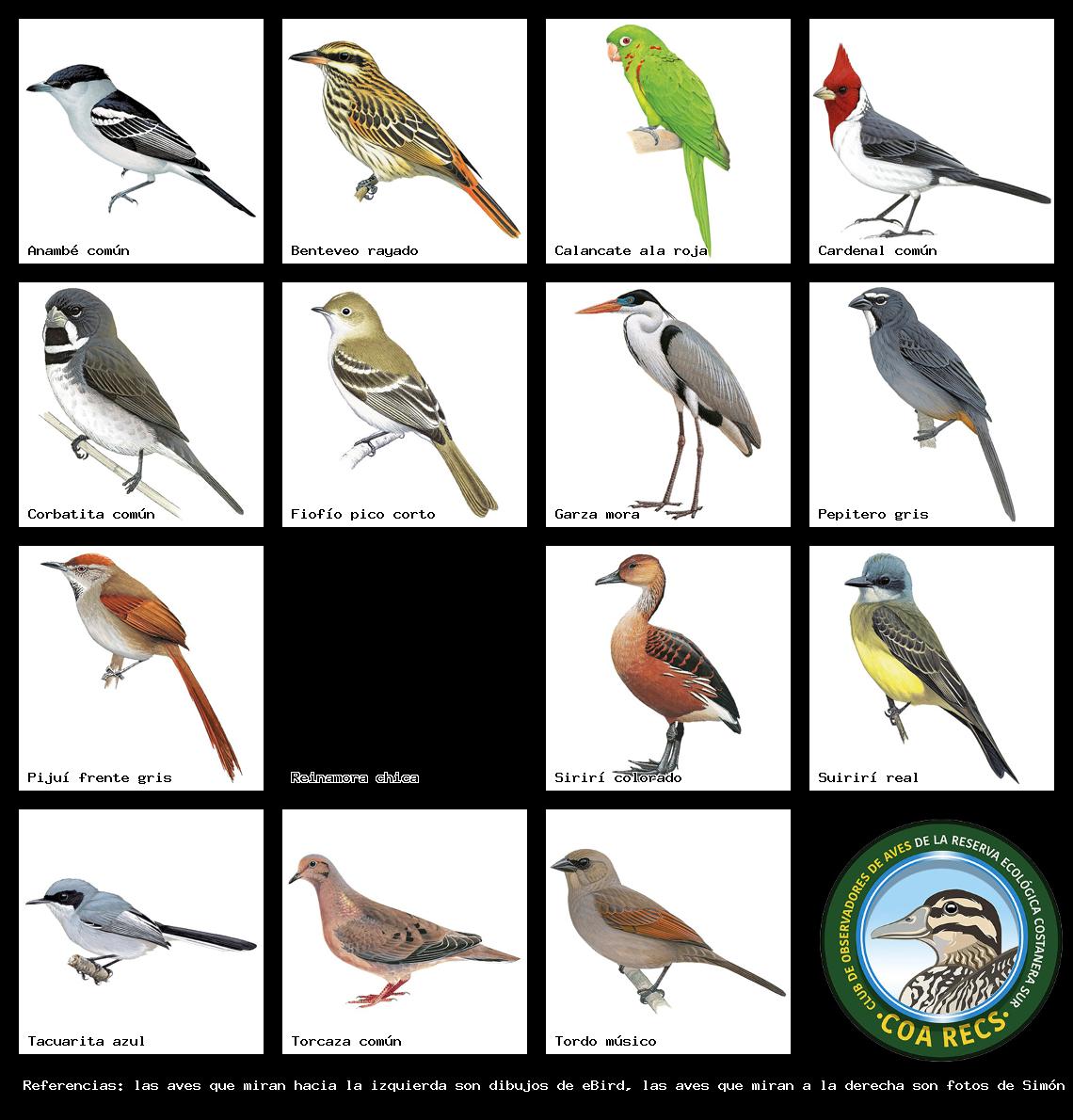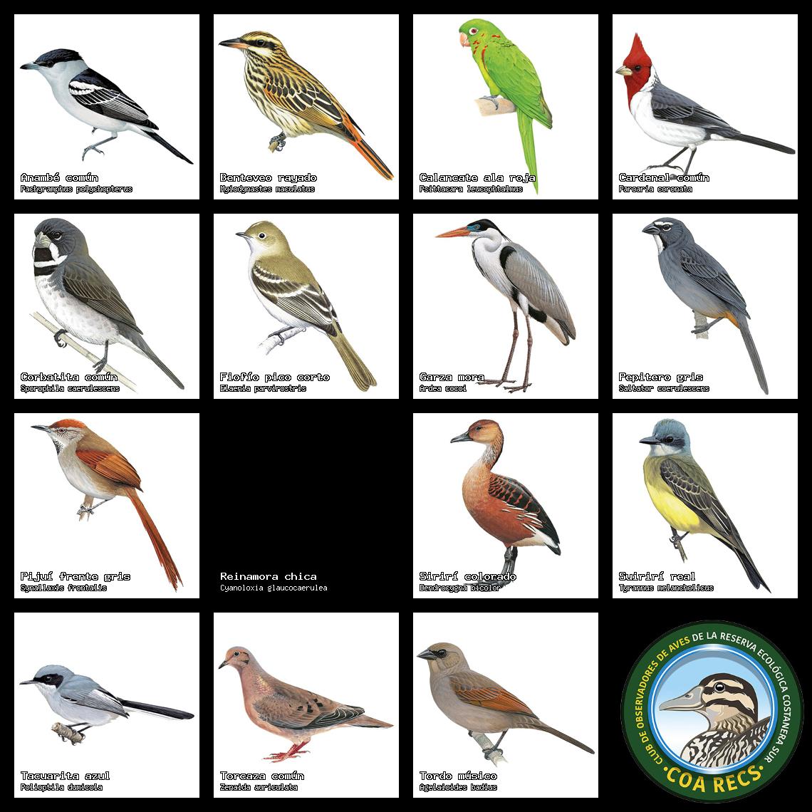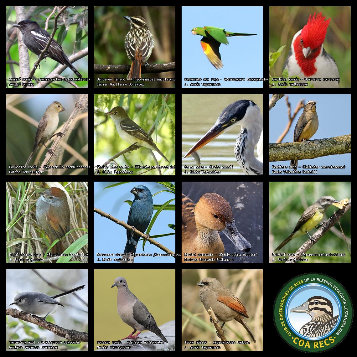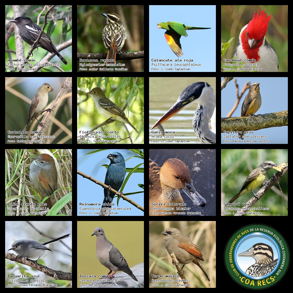 (Gavilán mixto, Carancho, Chimango, Benteveo común, Hornero, Carpintero real y Estornino pinto)