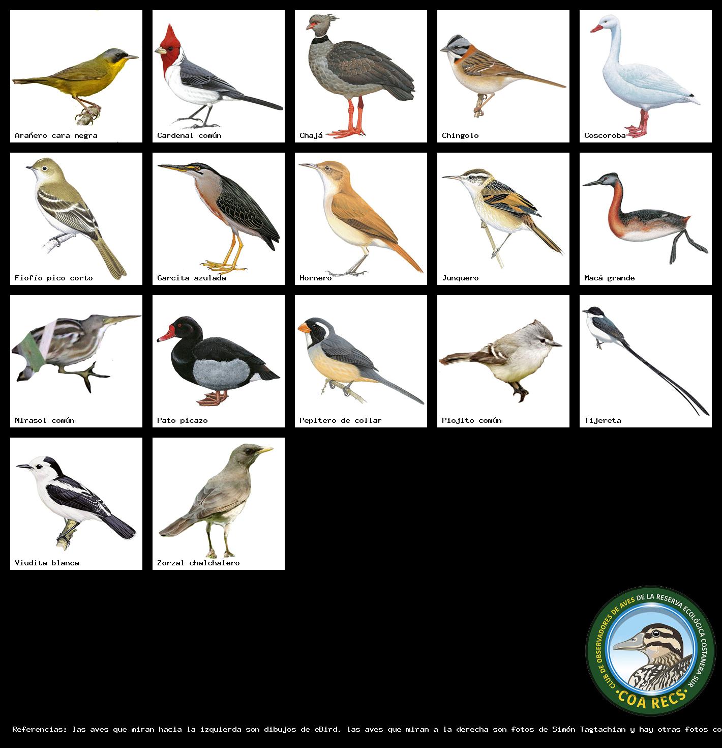 (Gavilán mixto, Carancho, Chimango, Benteveo común, Hornero, Carpintero real y Estornino pinto)
