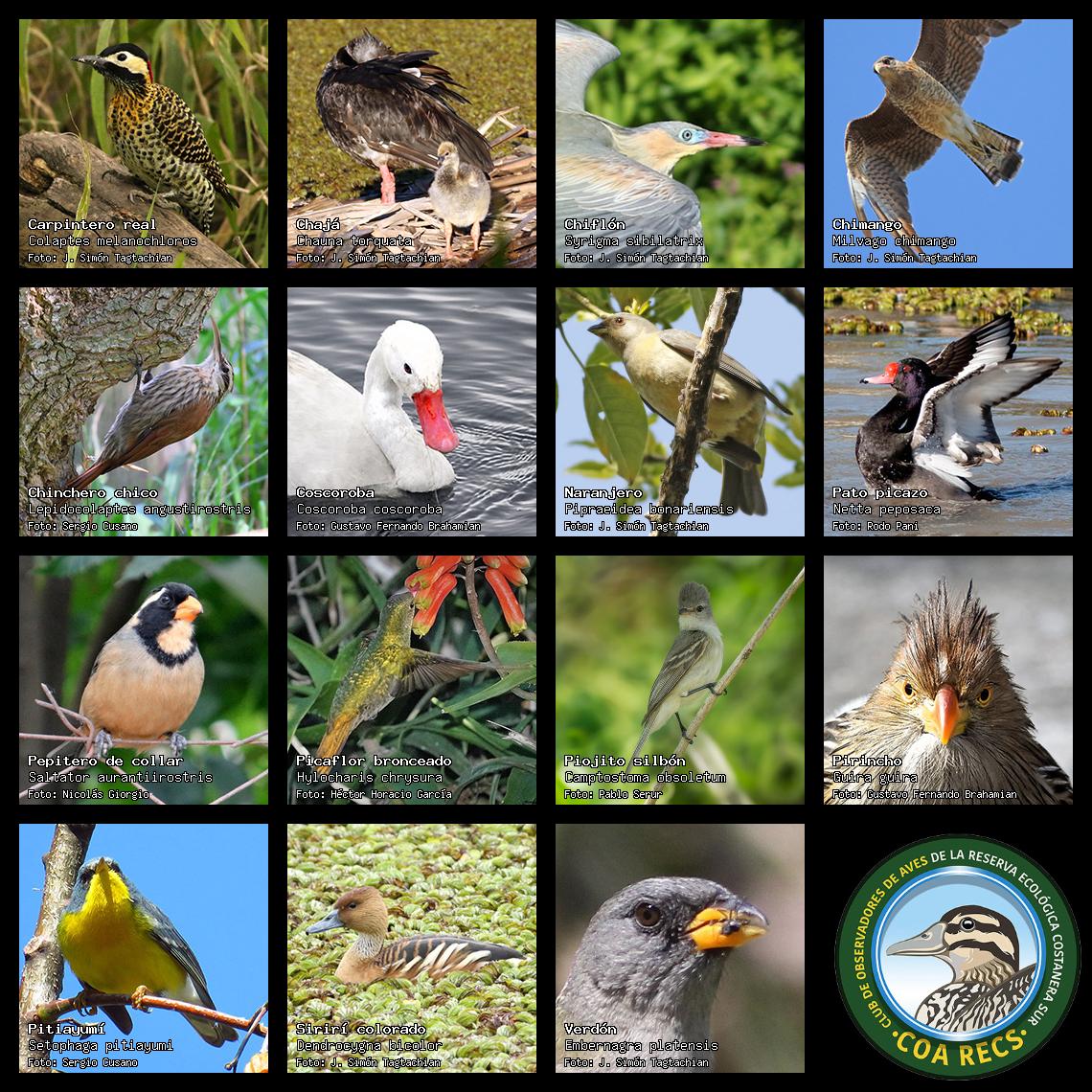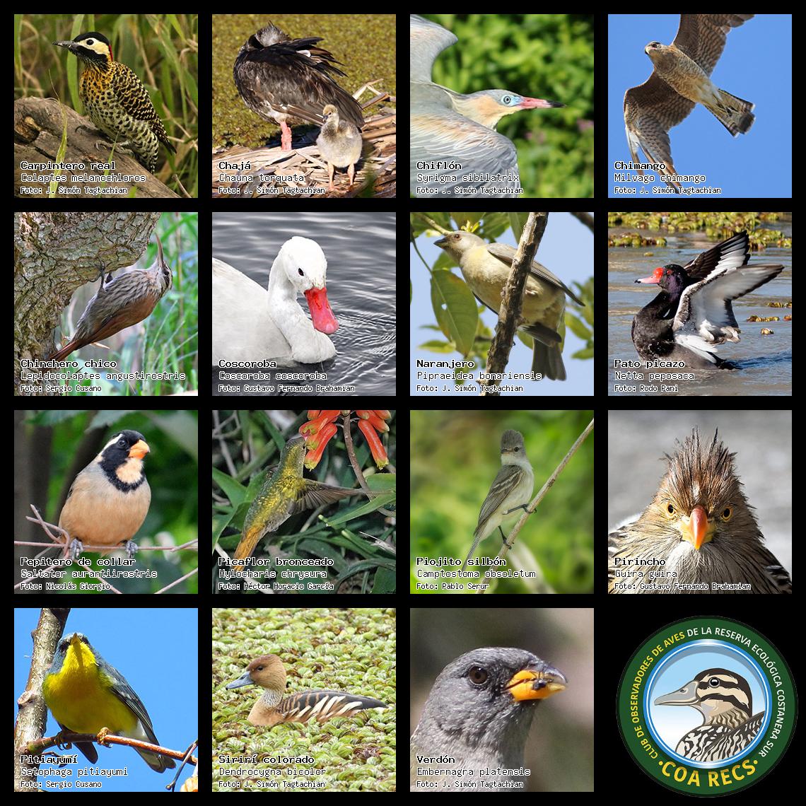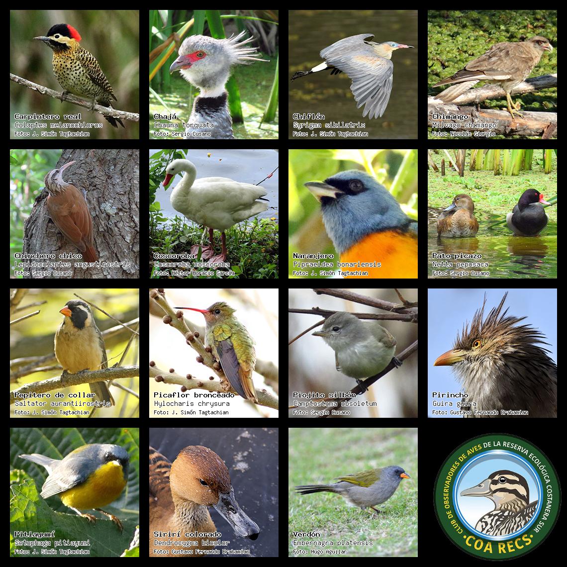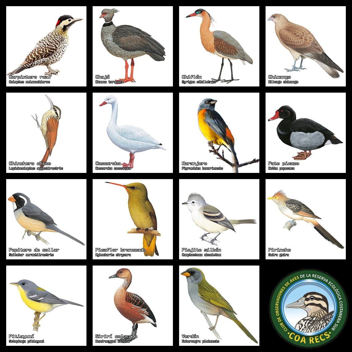 (Gavilán mixto, Carancho, Chimango, Benteveo común, Hornero, Carpintero real y Estornino pinto)