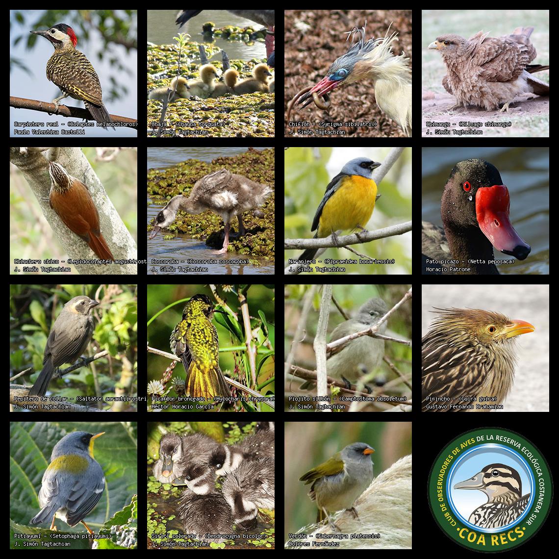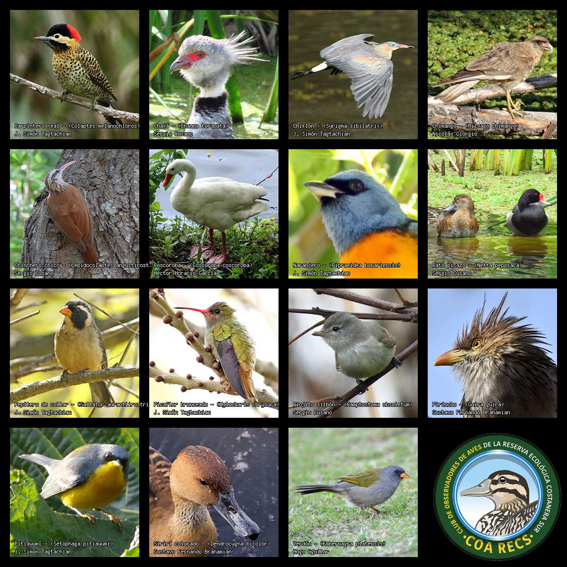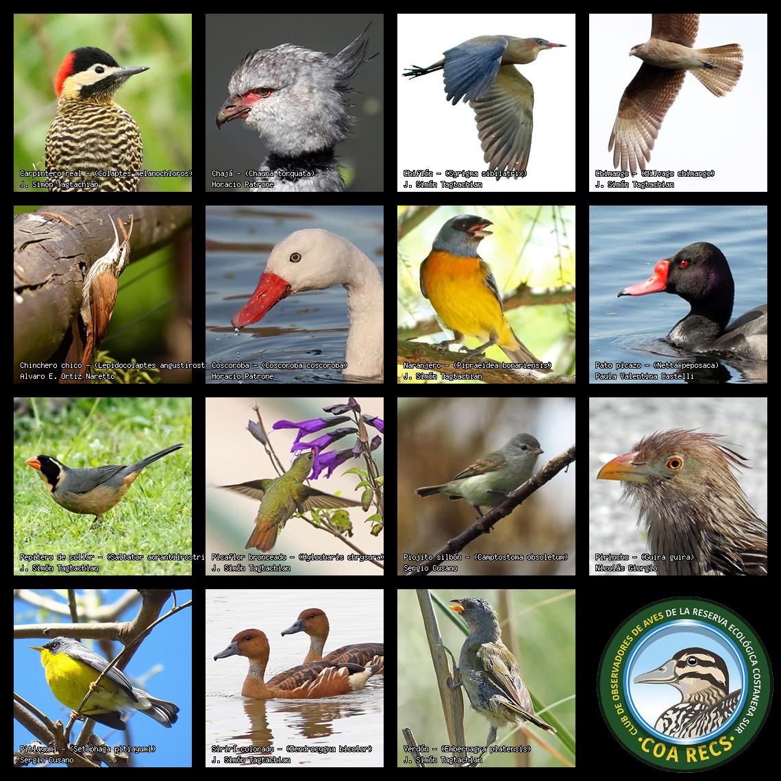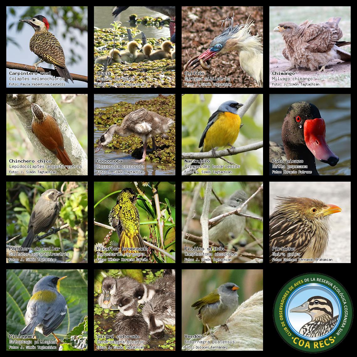 (Gavilán mixto, Carancho, Chimango, Benteveo común, Hornero, Carpintero real y Estornino pinto)
