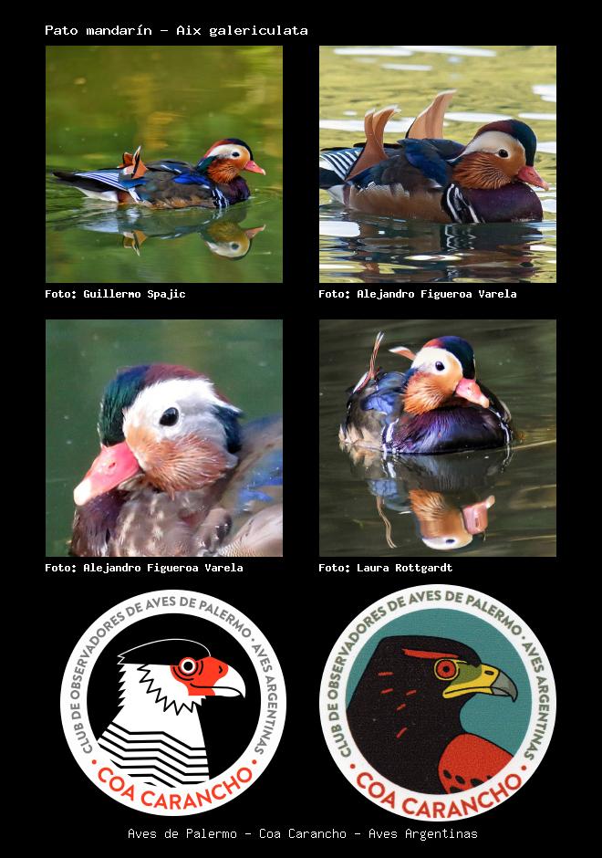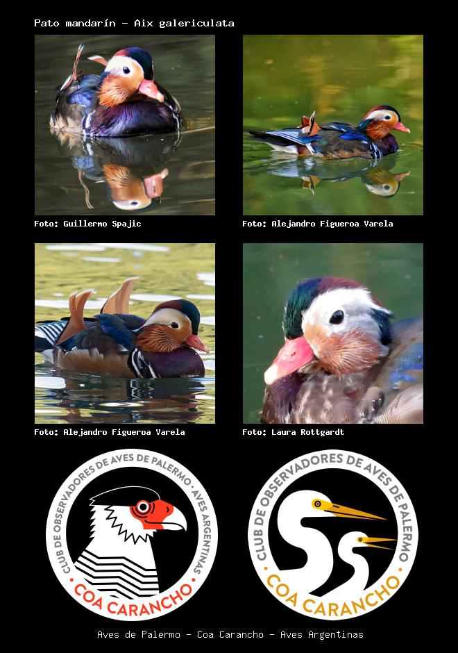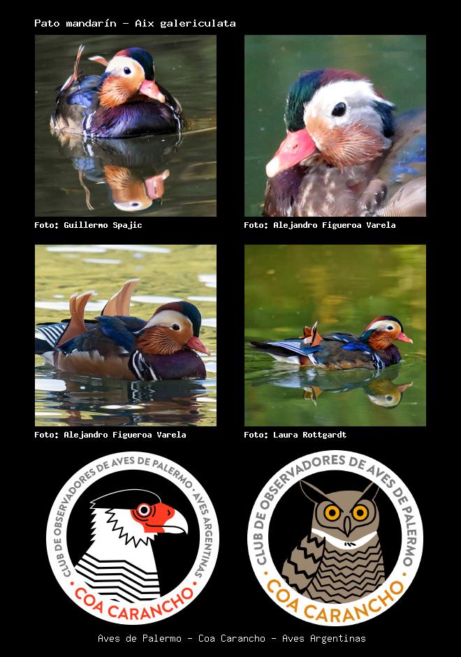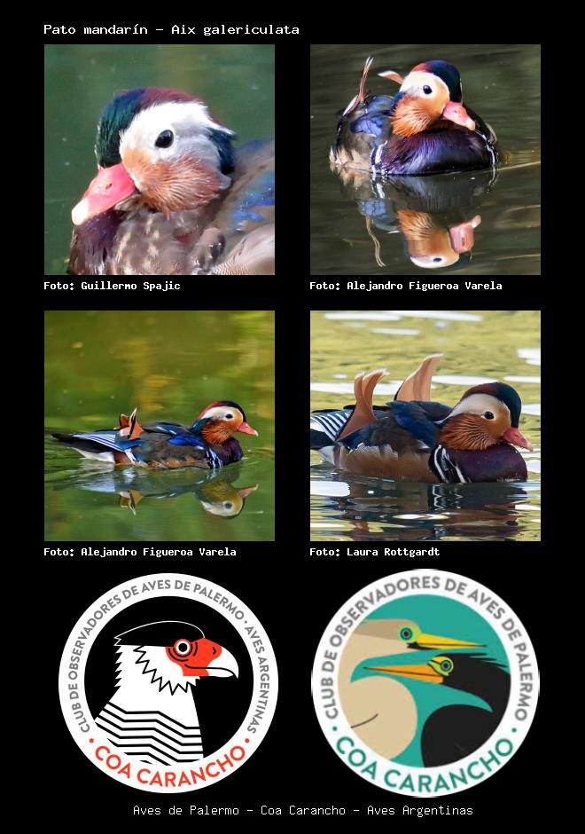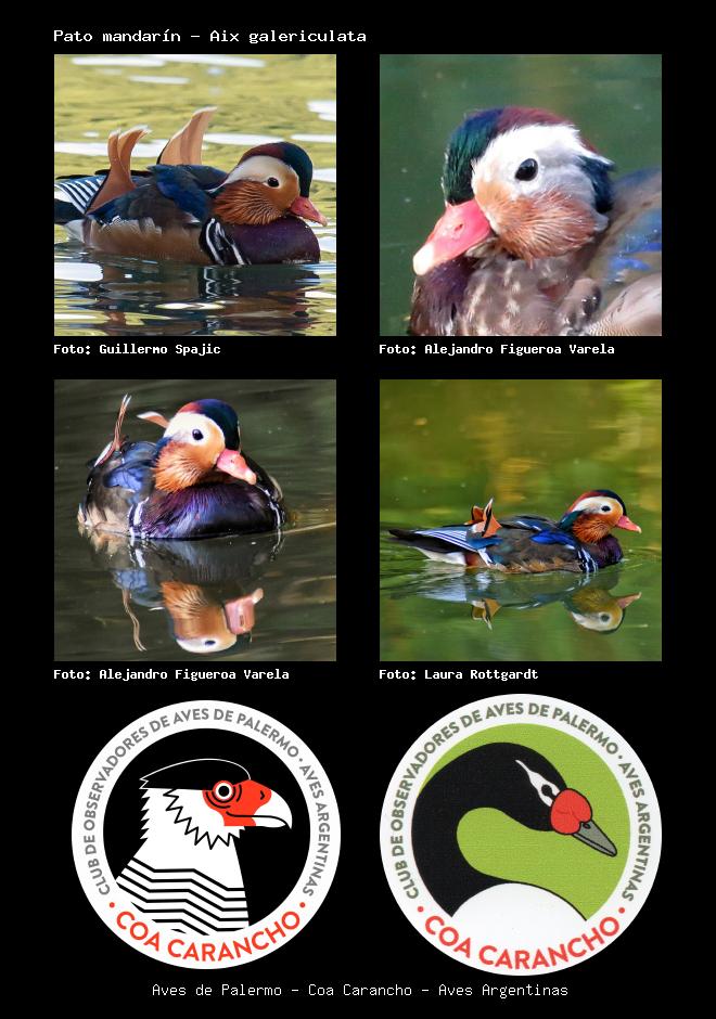| Pato mandarín Mandarin duck Aix galericulata Familia: Anatidae Código: 9998 - Orden: 70 | ![]() Guillermo Spajic | ![]() Alejandro Figueroa Varela |