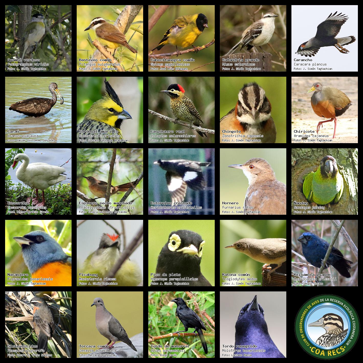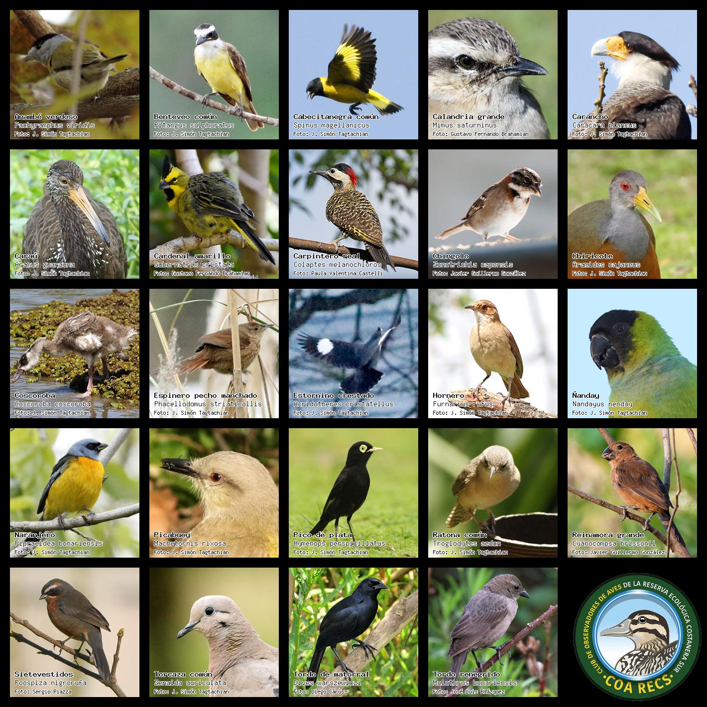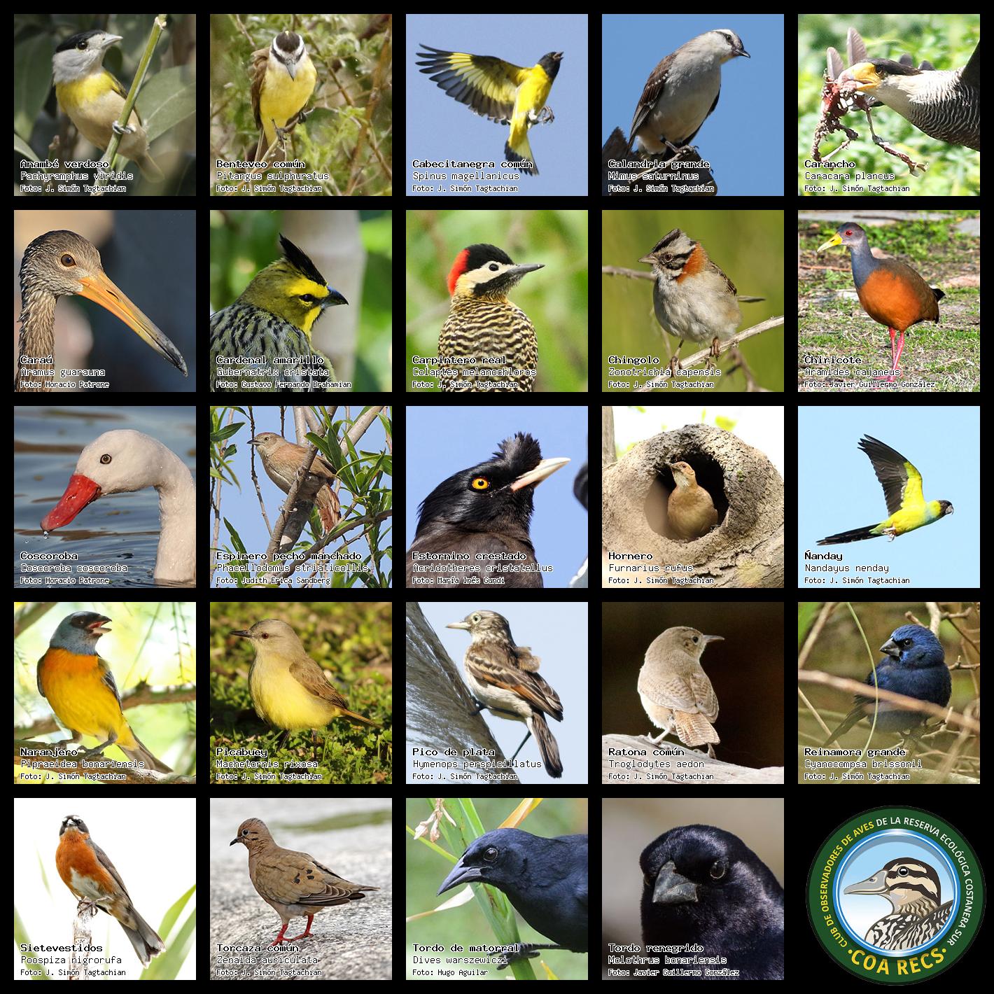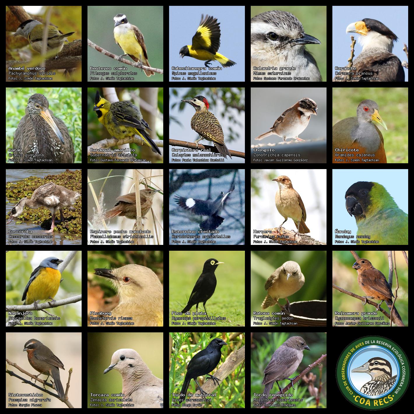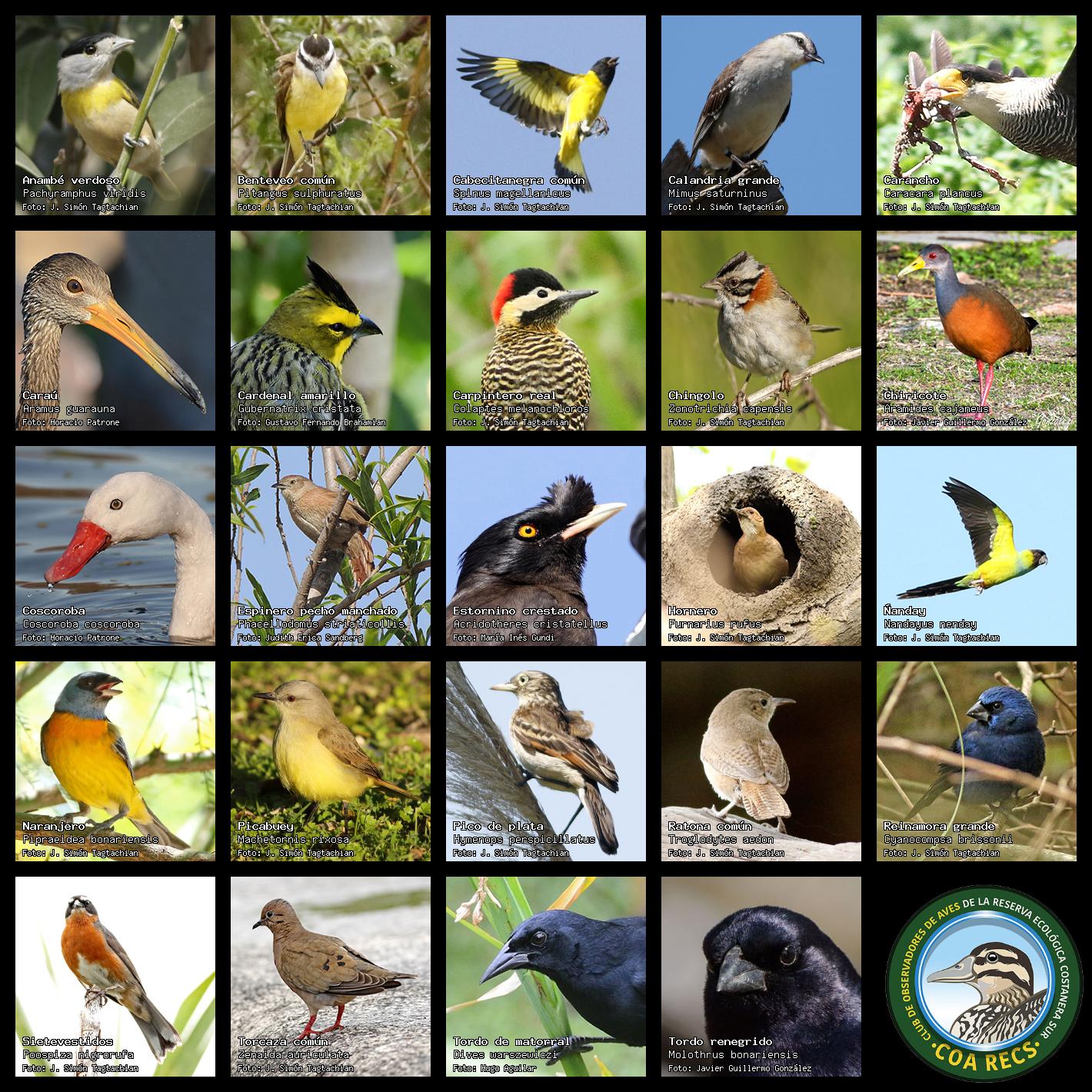 (Gavilán mixto, Carancho, Chimango, Benteveo común, Hornero, Carpintero real y Estornino pinto)