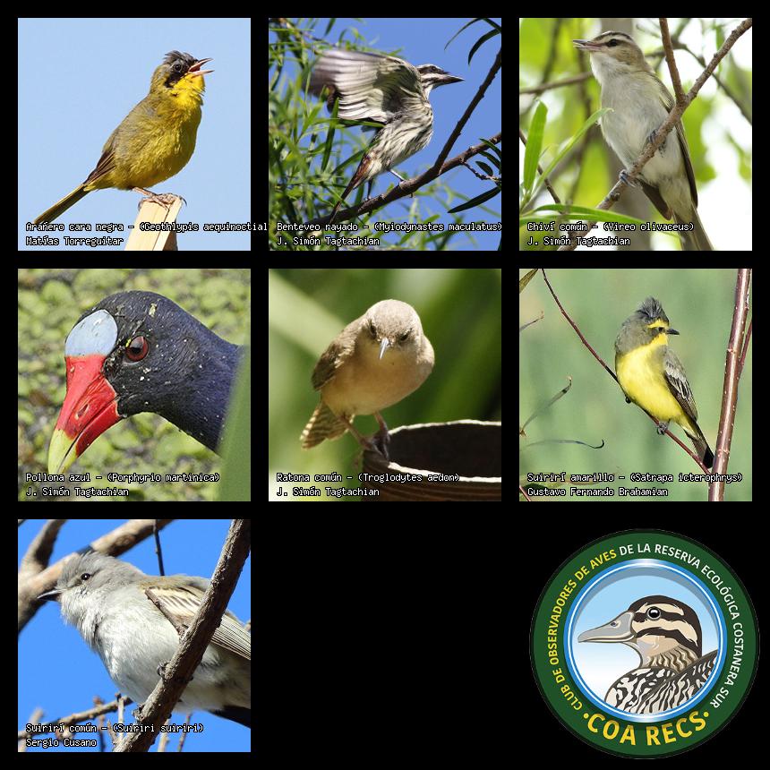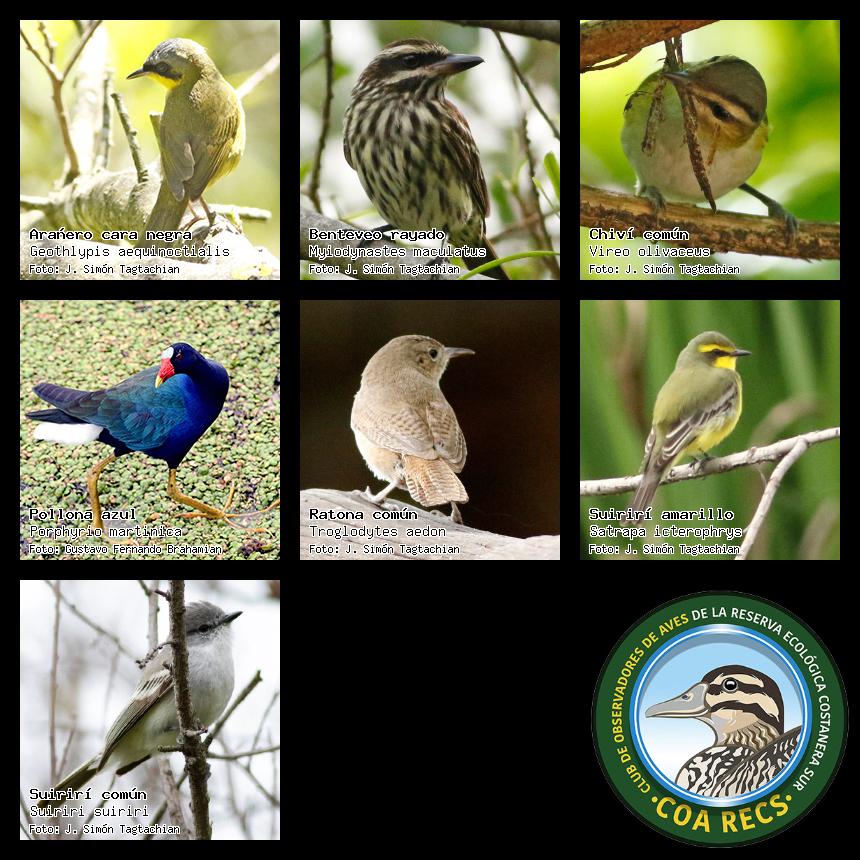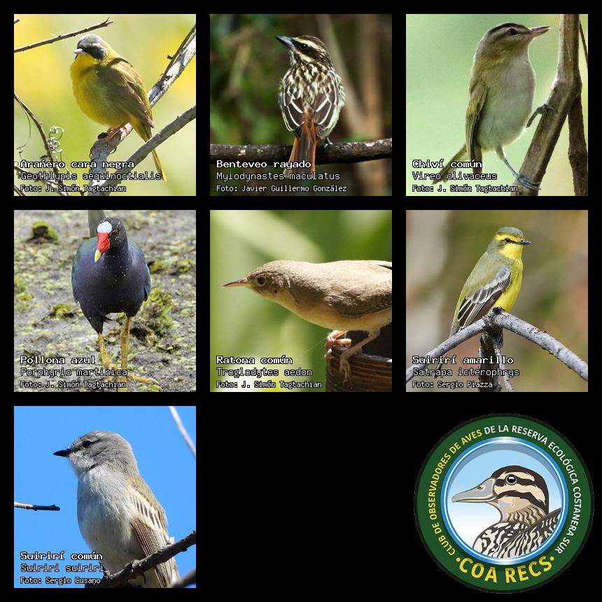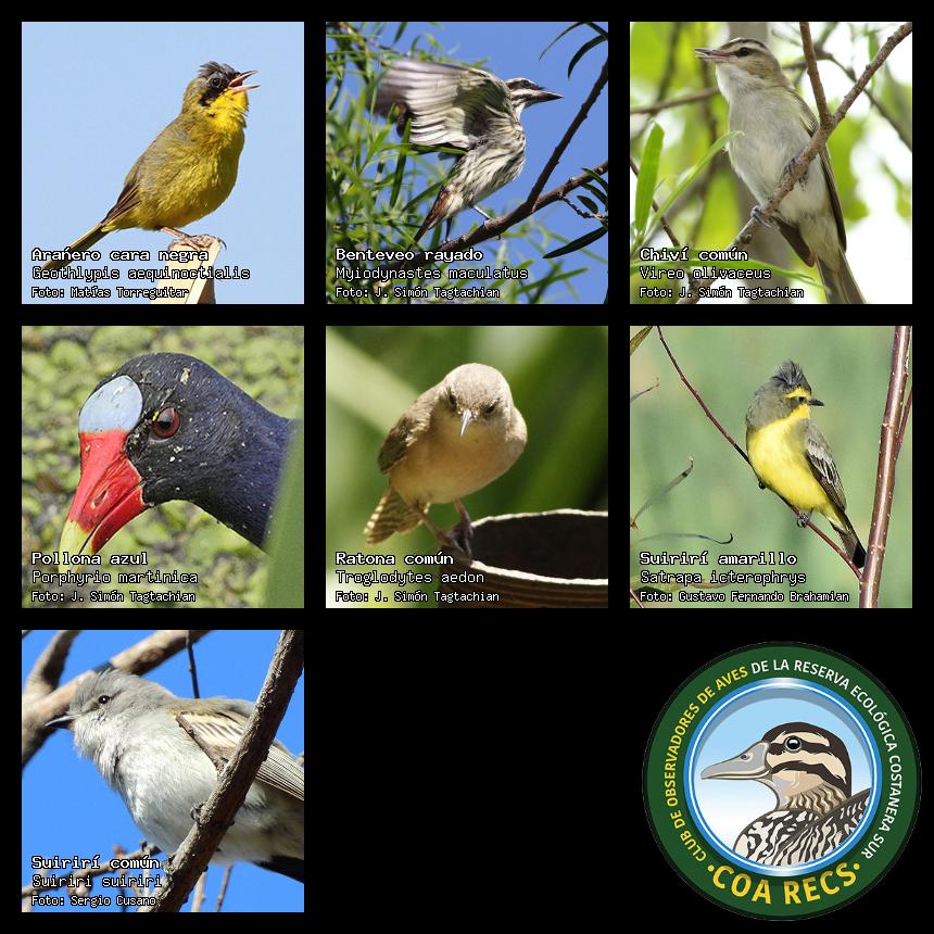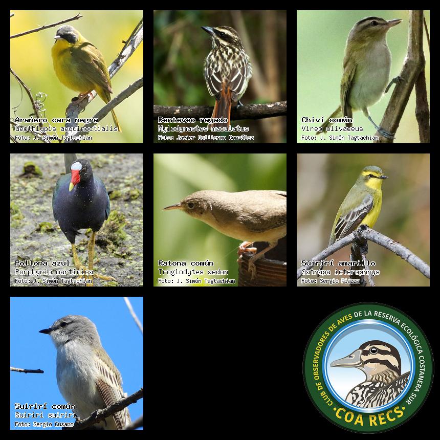 (Gavilán mixto, Carancho, Chimango, Benteveo común, Hornero, Carpintero real y Estornino pinto)