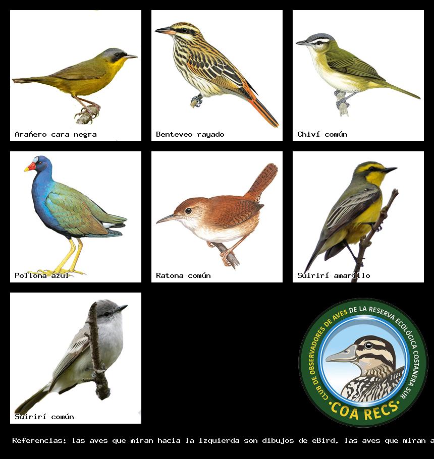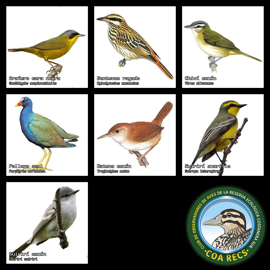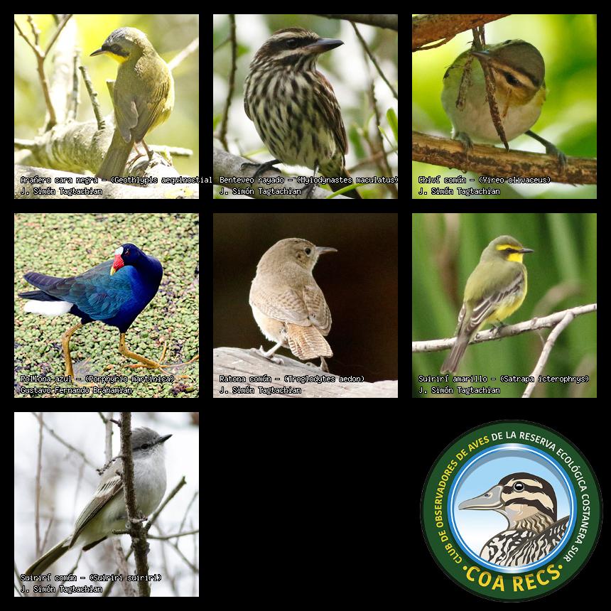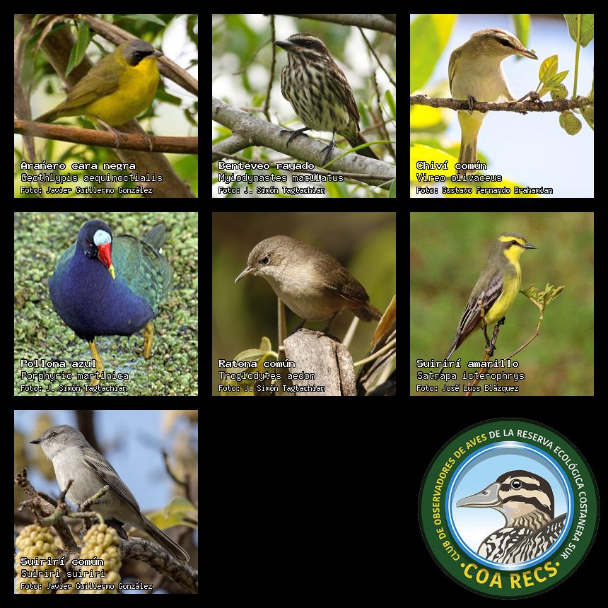 (Gavilán mixto, Carancho, Chimango, Benteveo común, Hornero, Carpintero real y Estornino pinto)