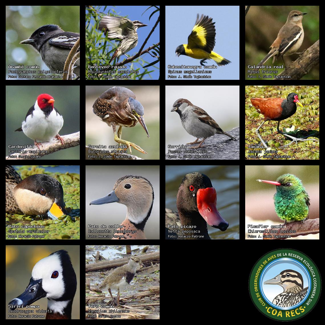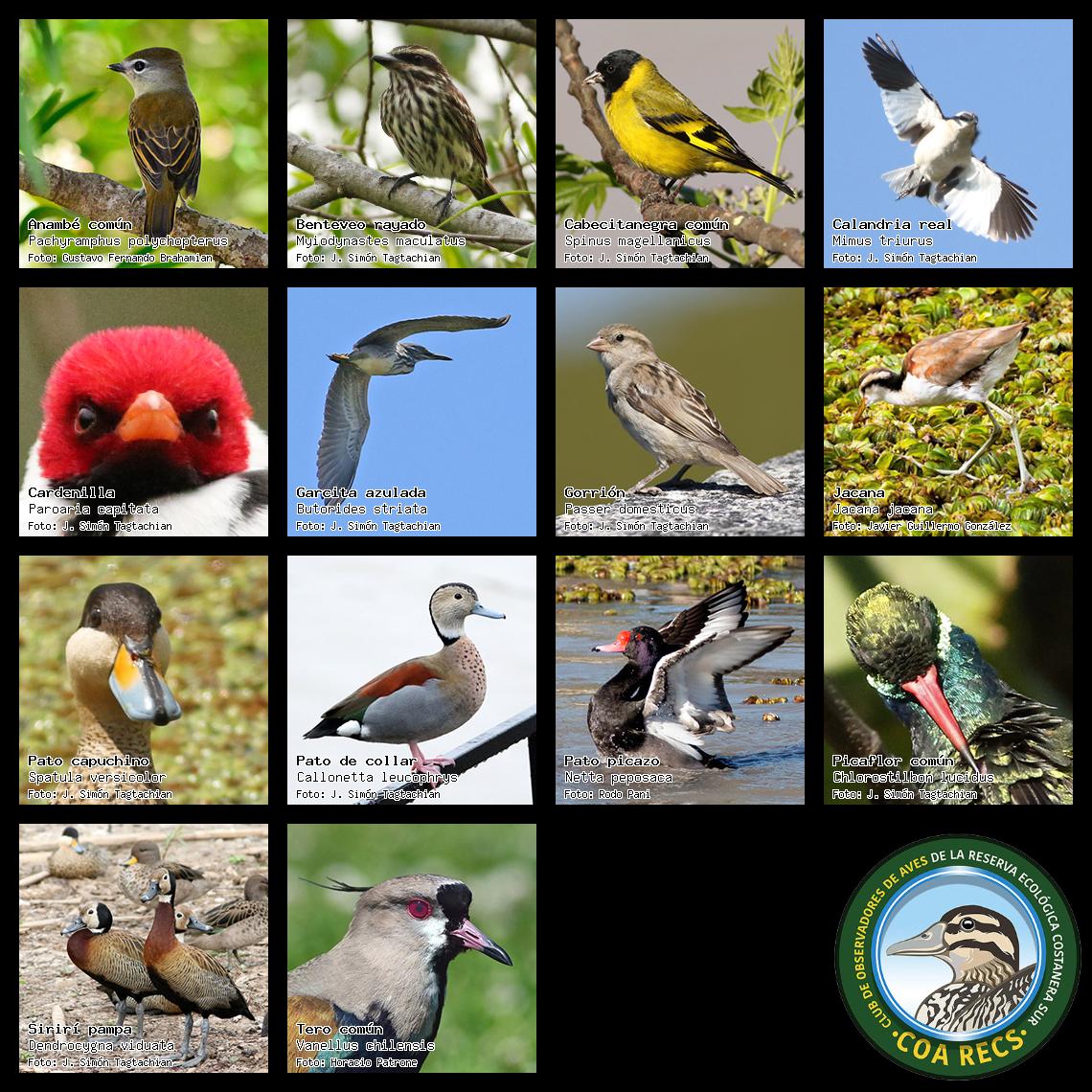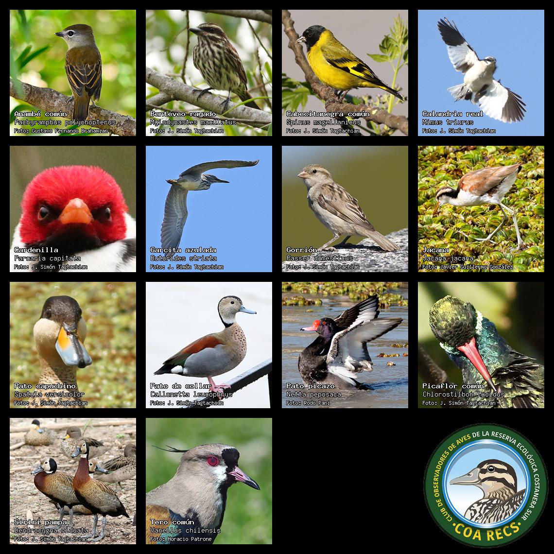 (Gavilán mixto, Carancho, Chimango, Benteveo común, Hornero, Carpintero real y Estornino pinto)
