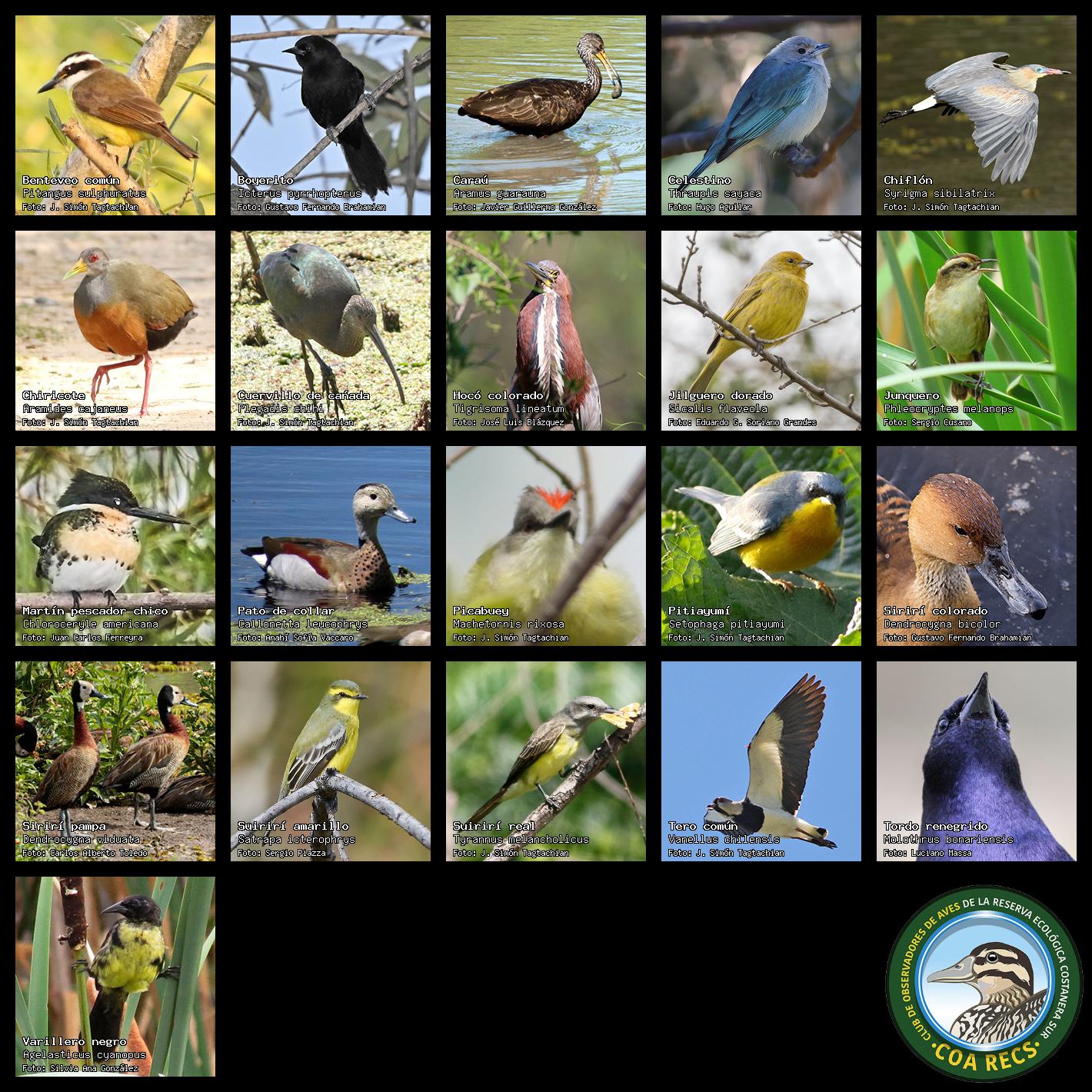 (Gavilán mixto, Carancho, Chimango, Benteveo común, Hornero, Carpintero real y Estornino pinto)