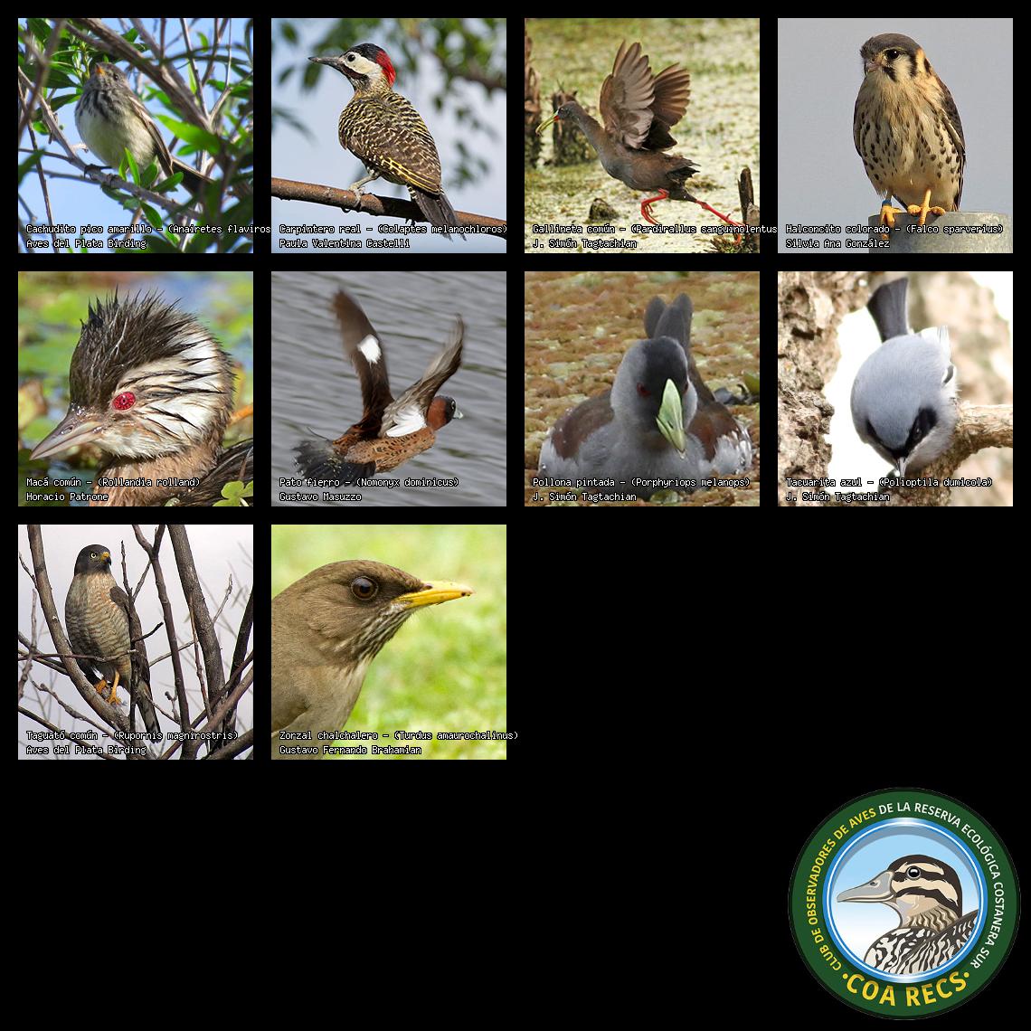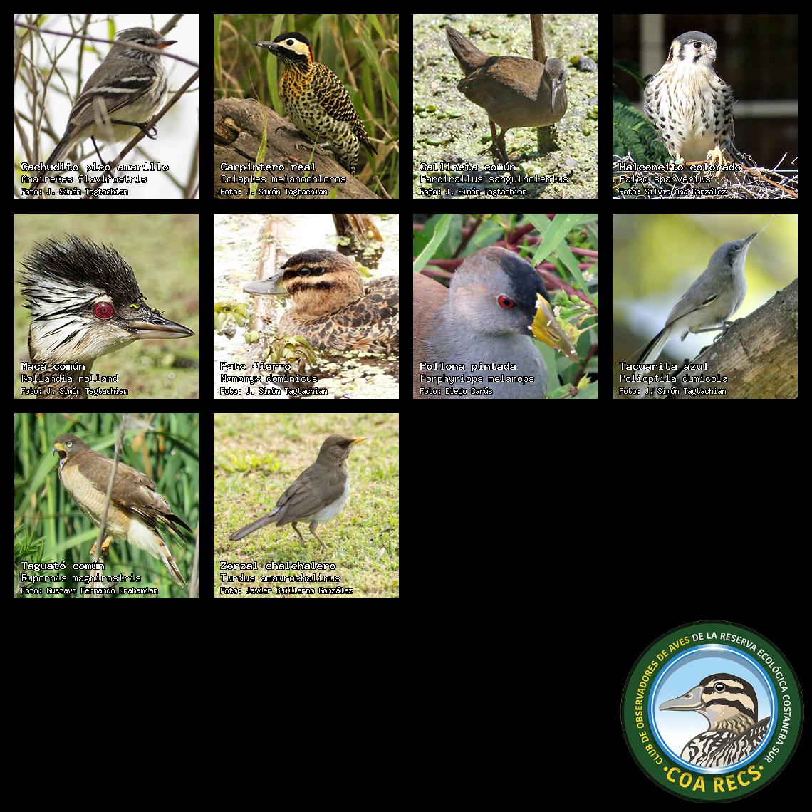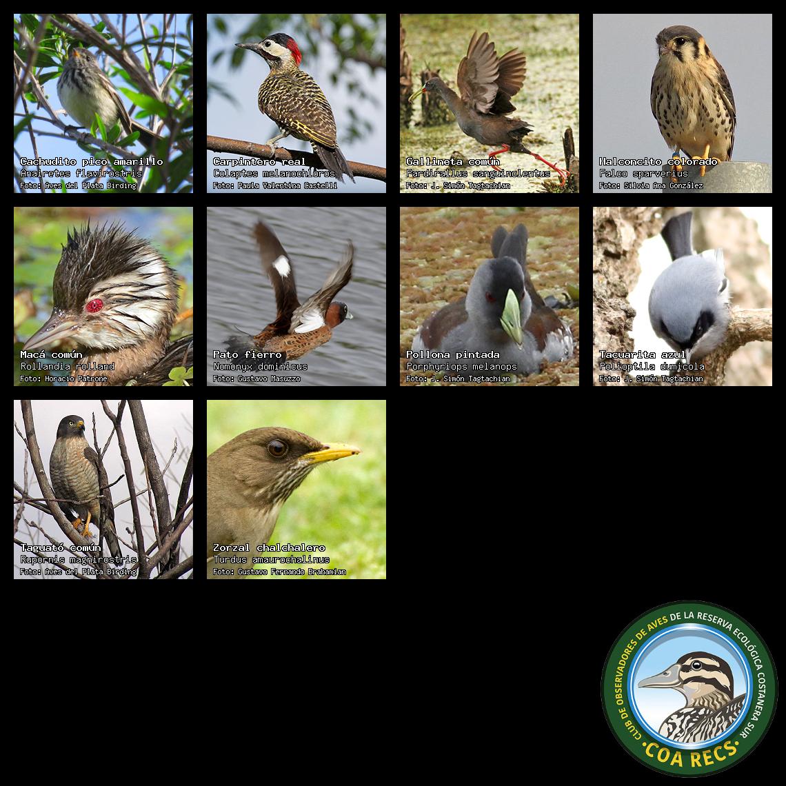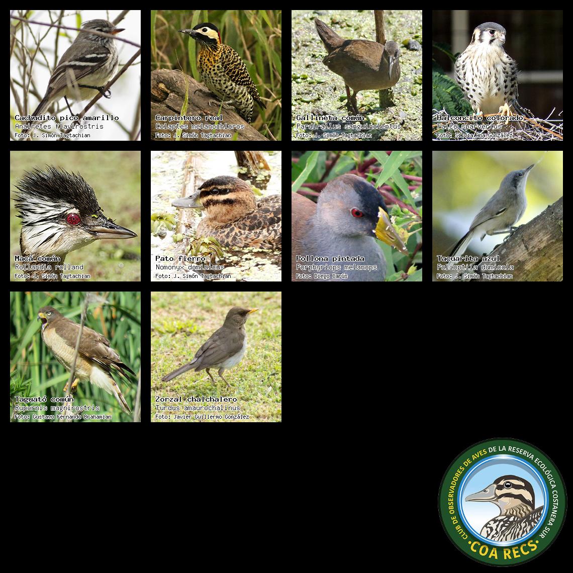 (Gavilán mixto, Carancho, Chimango, Benteveo común, Hornero, Carpintero real y Estornino pinto)