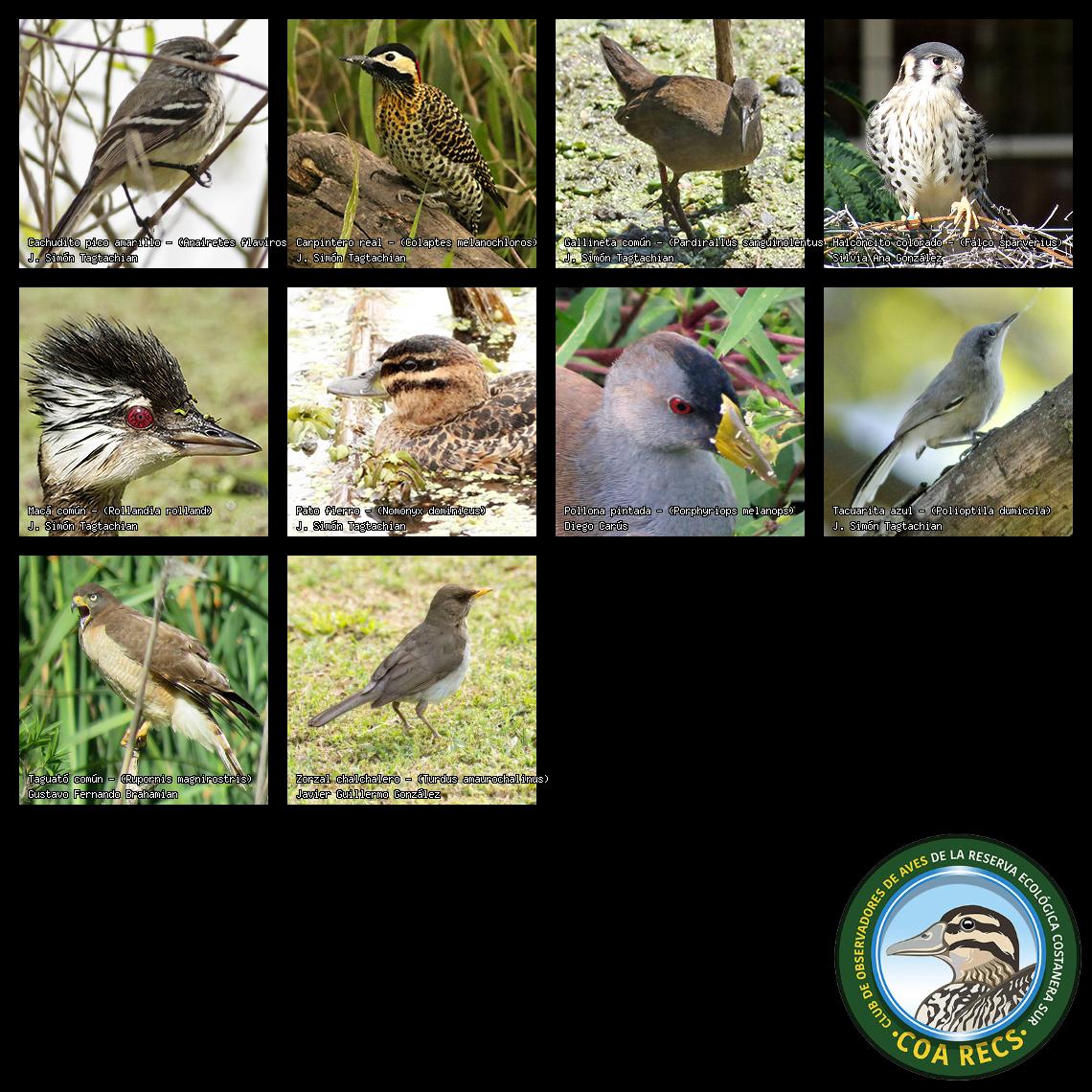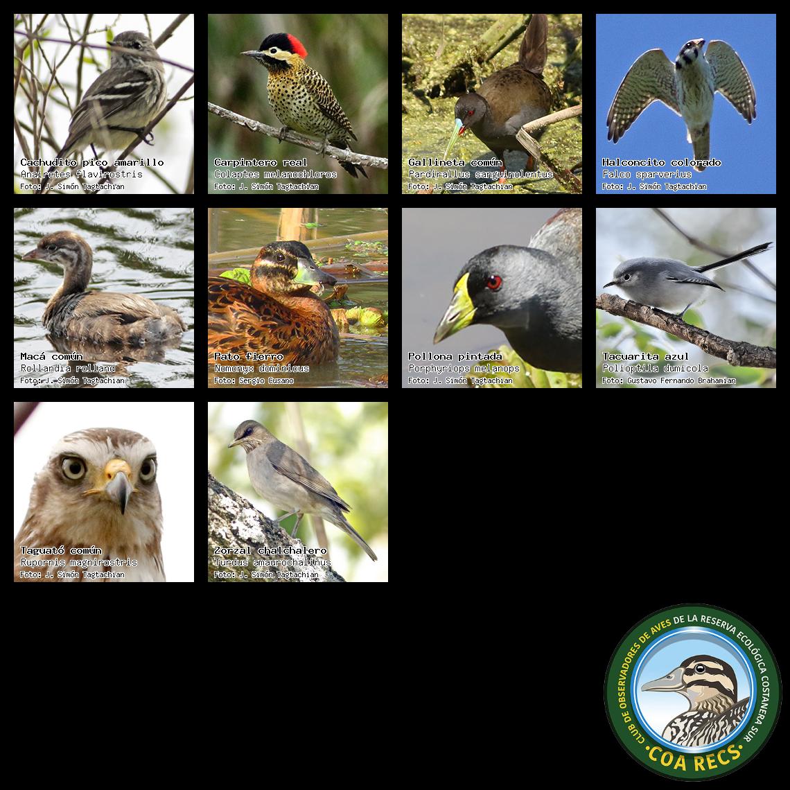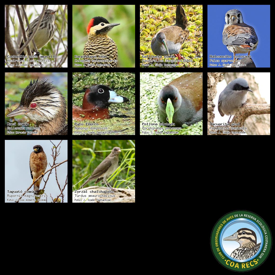 (Gavilán mixto, Carancho, Chimango, Benteveo común, Hornero, Carpintero real y Estornino pinto)