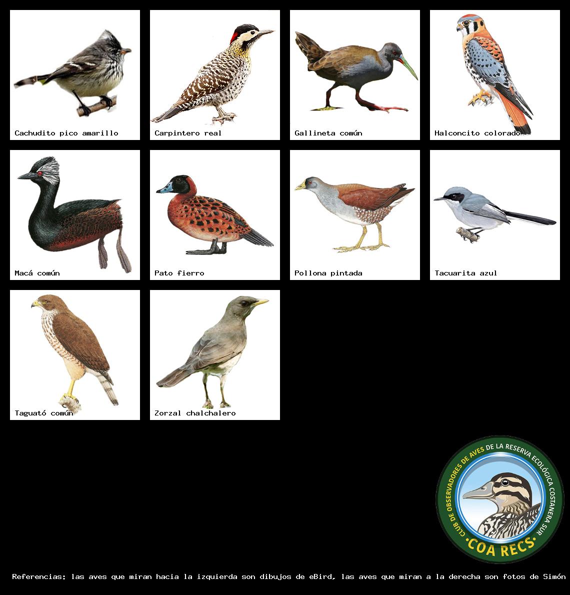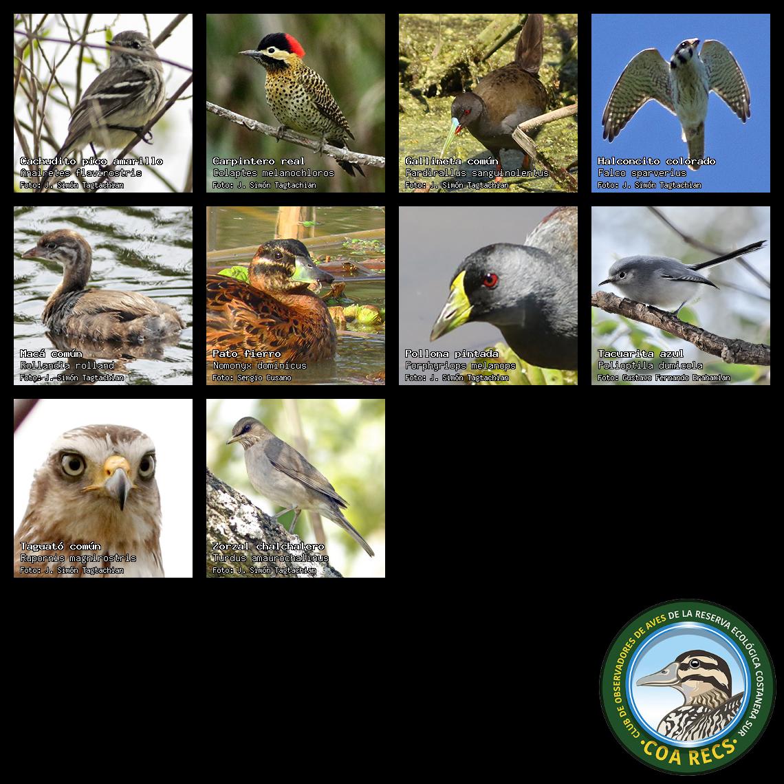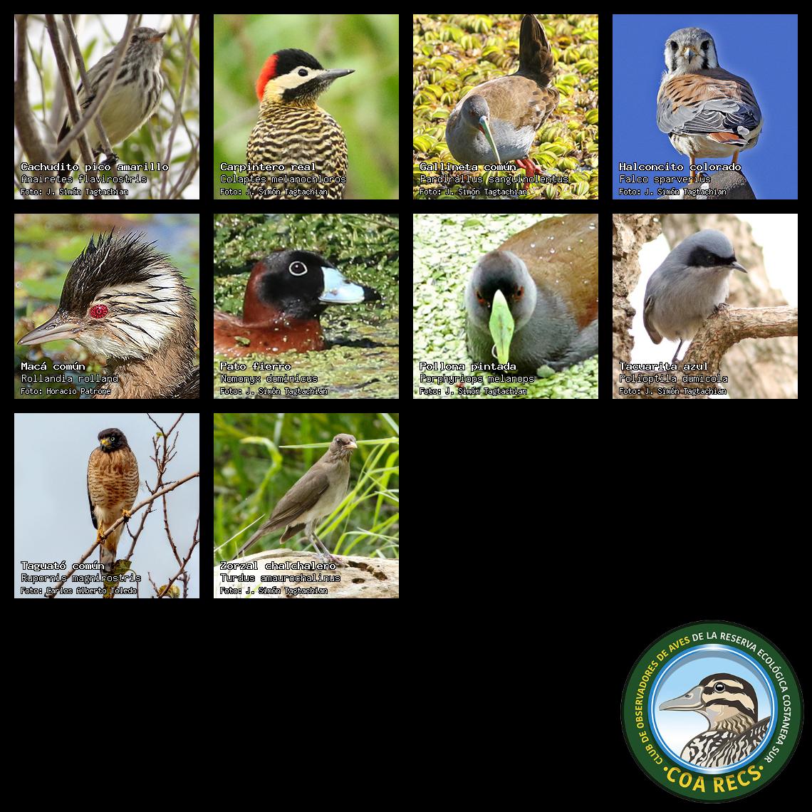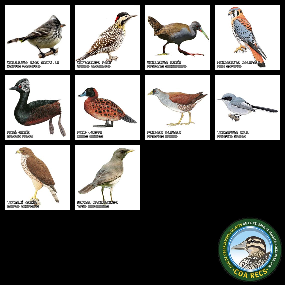 (Gavilán mixto, Carancho, Chimango, Benteveo común, Hornero, Carpintero real y Estornino pinto)