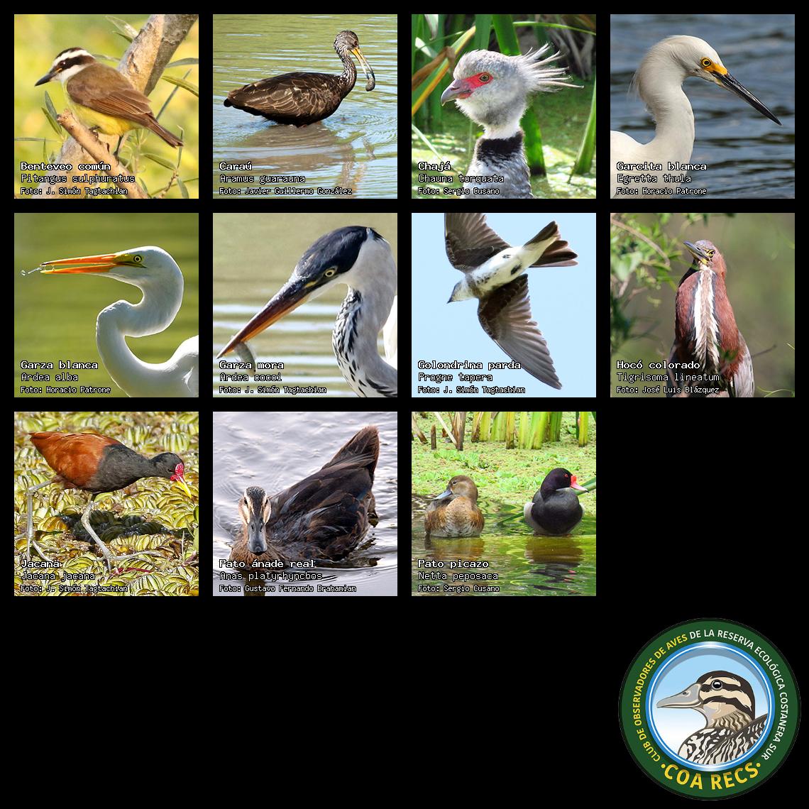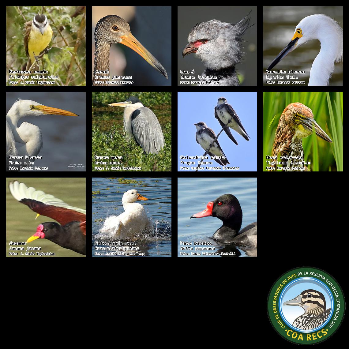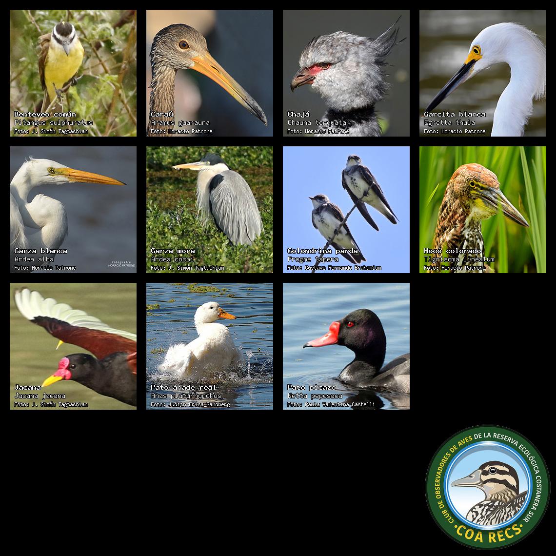 (Gavilán mixto, Carancho, Chimango, Benteveo común, Hornero, Carpintero real y Estornino pinto)