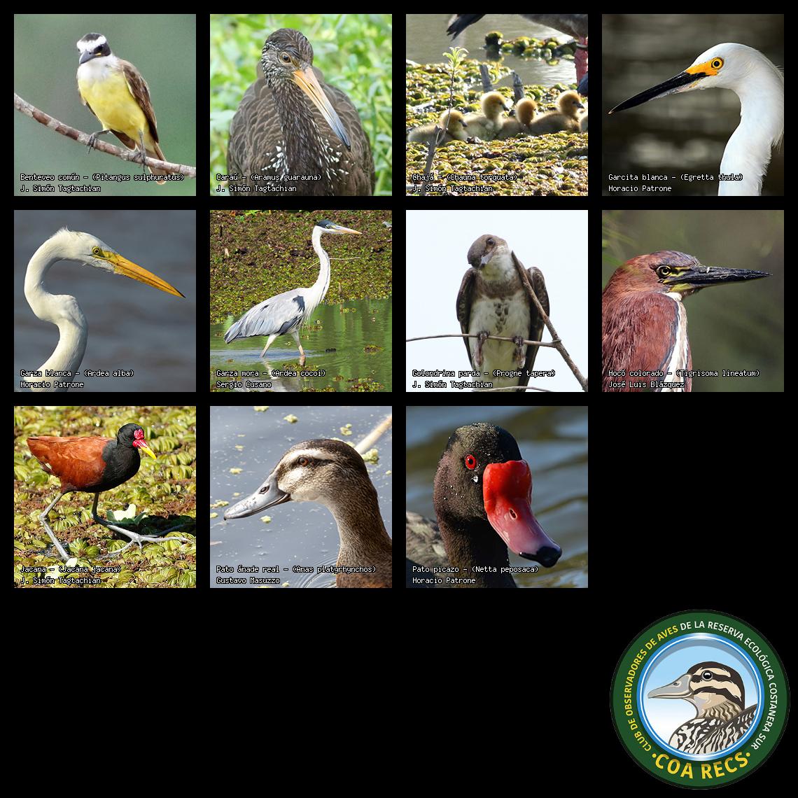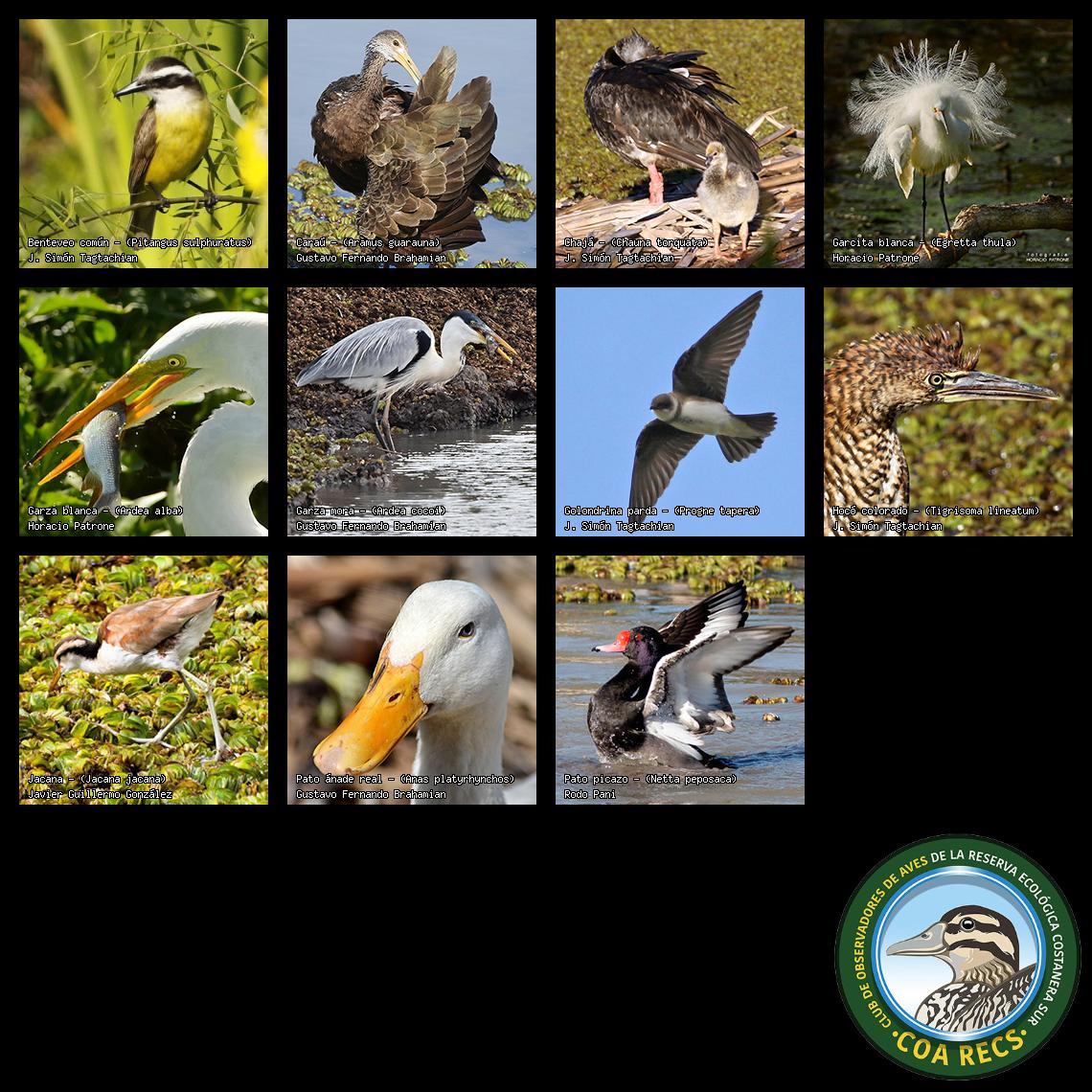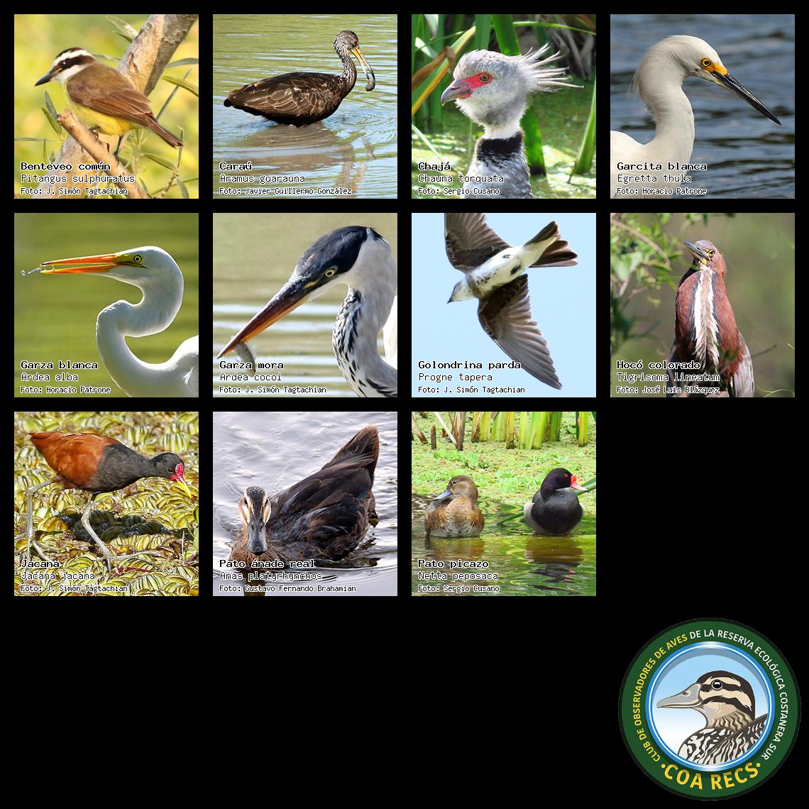 (Gavilán mixto, Carancho, Chimango, Benteveo común, Hornero, Carpintero real y Estornino pinto)