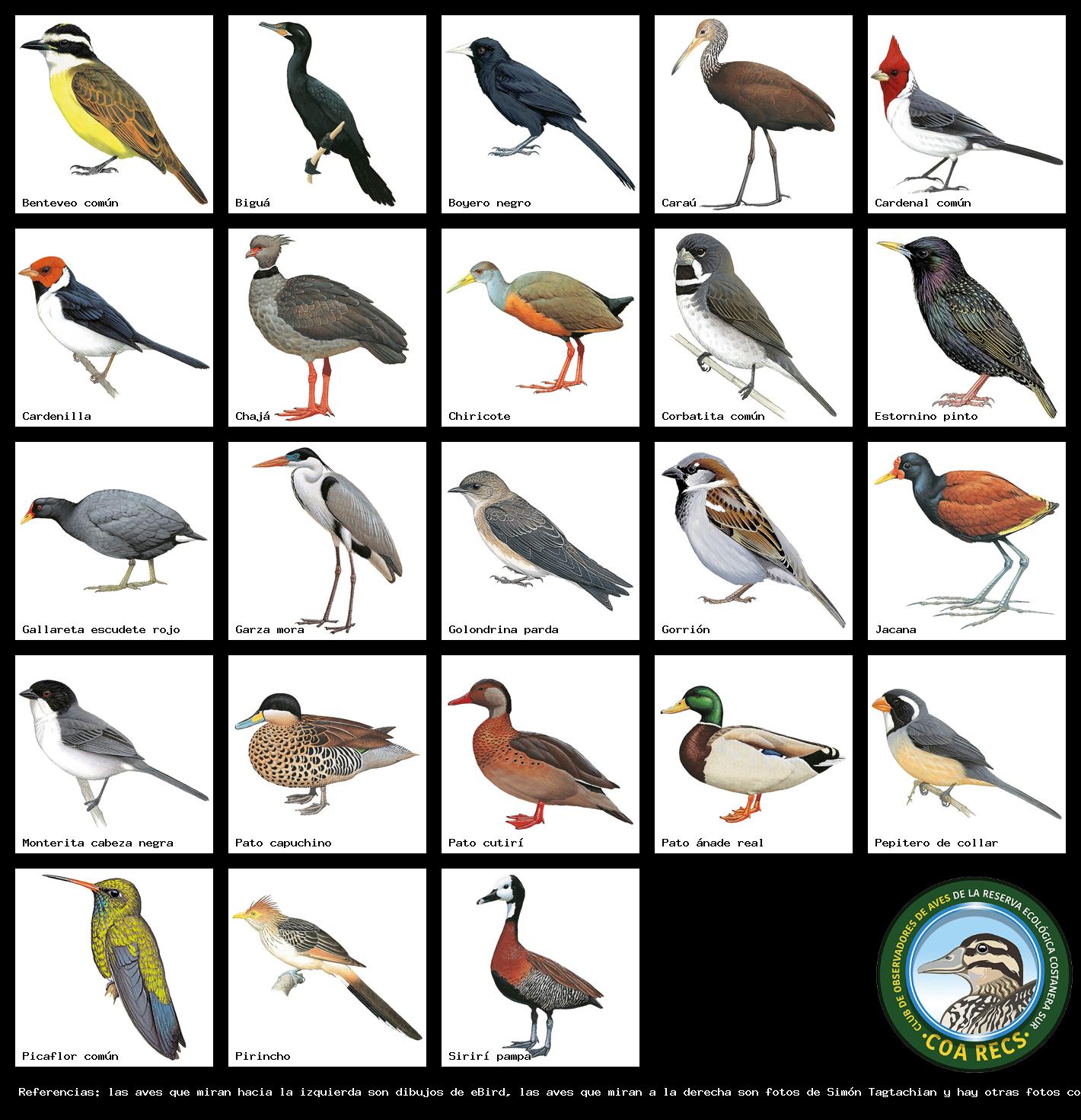 (Gavilán mixto, Carancho, Chimango, Benteveo común, Hornero, Carpintero real y Estornino pinto)