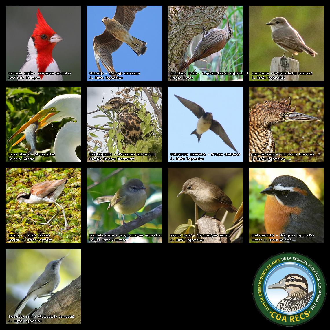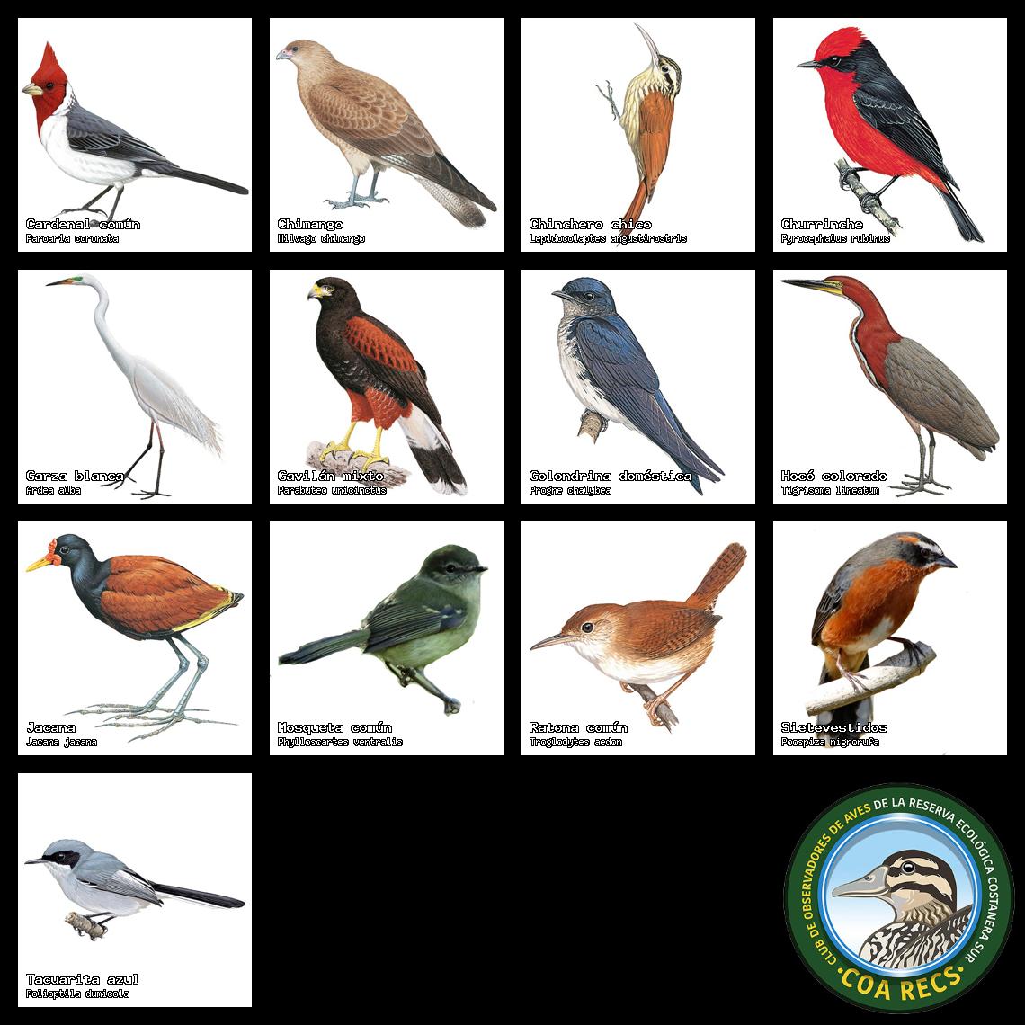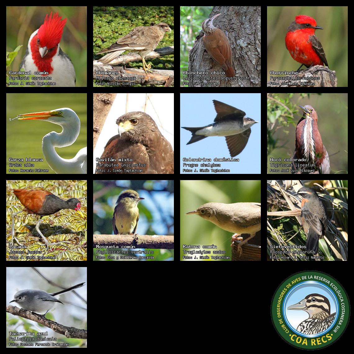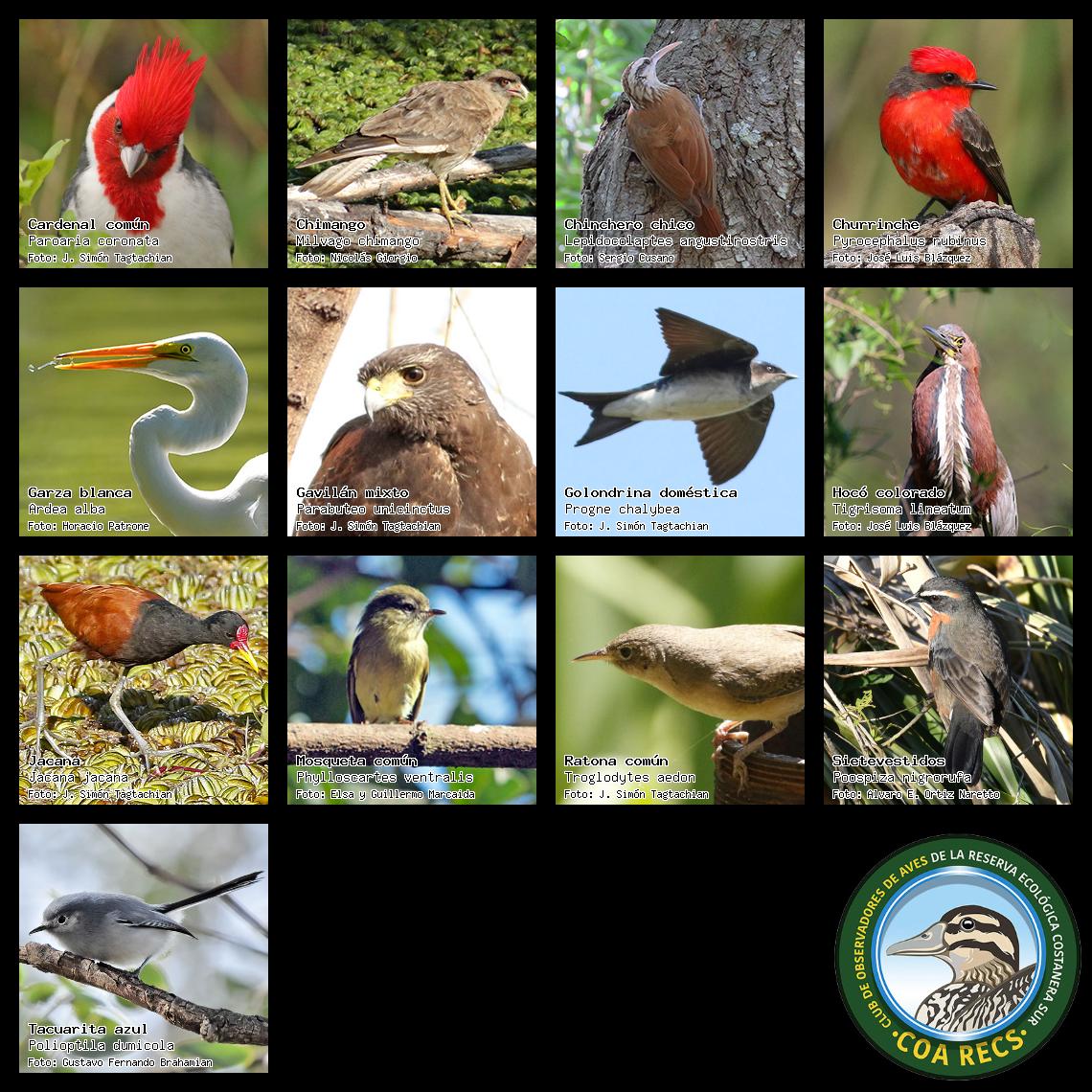 (Gavilán mixto, Carancho, Chimango, Benteveo común, Hornero, Carpintero real y Estornino pinto)