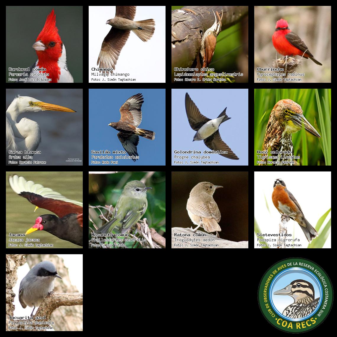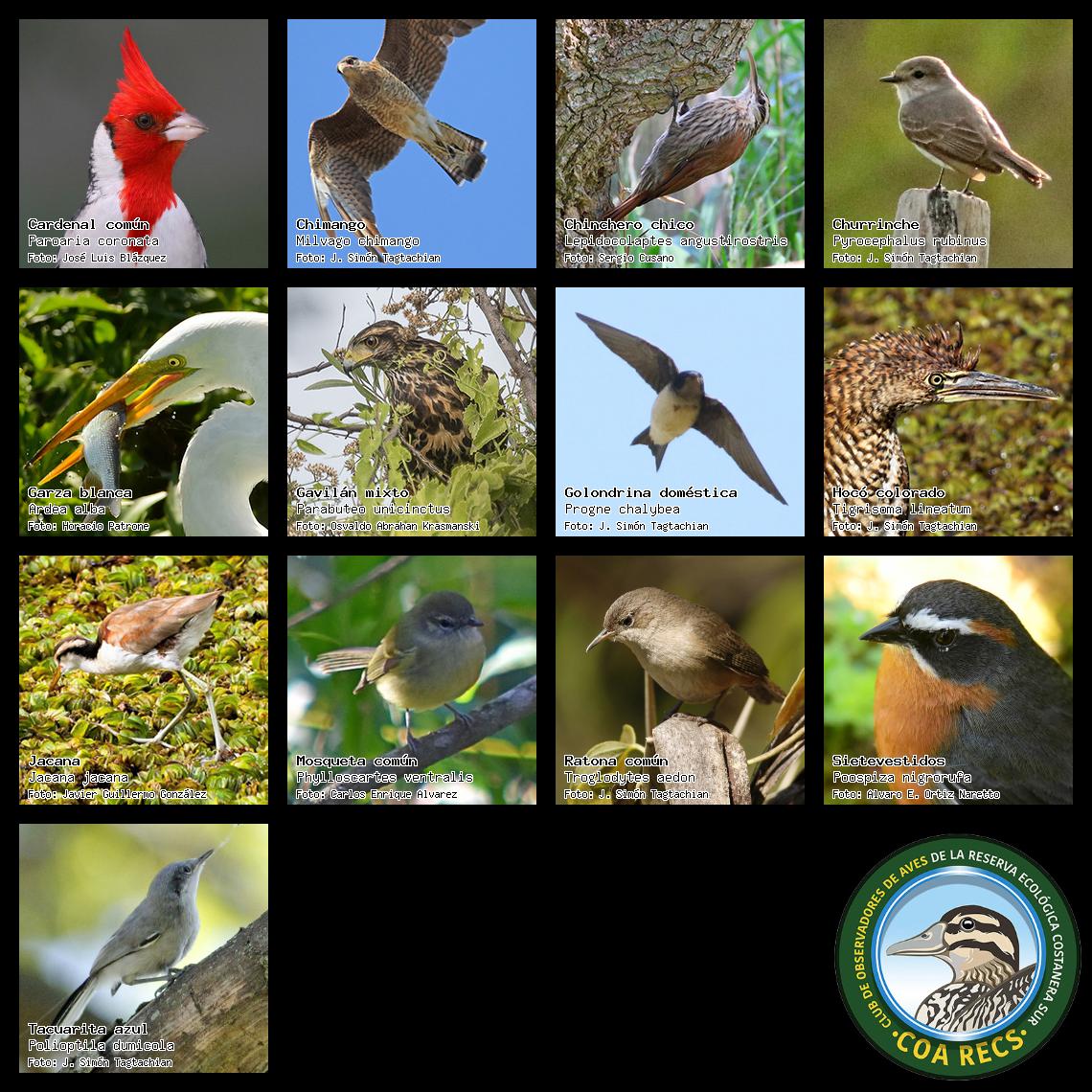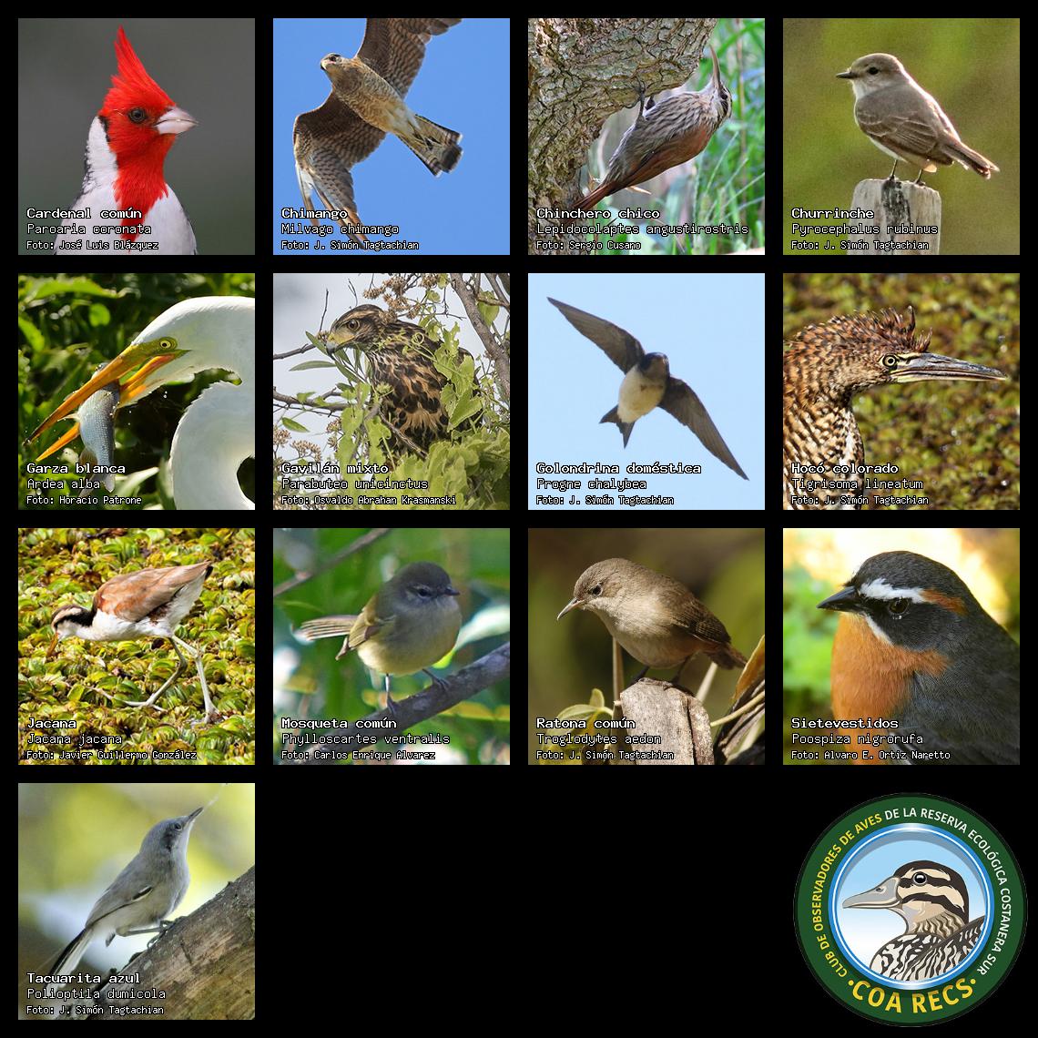 (Gavilán mixto, Carancho, Chimango, Benteveo común, Hornero, Carpintero real y Estornino pinto)