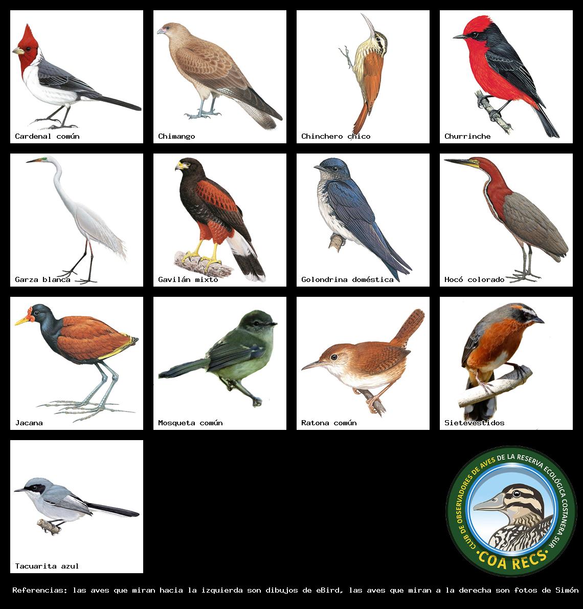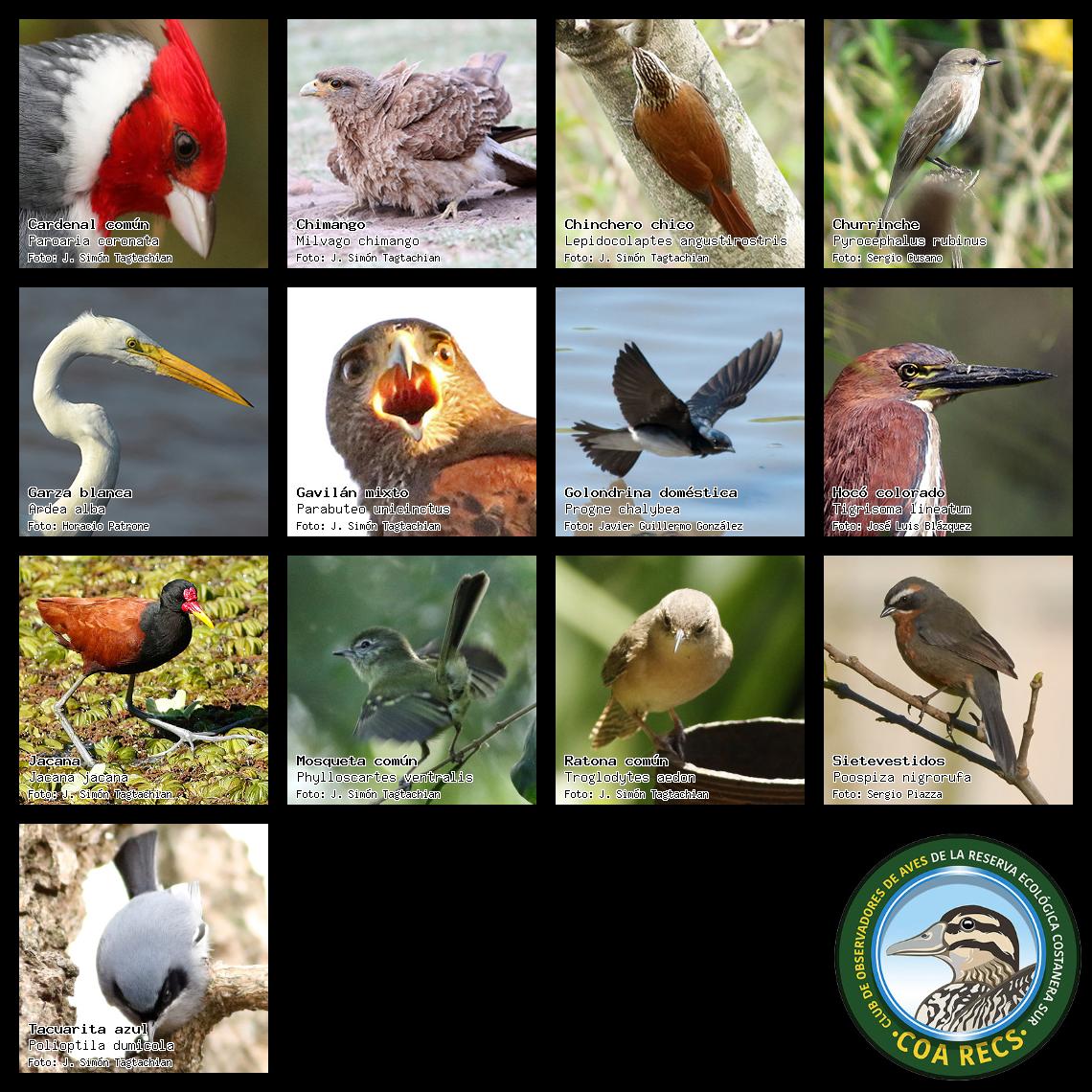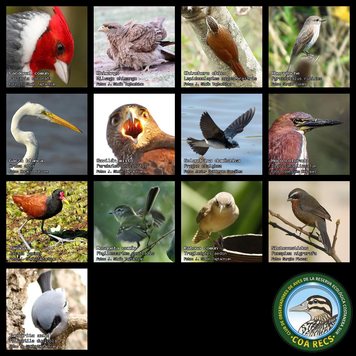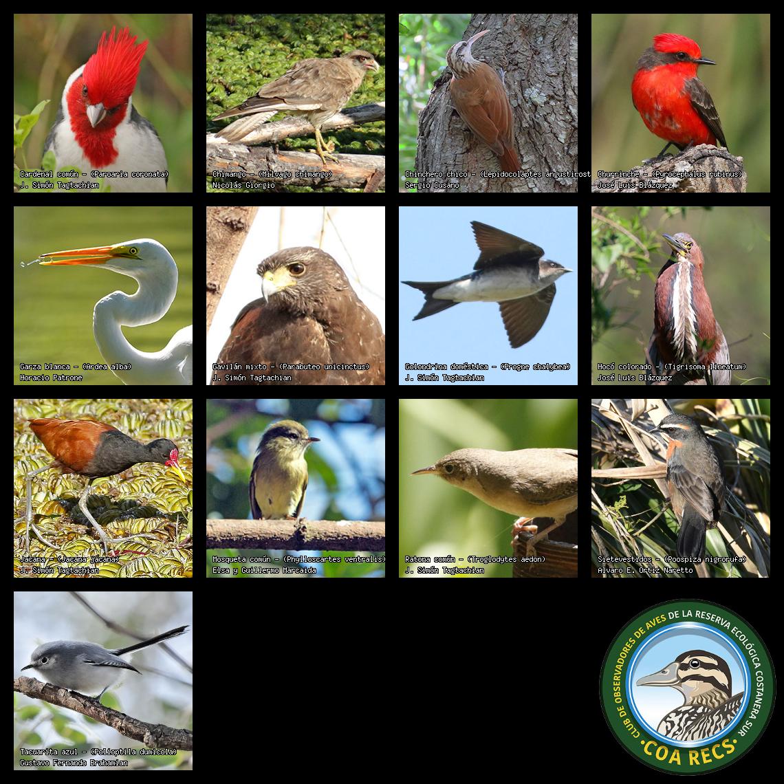 (Gavilán mixto, Carancho, Chimango, Benteveo común, Hornero, Carpintero real y Estornino pinto)