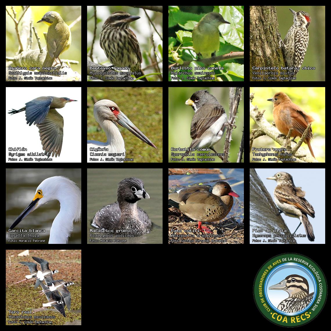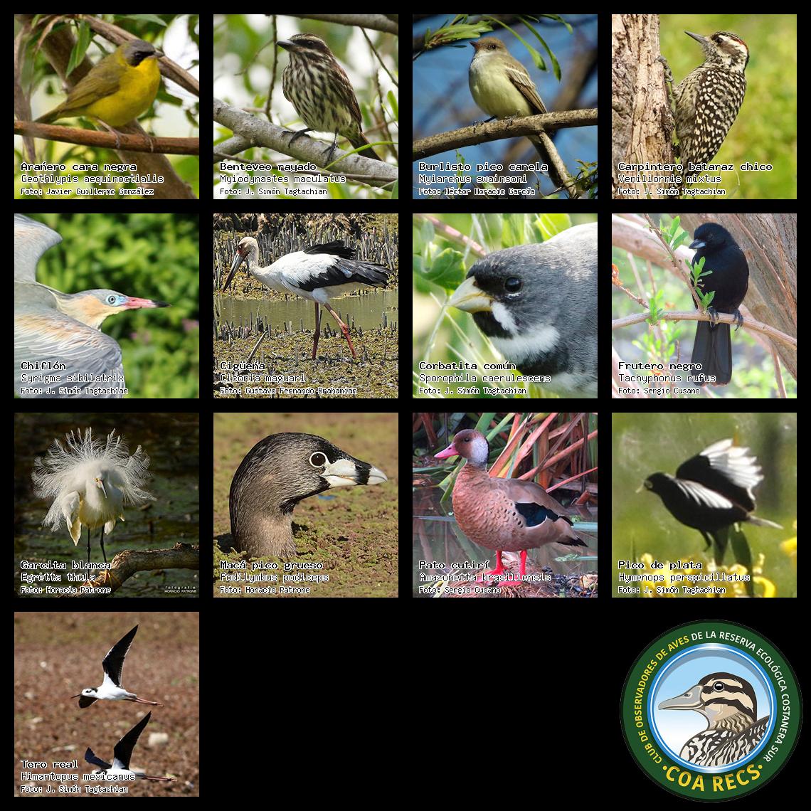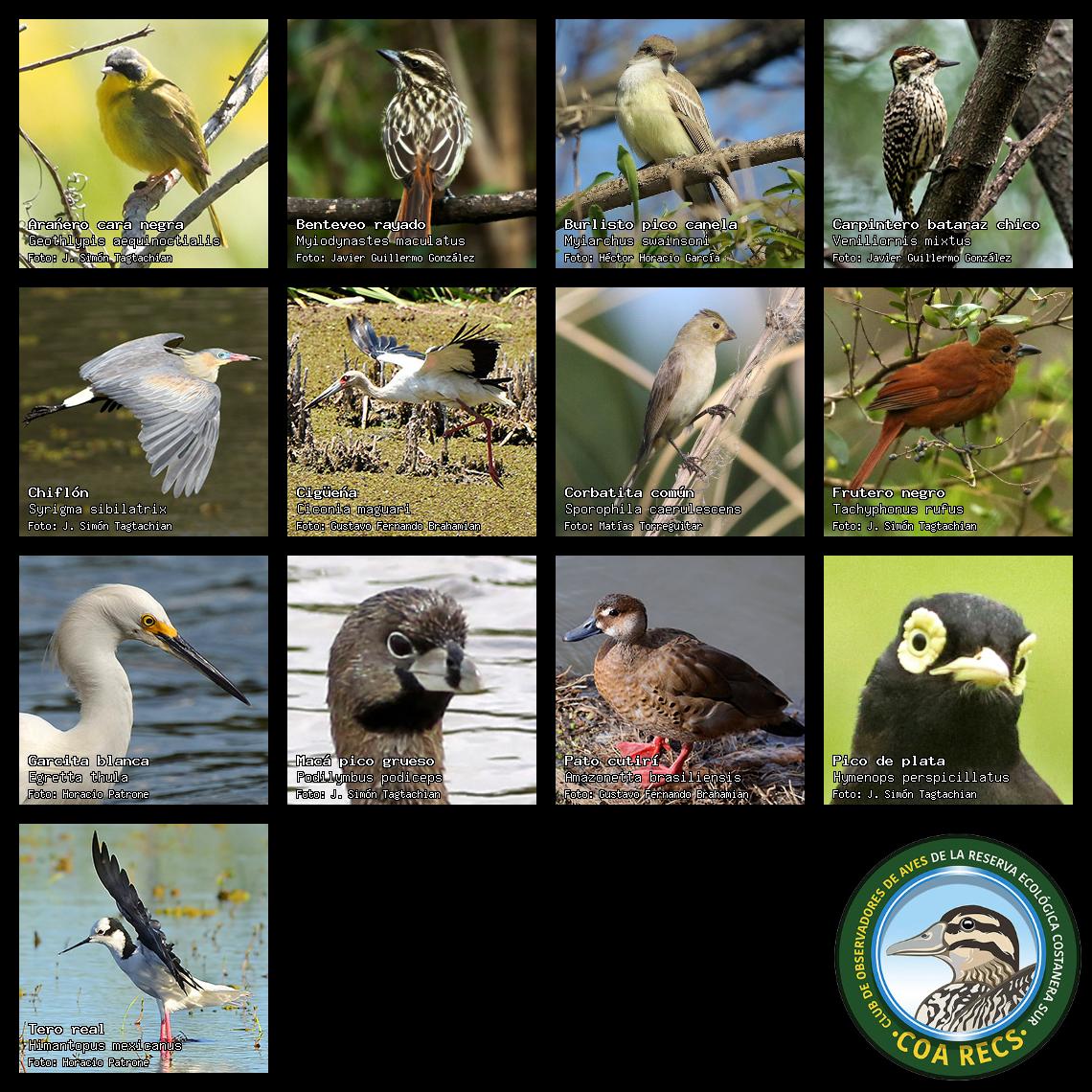 (Gavilán mixto, Carancho, Chimango, Benteveo común, Hornero, Carpintero real y Estornino pinto)