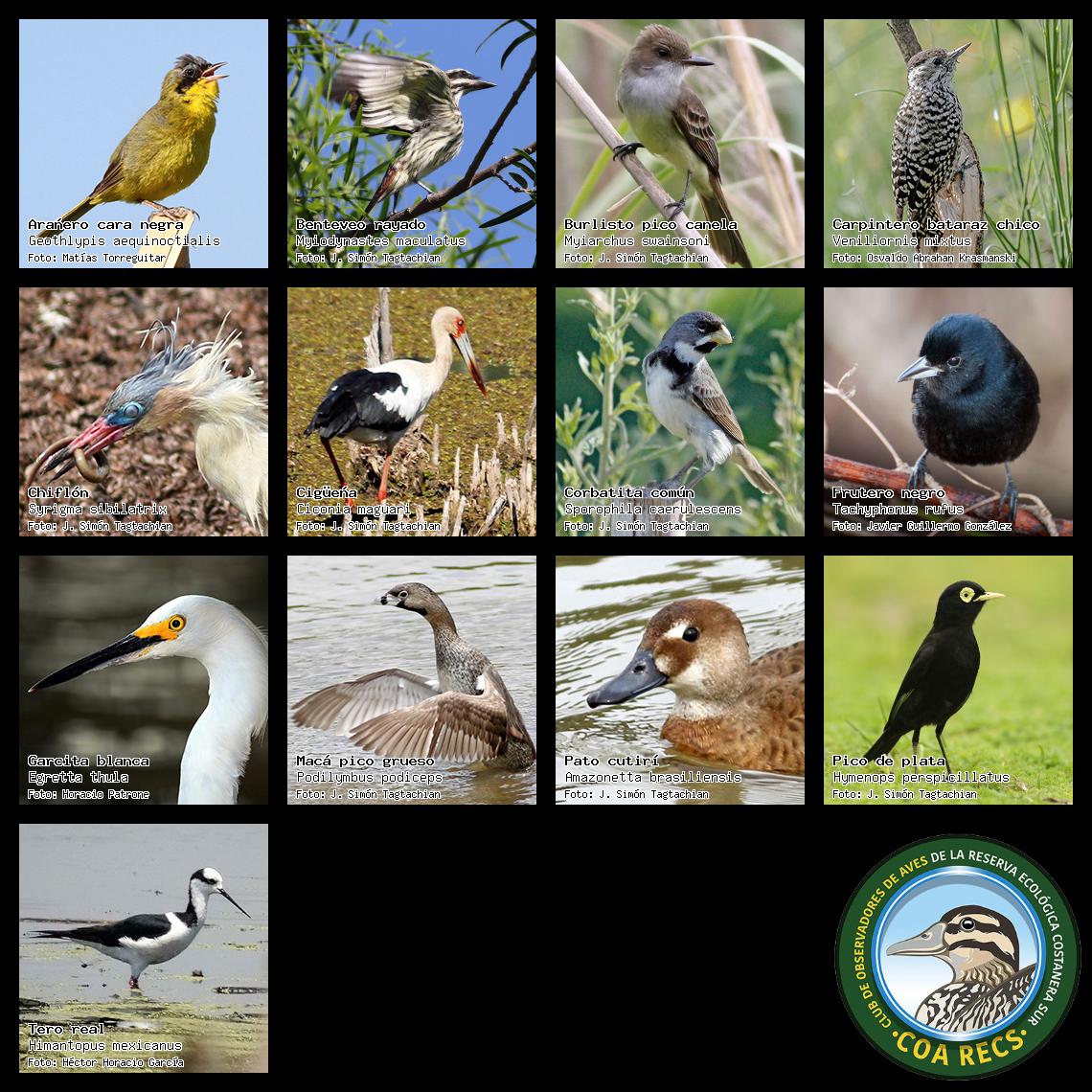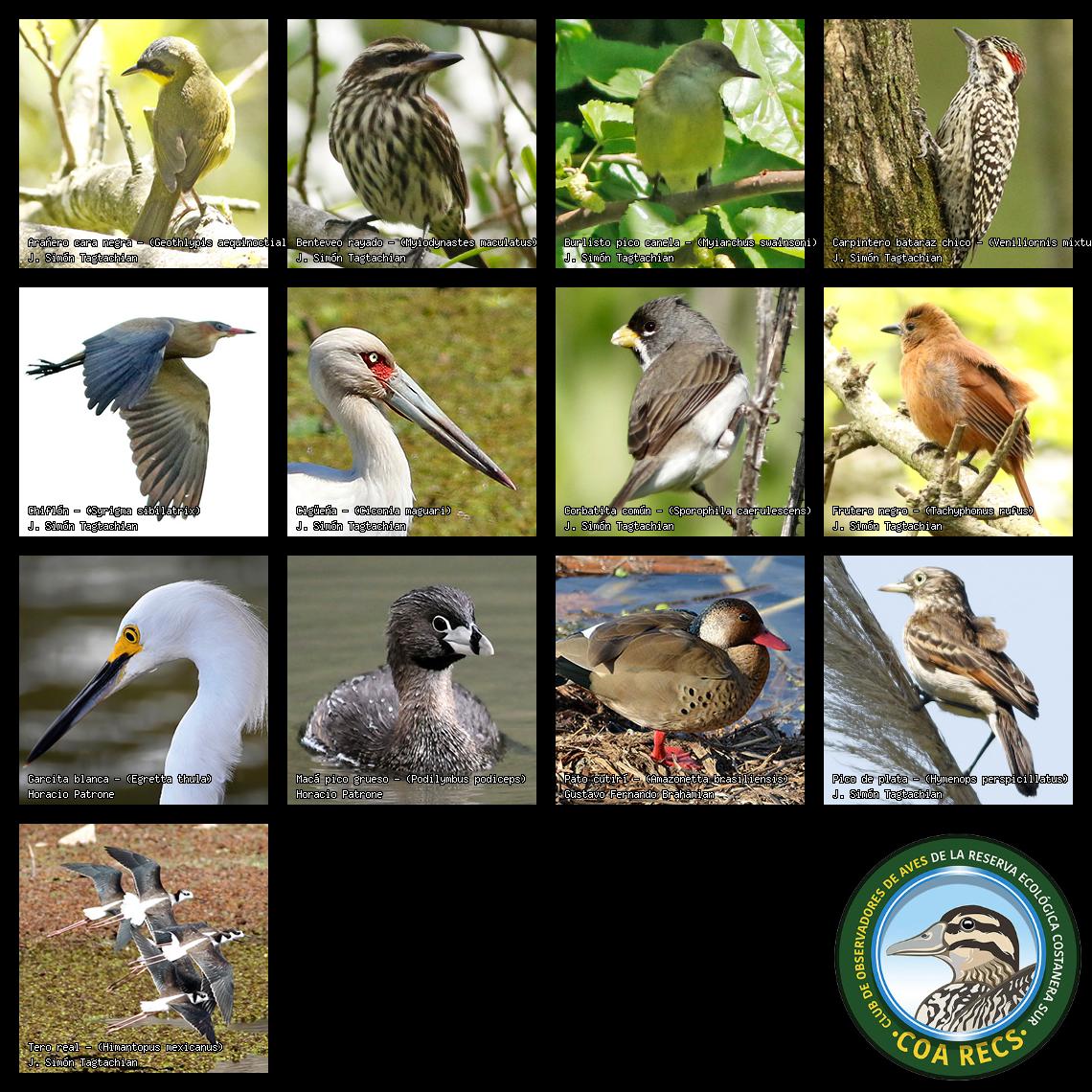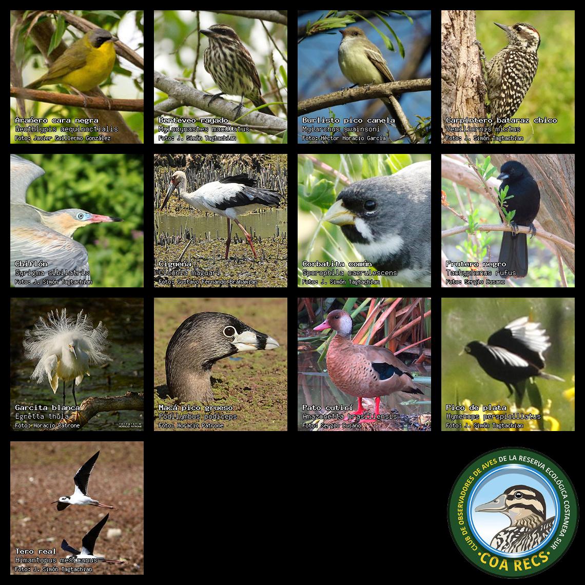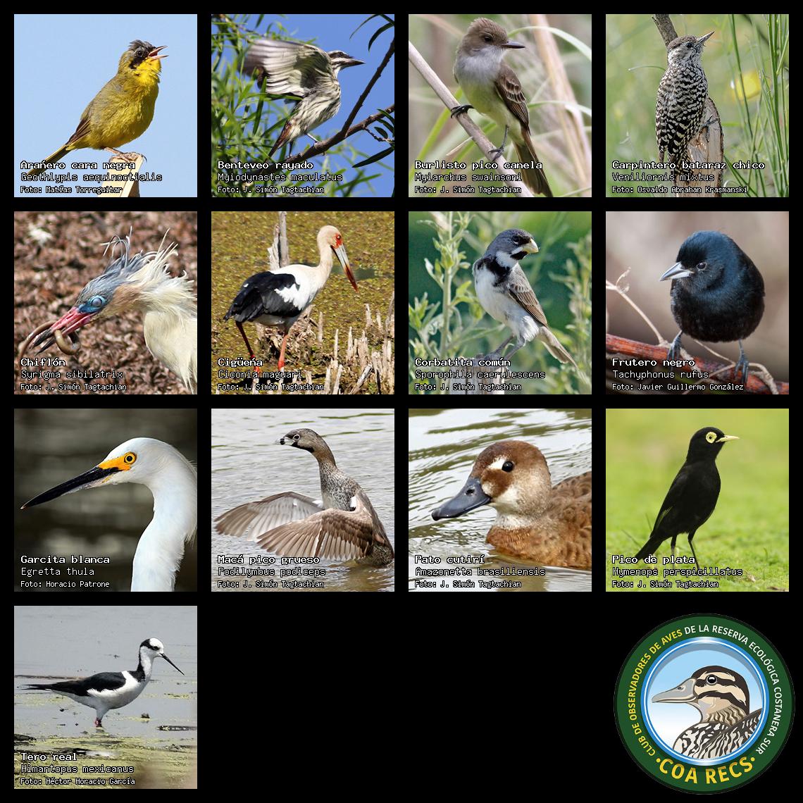 (Gavilán mixto, Carancho, Chimango, Benteveo común, Hornero, Carpintero real y Estornino pinto)