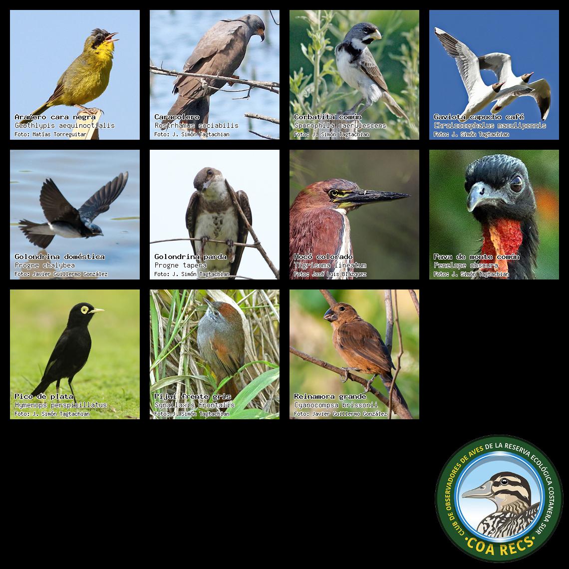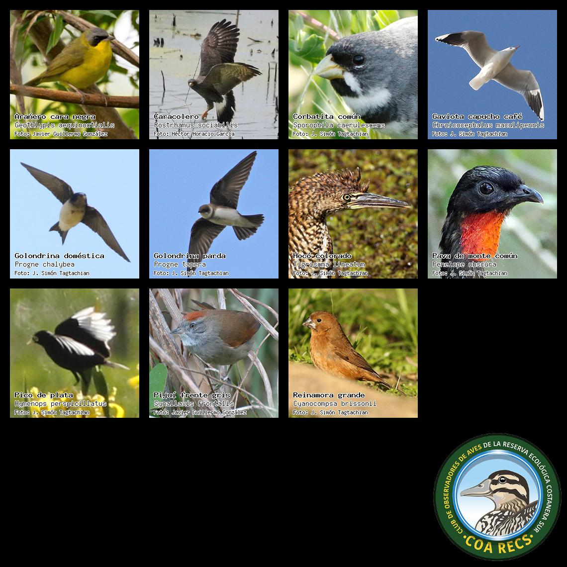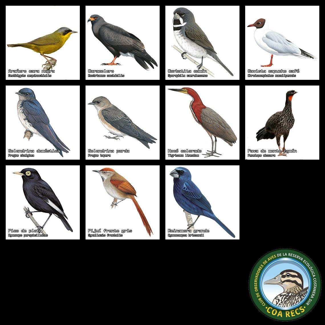(Gavilán mixto, Carancho, Chimango, Benteveo común, Hornero, Carpintero real y Estornino pinto)