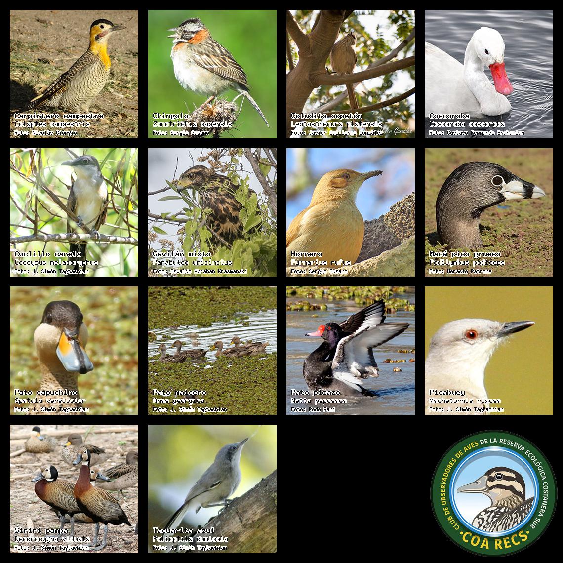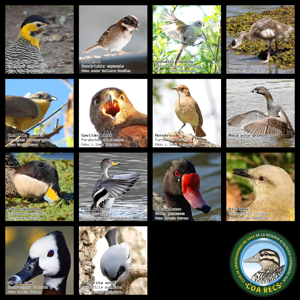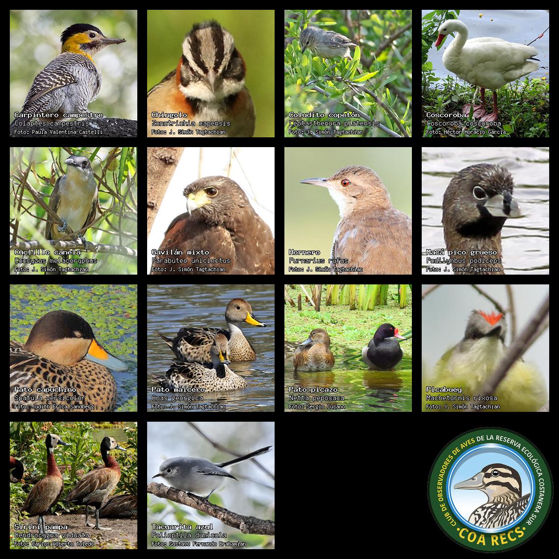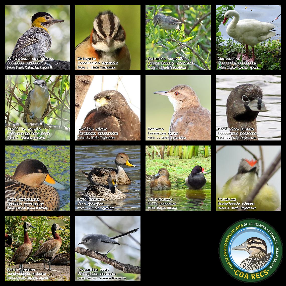(Gavilán mixto, Carancho, Chimango, Benteveo común, Hornero, Carpintero real y Estornino pinto)