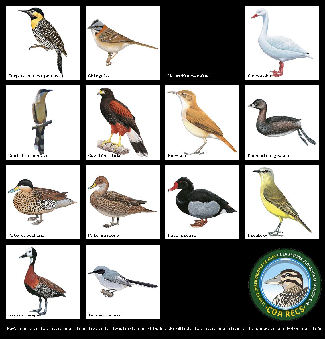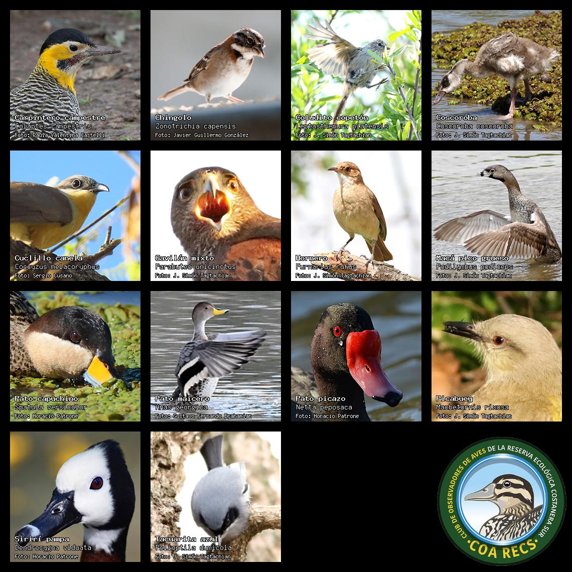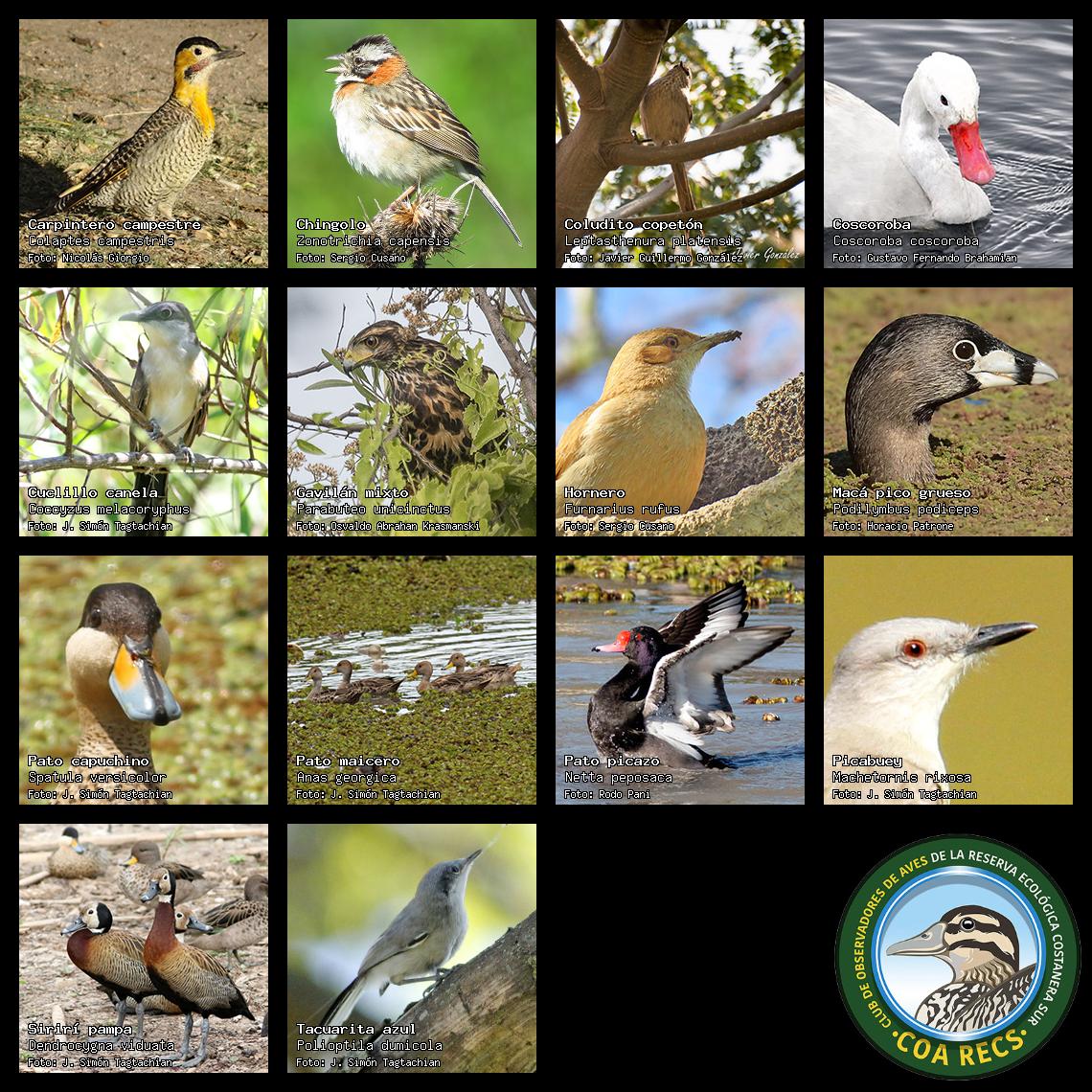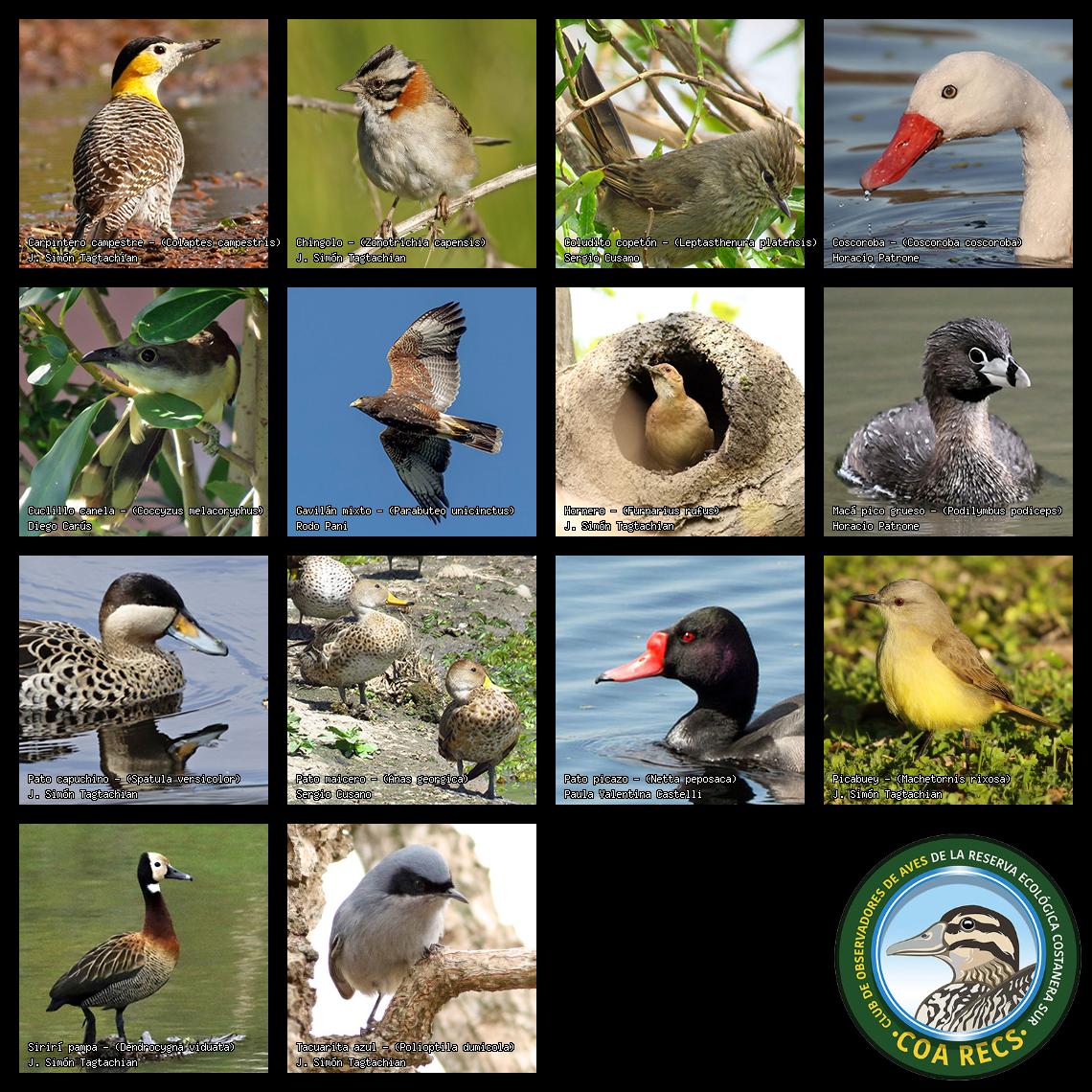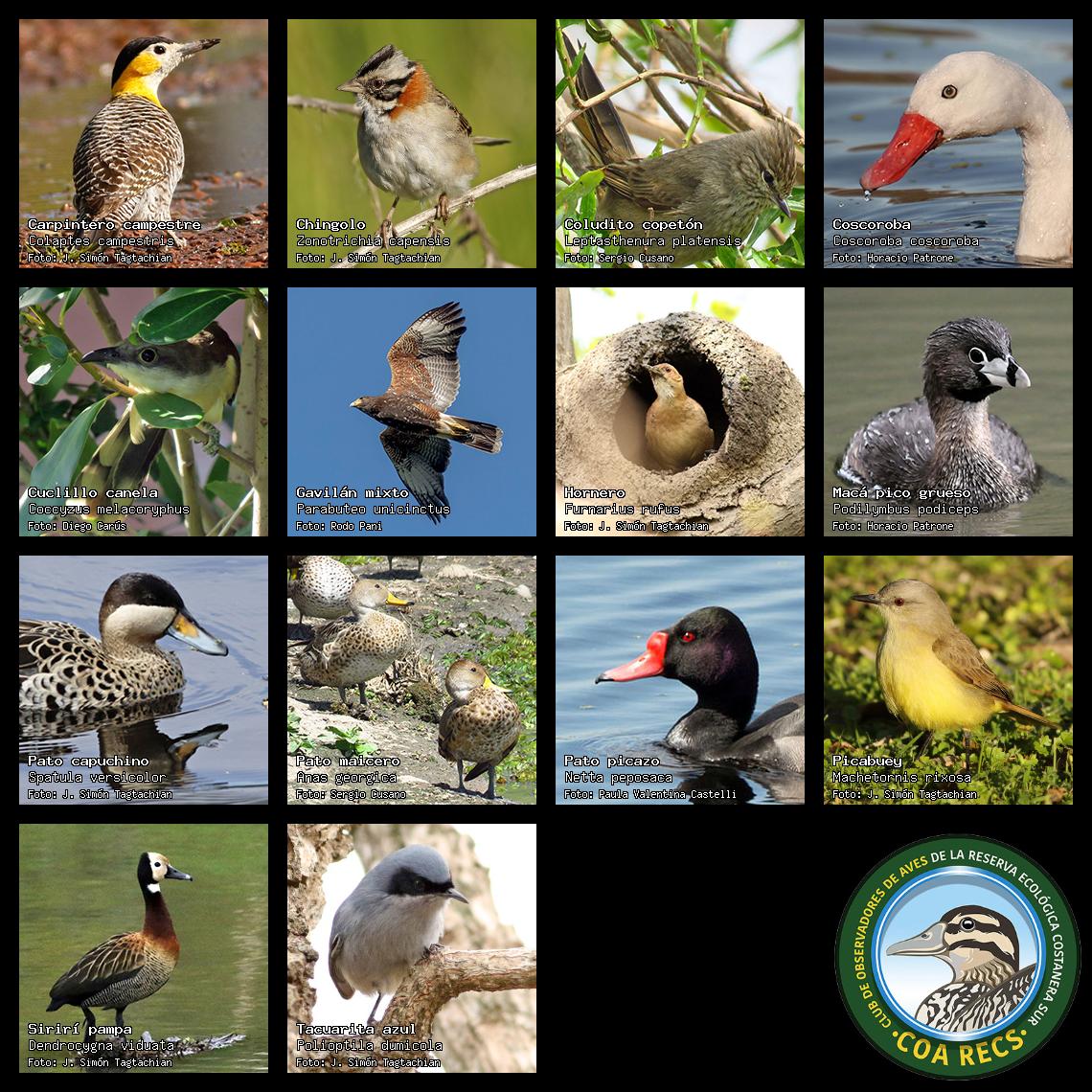 (Gavilán mixto, Carancho, Chimango, Benteveo común, Hornero, Carpintero real y Estornino pinto)