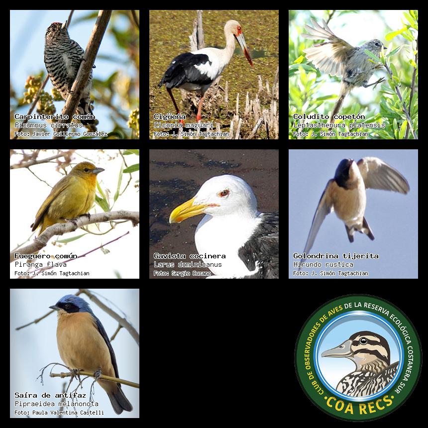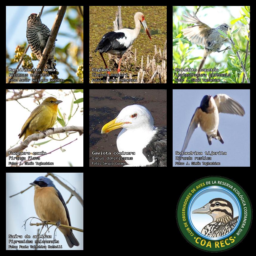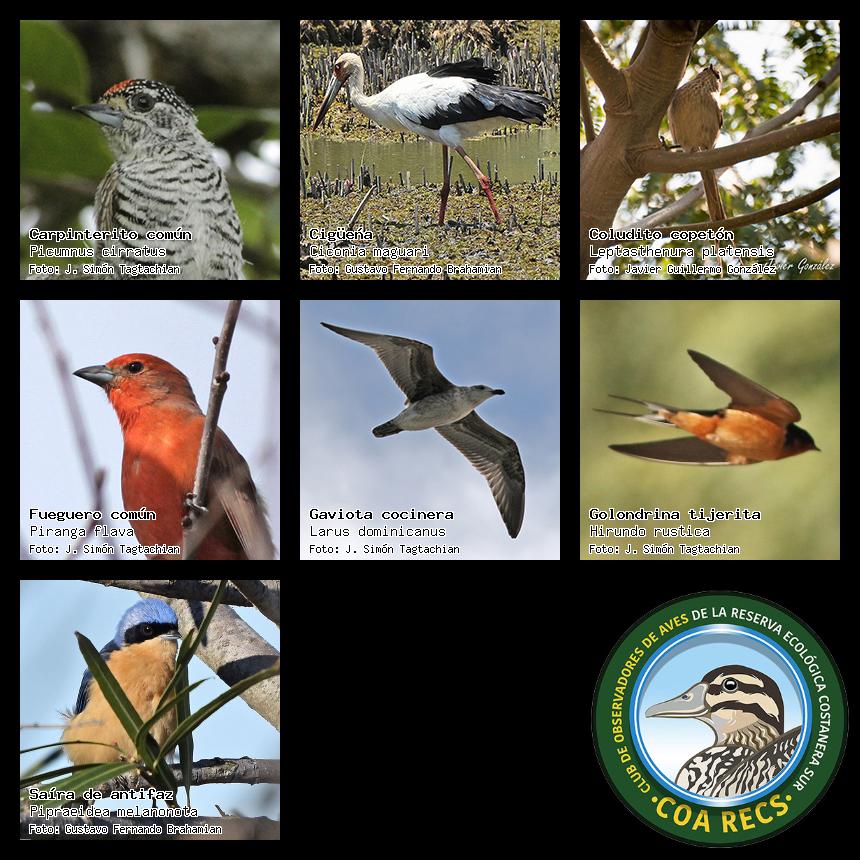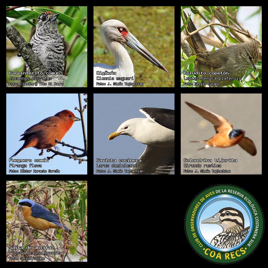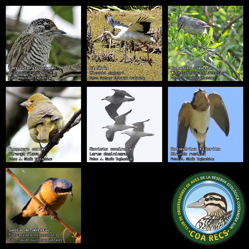 (Gavilán mixto, Carancho, Chimango, Benteveo común, Hornero, Carpintero real y Estornino pinto)