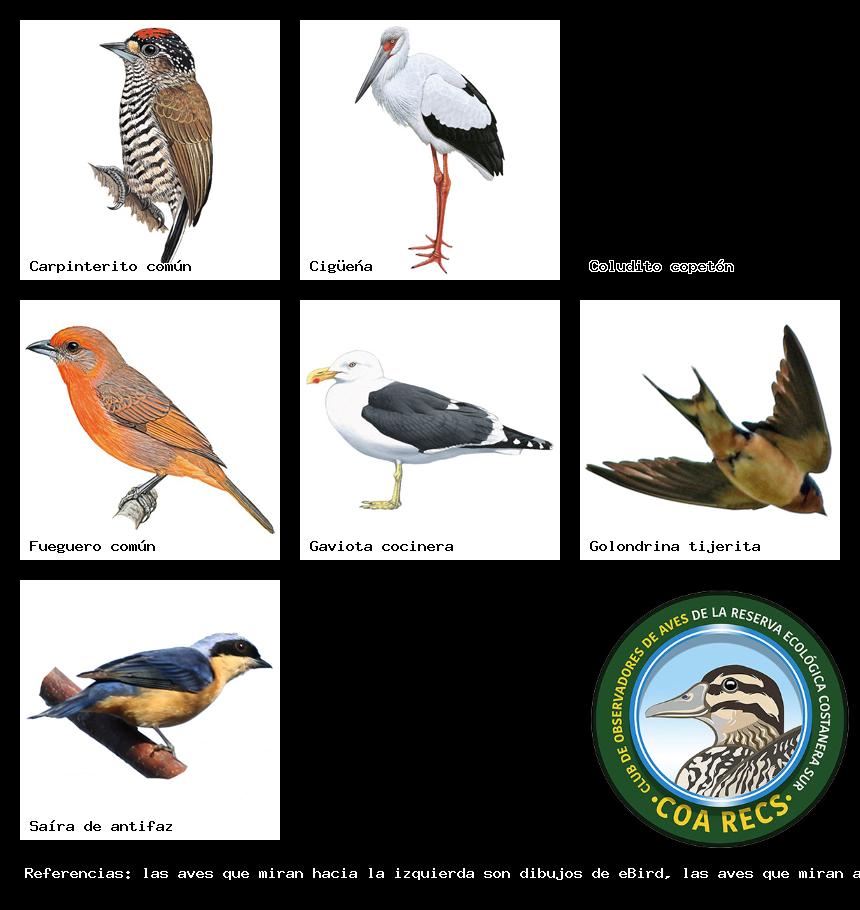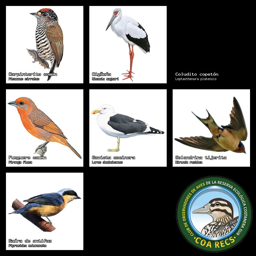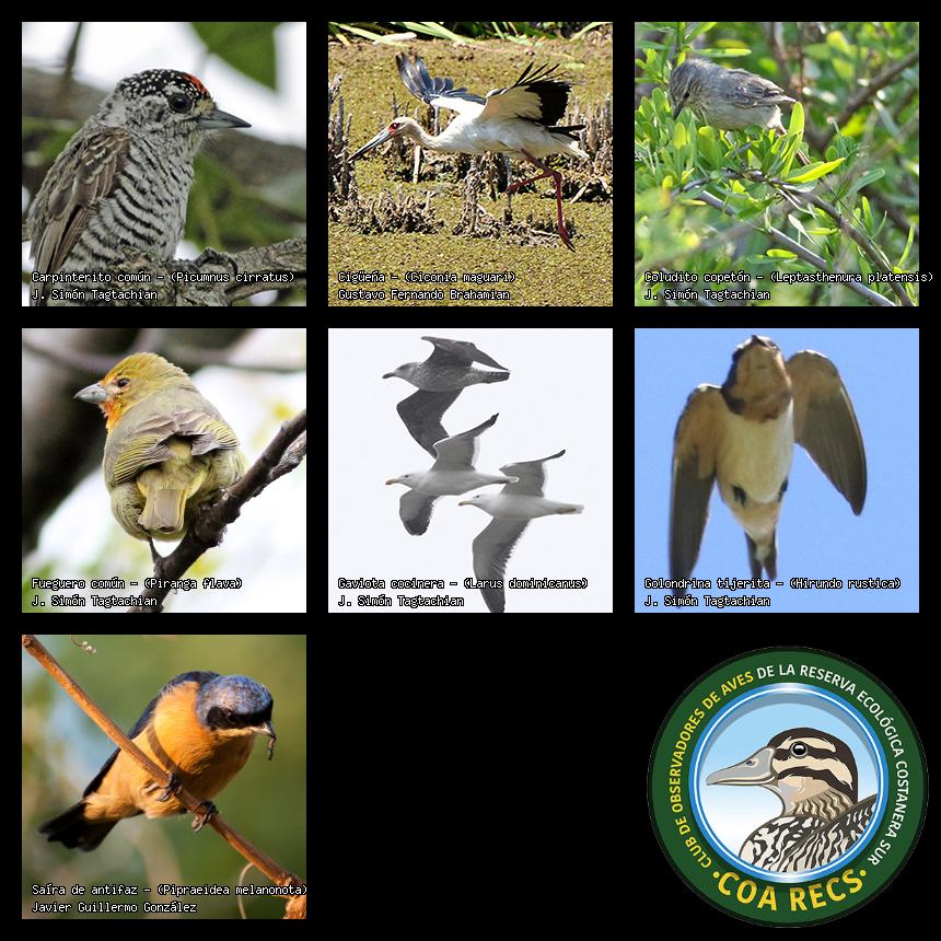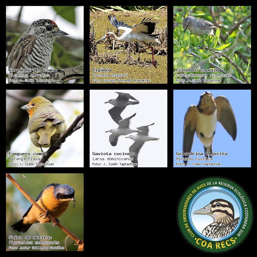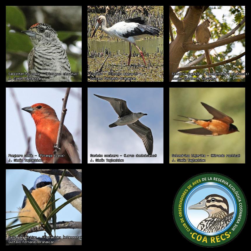 (Gavilán mixto, Carancho, Chimango, Benteveo común, Hornero, Carpintero real y Estornino pinto)