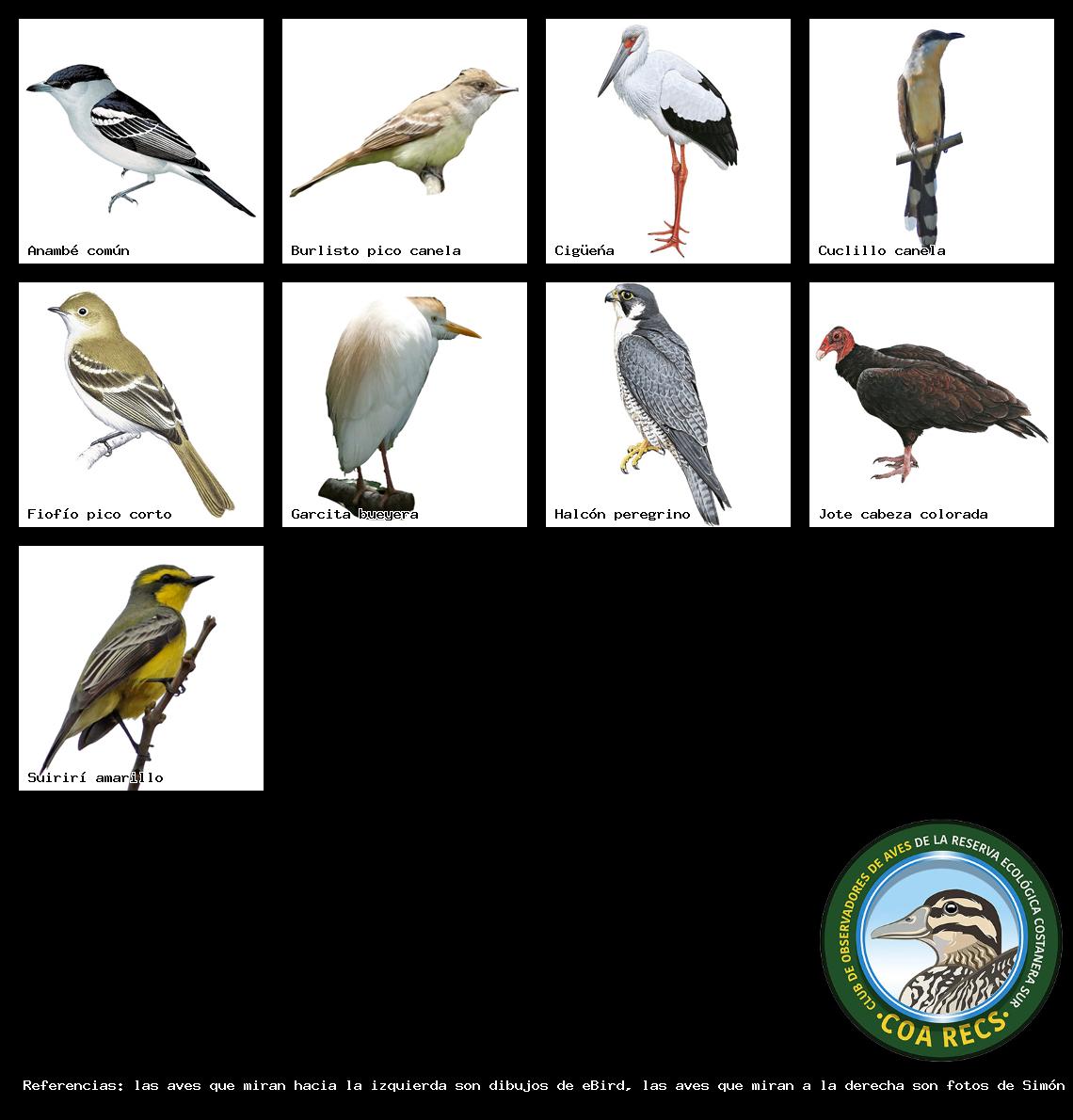 (Gavilán mixto, Carancho, Chimango, Benteveo común, Hornero, Carpintero real y Estornino pinto)