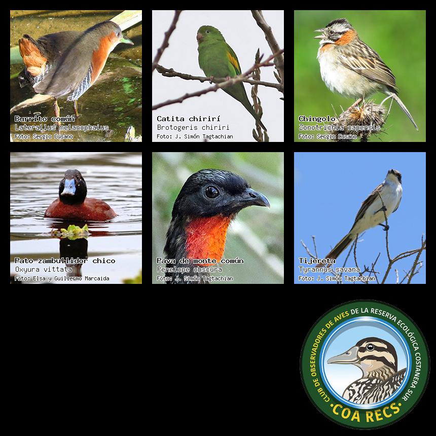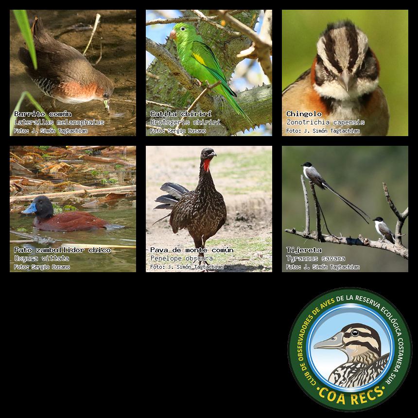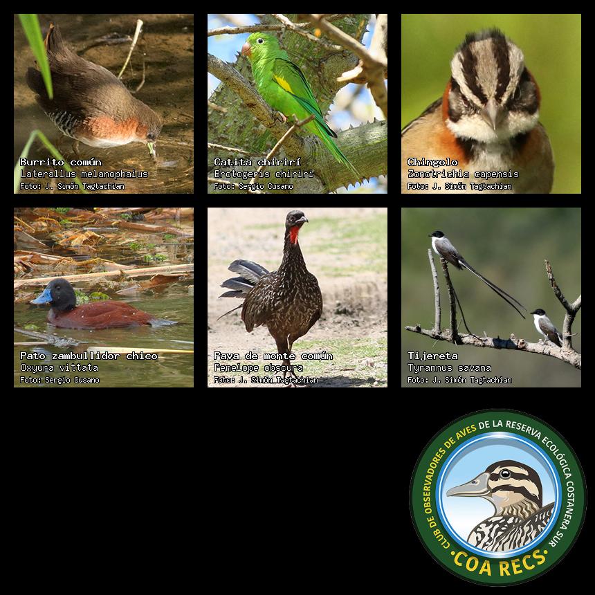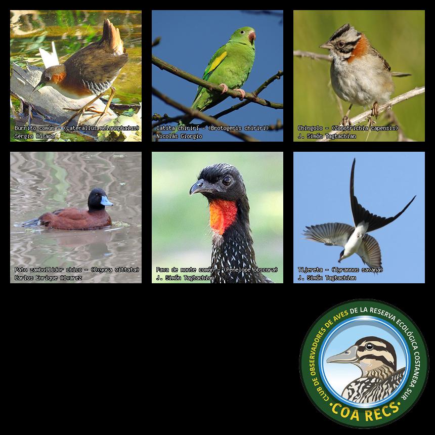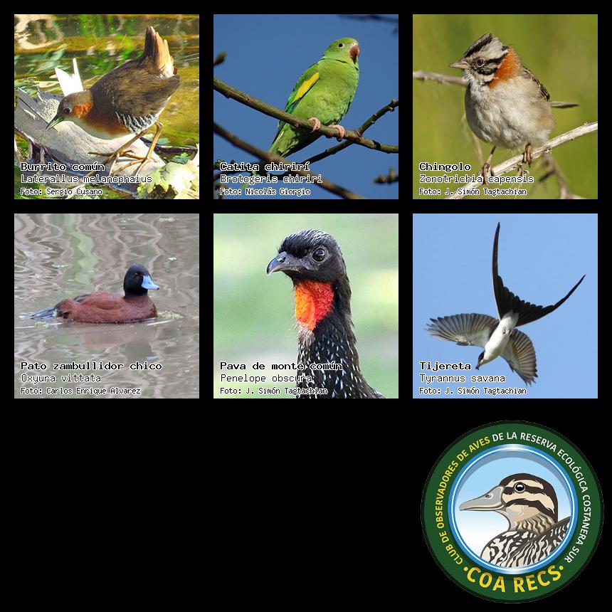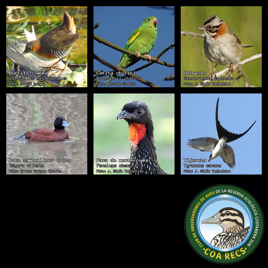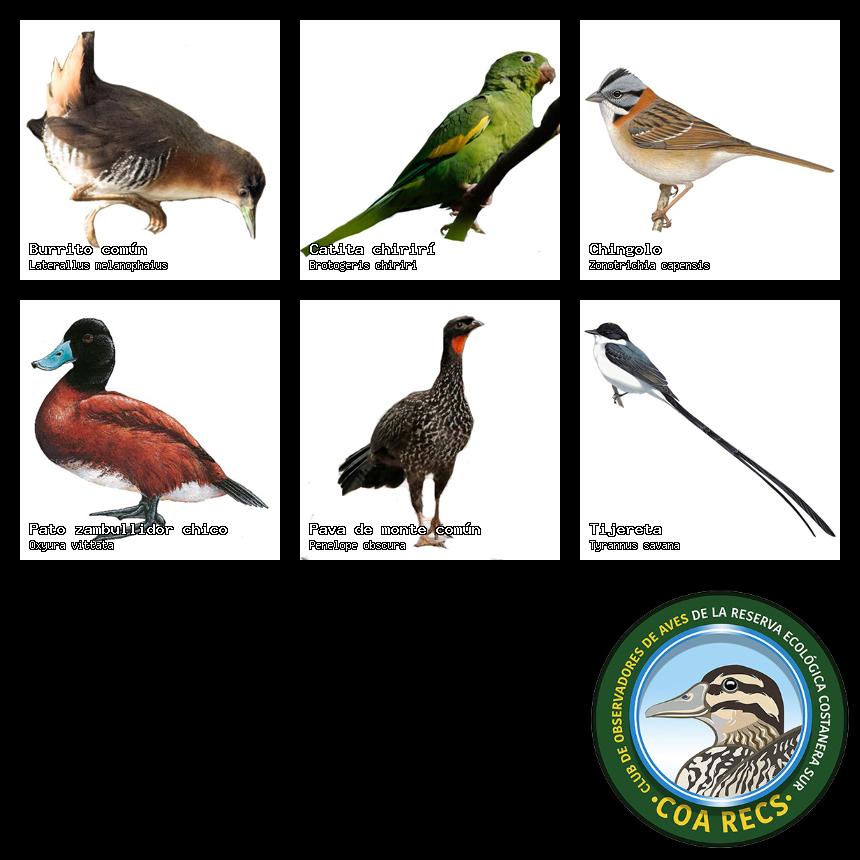 (Gavilán mixto, Carancho, Chimango, Benteveo común, Hornero, Carpintero real y Estornino pinto)