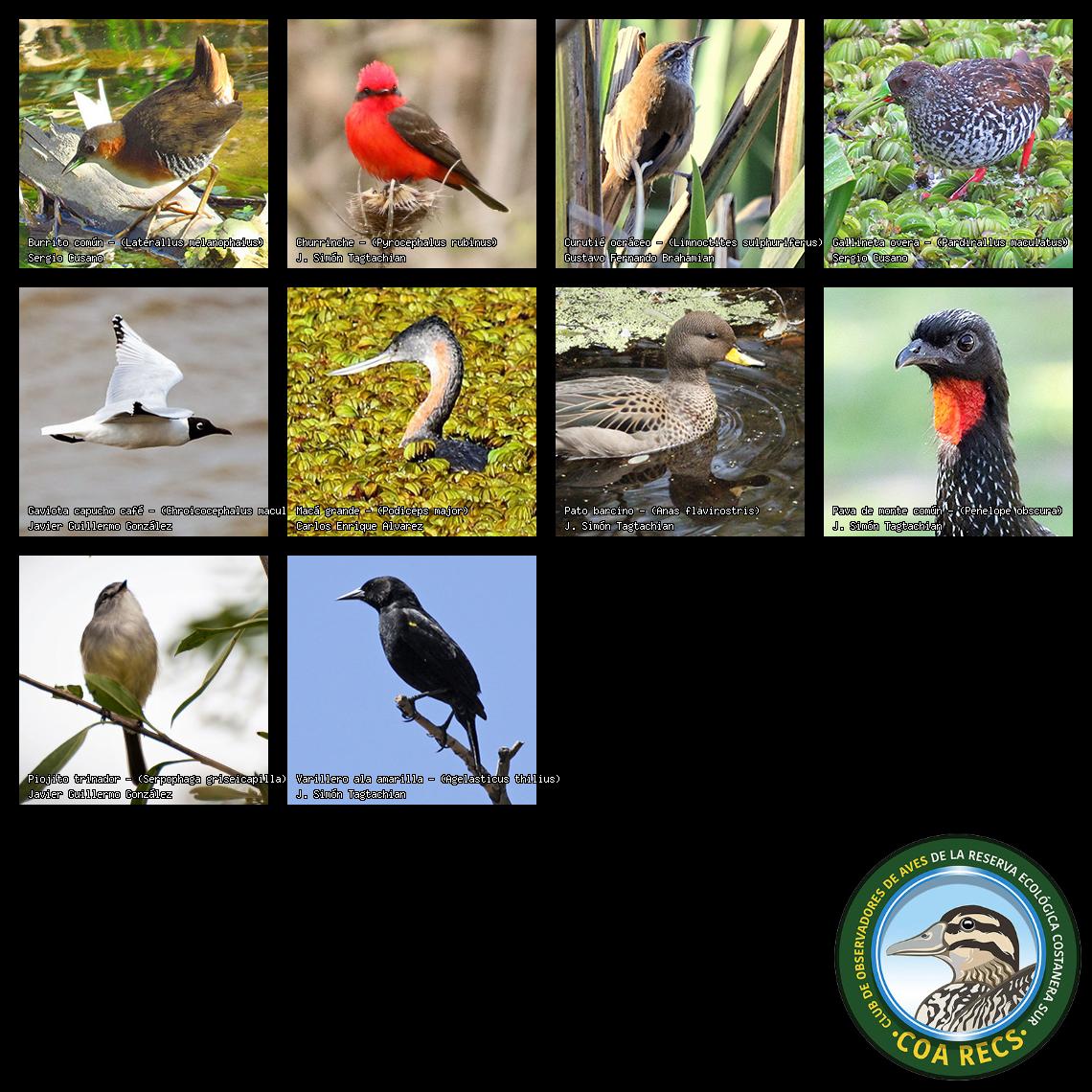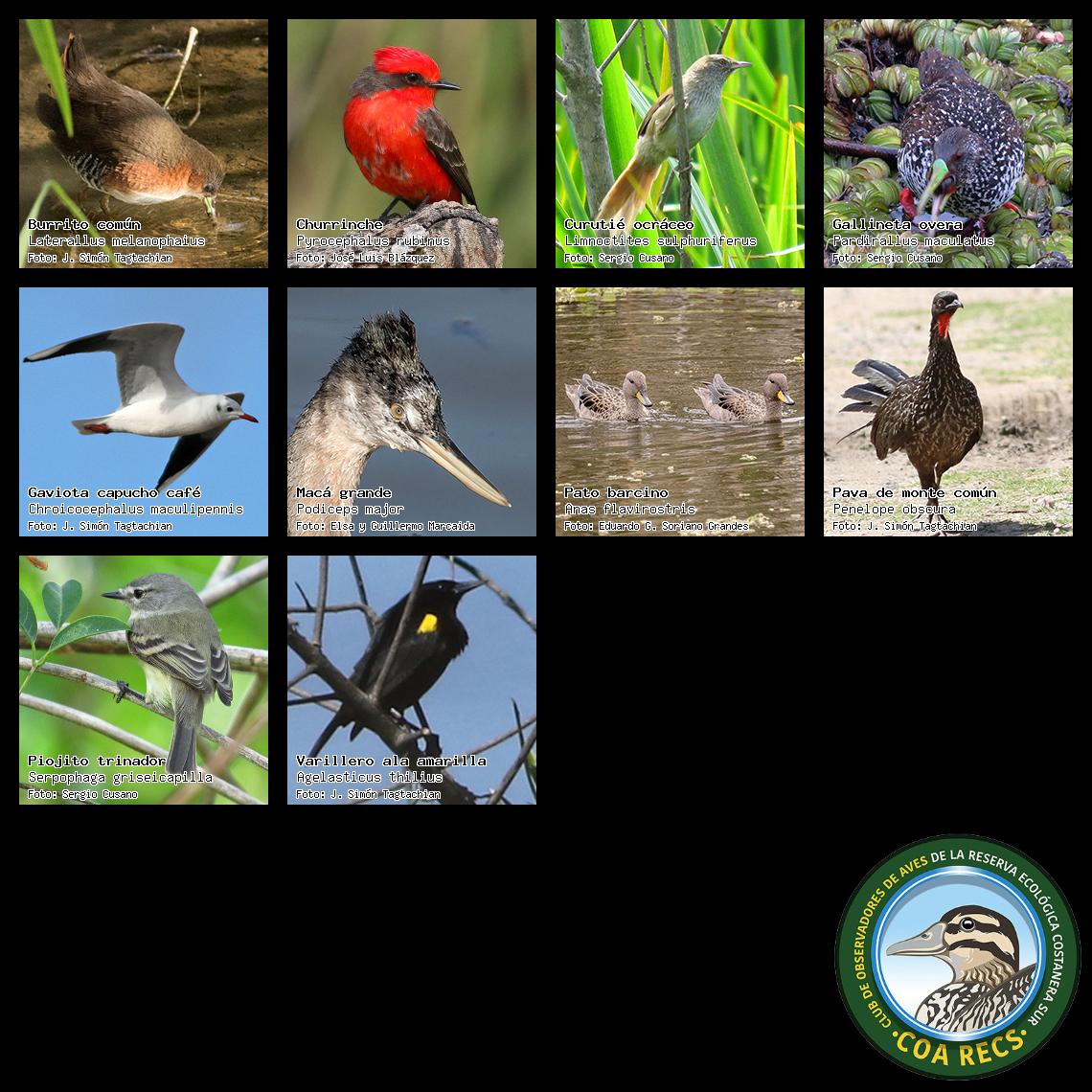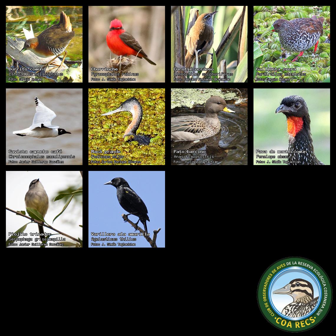 (Gavilán mixto, Carancho, Chimango, Benteveo común, Hornero, Carpintero real y Estornino pinto)