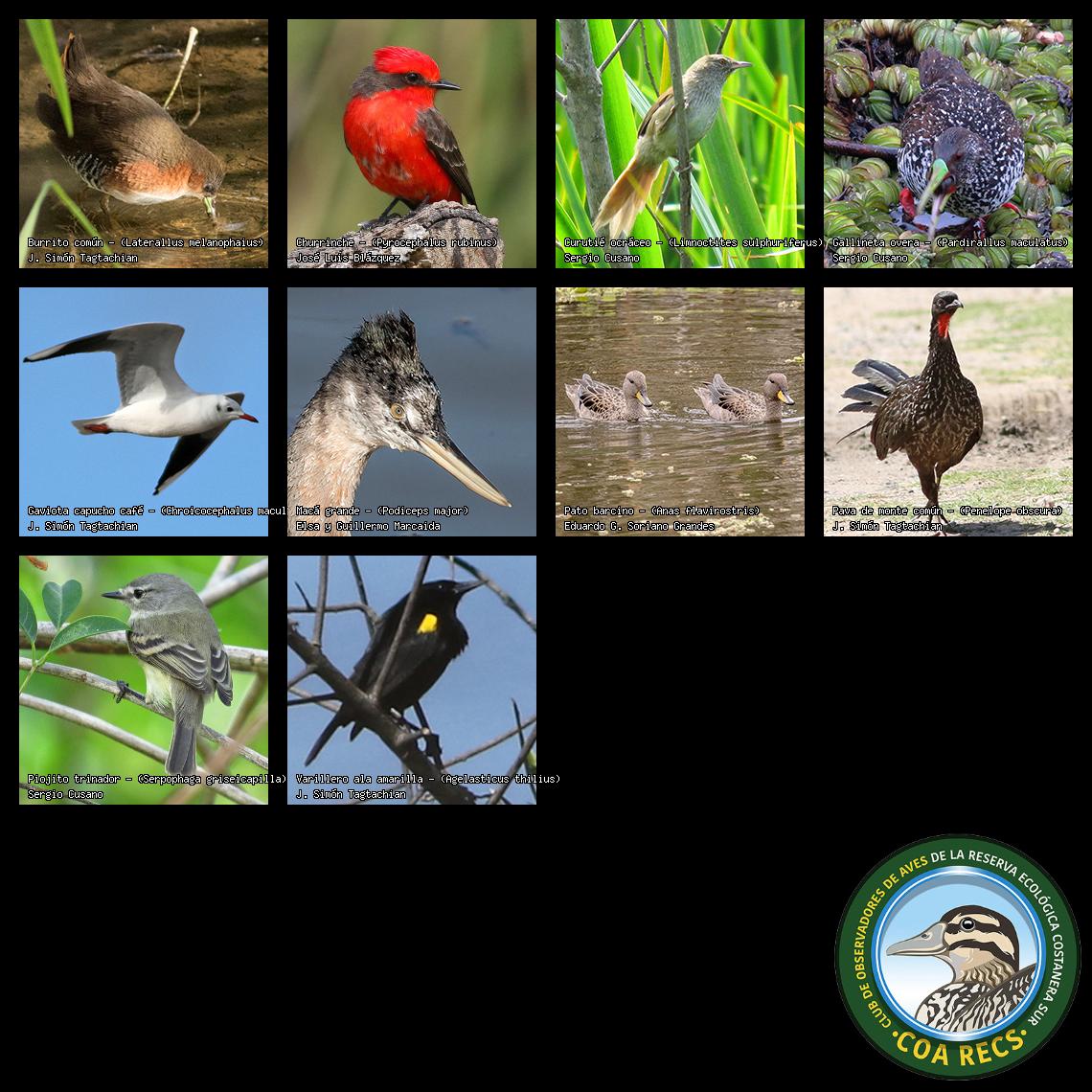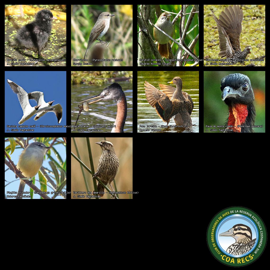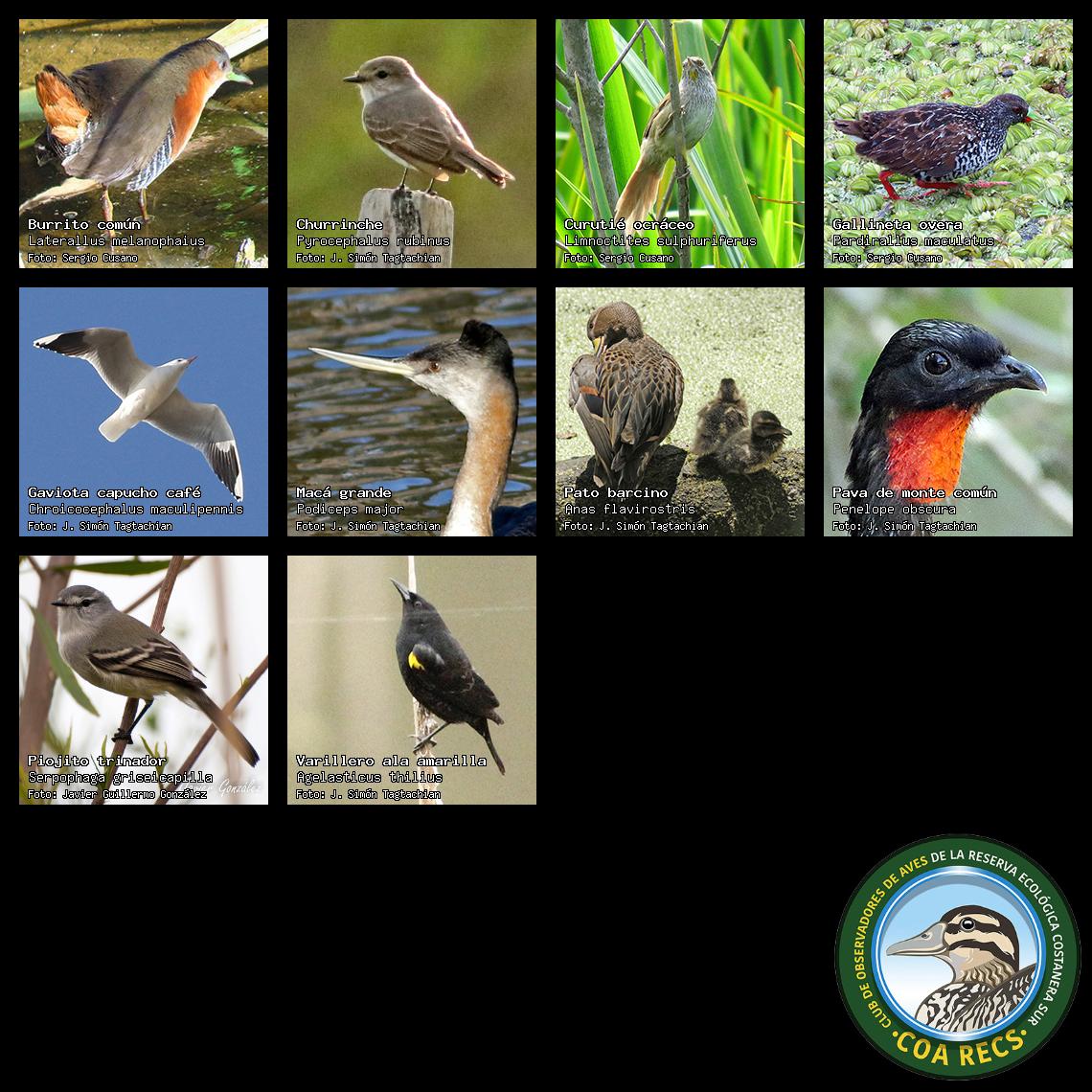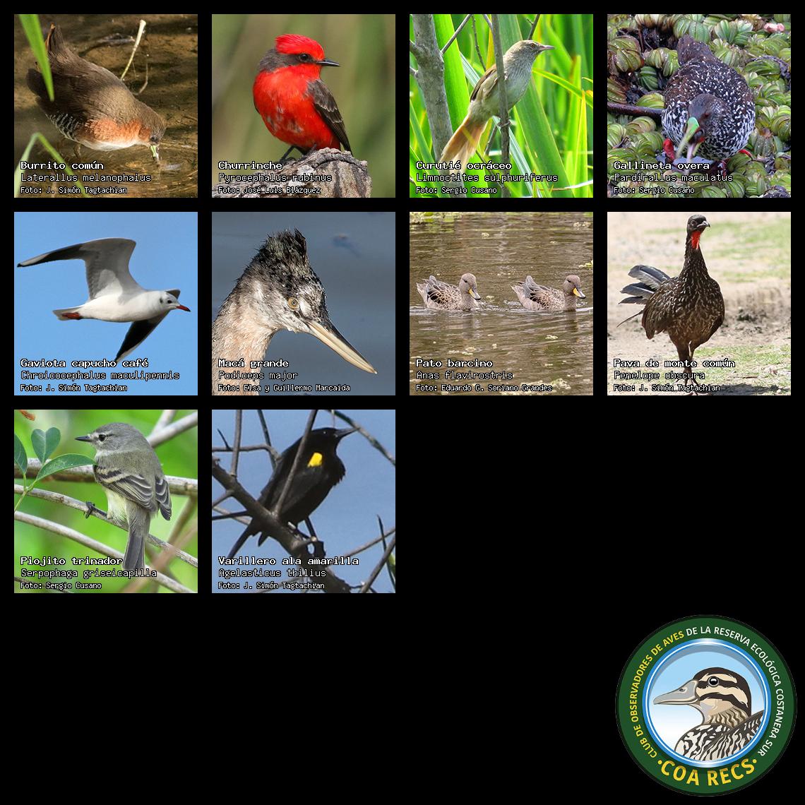 (Gavilán mixto, Carancho, Chimango, Benteveo común, Hornero, Carpintero real y Estornino pinto)