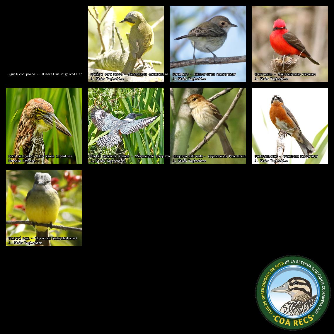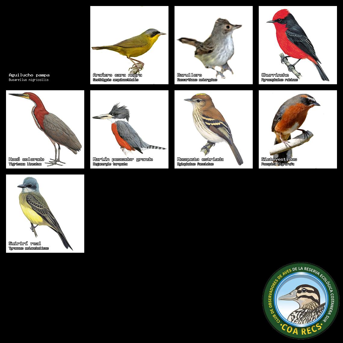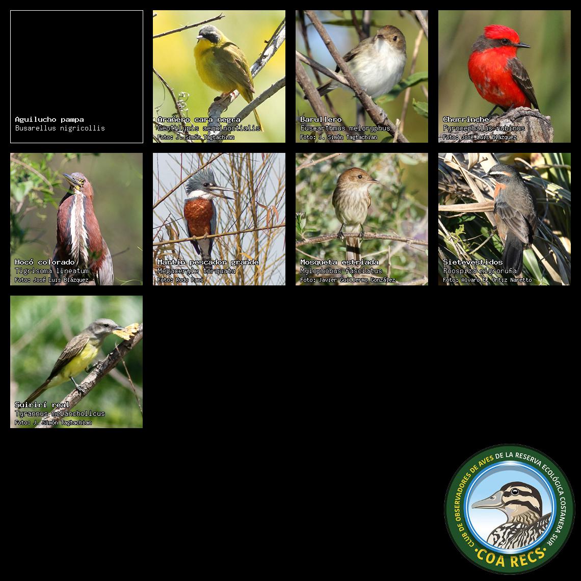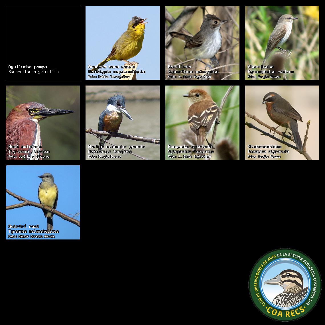(Gavilán mixto, Carancho, Chimango, Benteveo común, Hornero, Carpintero real y Estornino pinto)
