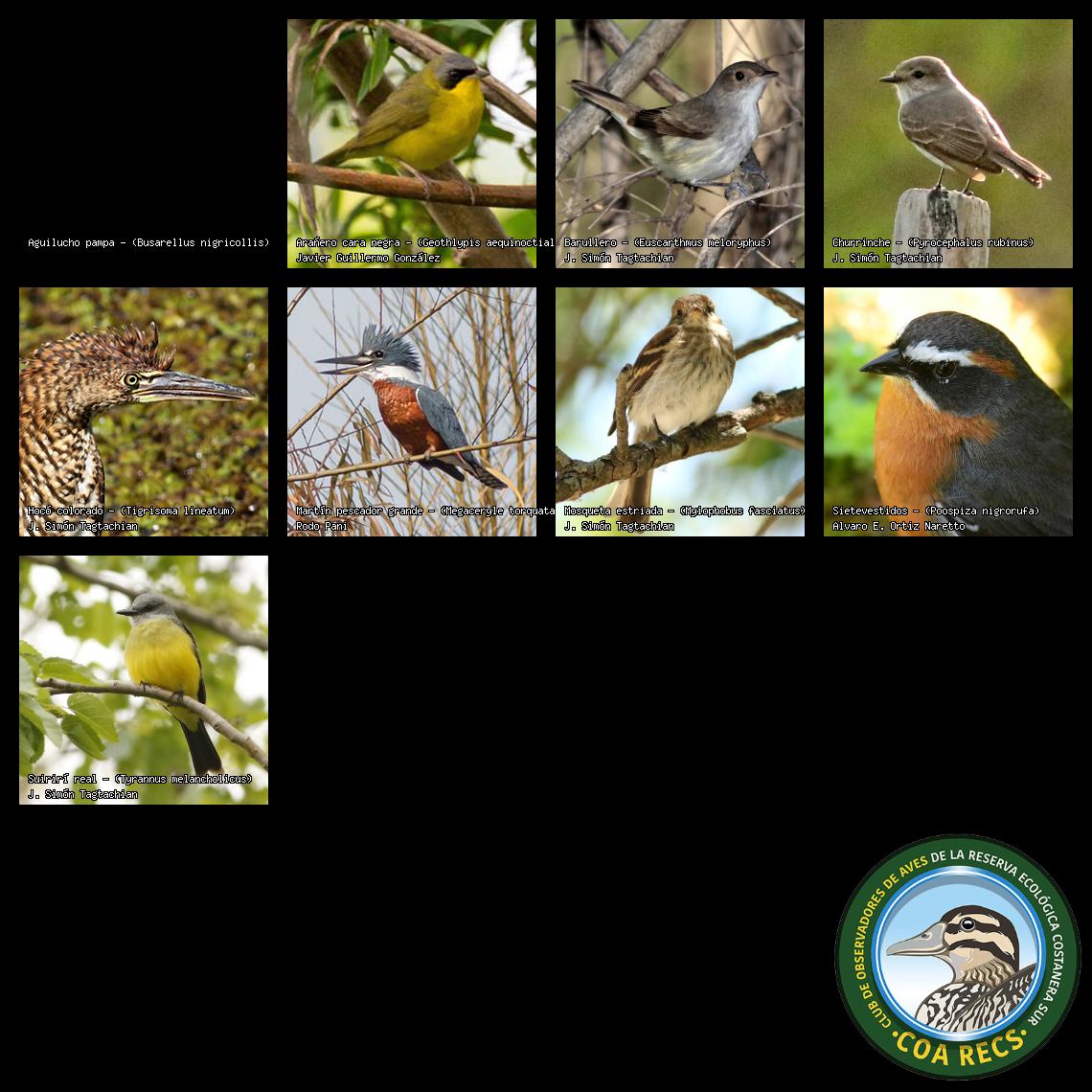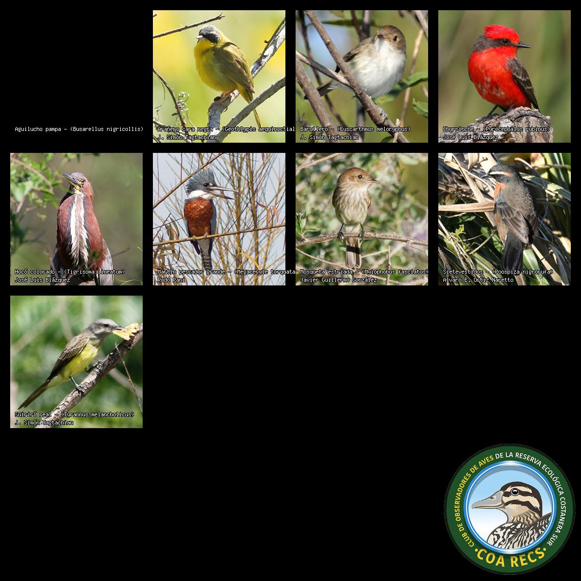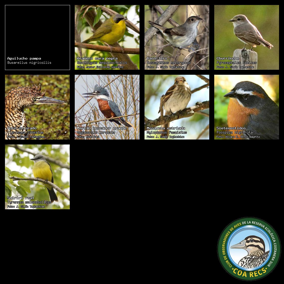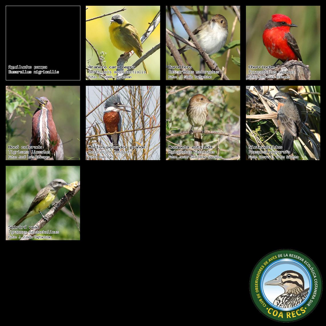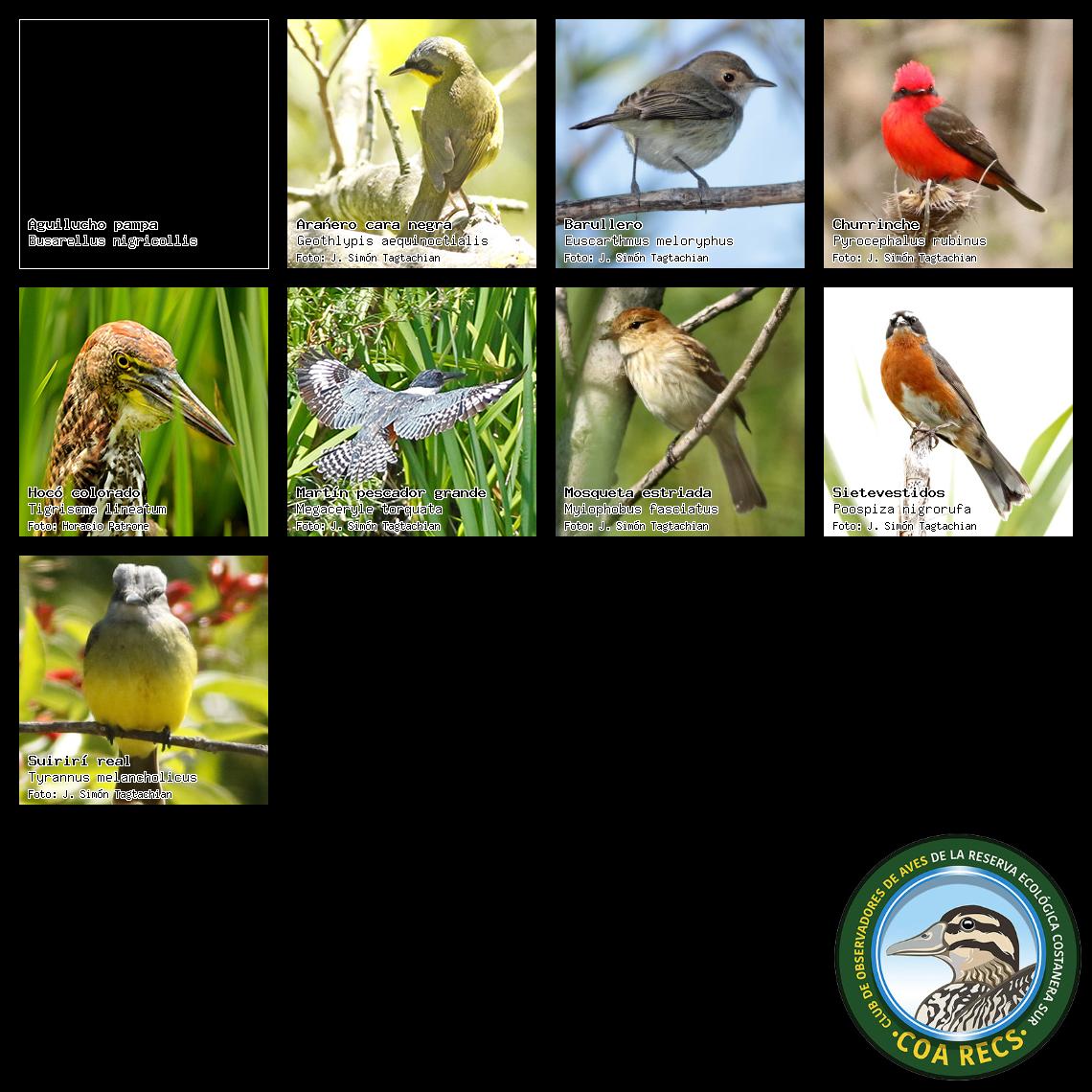 (Gavilán mixto, Carancho, Chimango, Benteveo común, Hornero, Carpintero real y Estornino pinto)