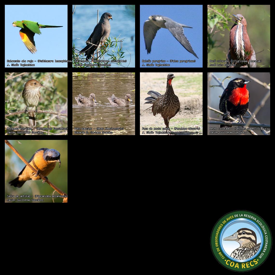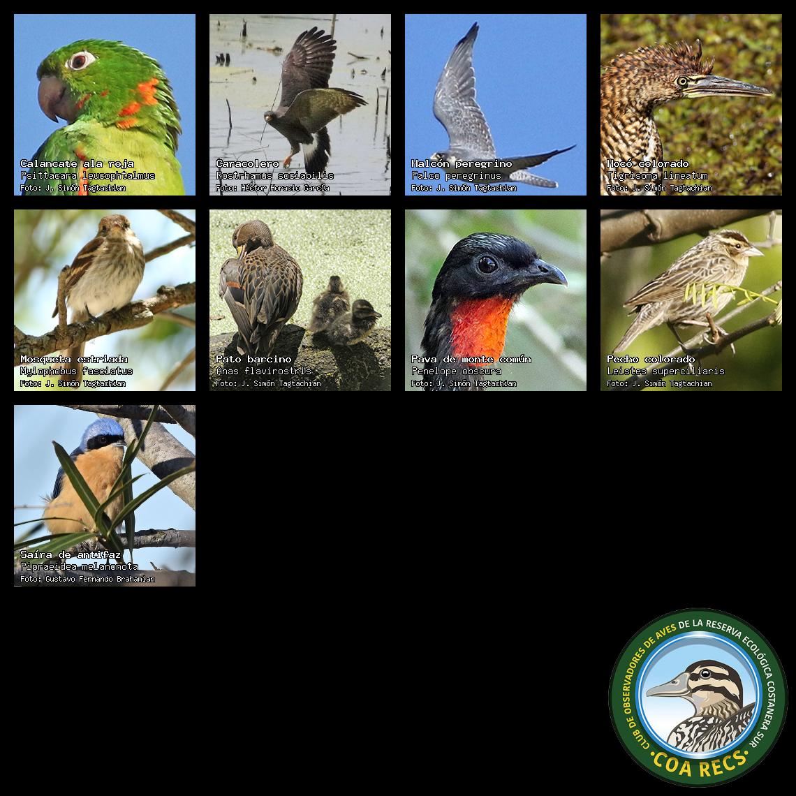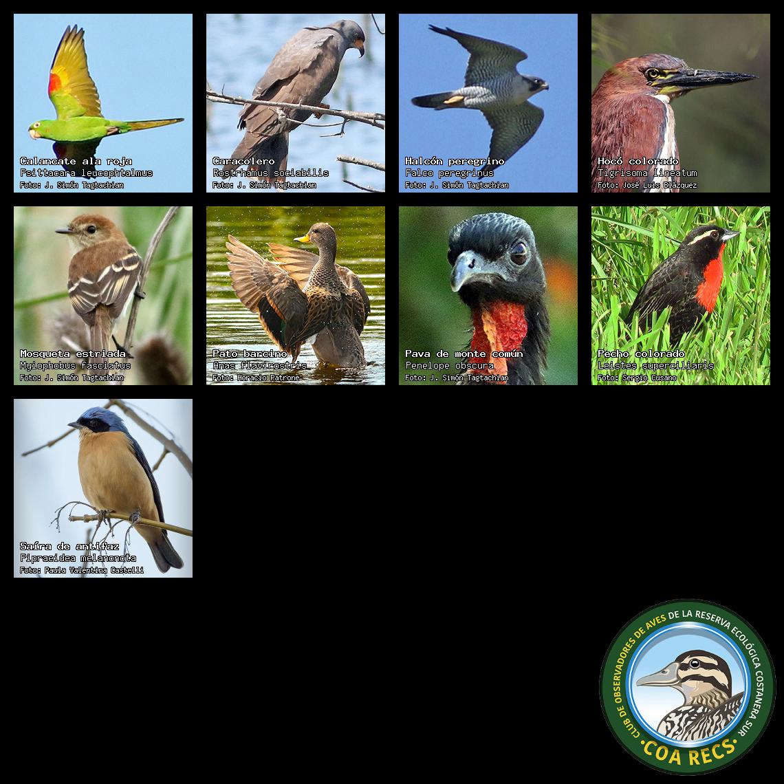 (Gavilán mixto, Carancho, Chimango, Benteveo común, Hornero, Carpintero real y Estornino pinto)
