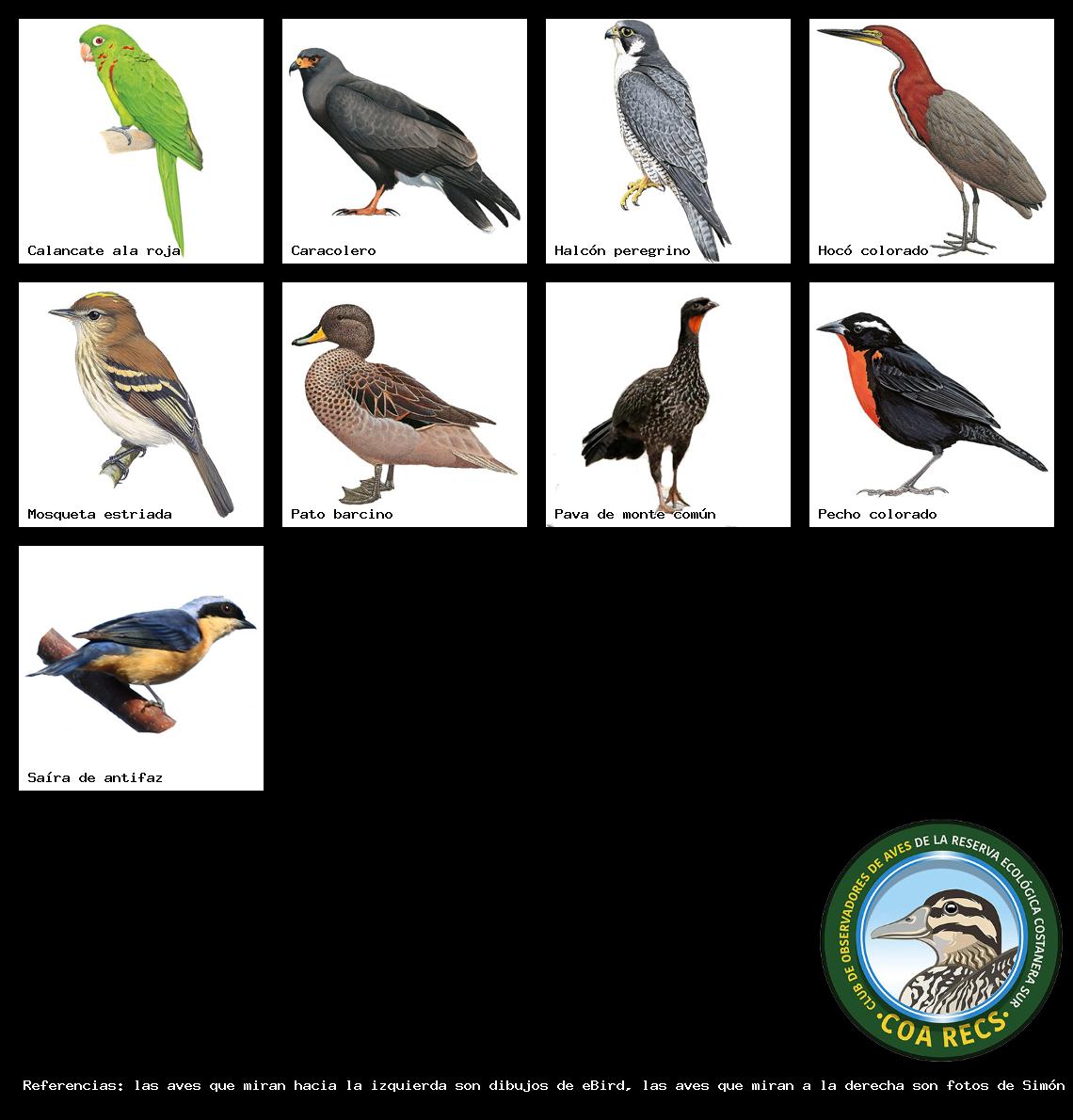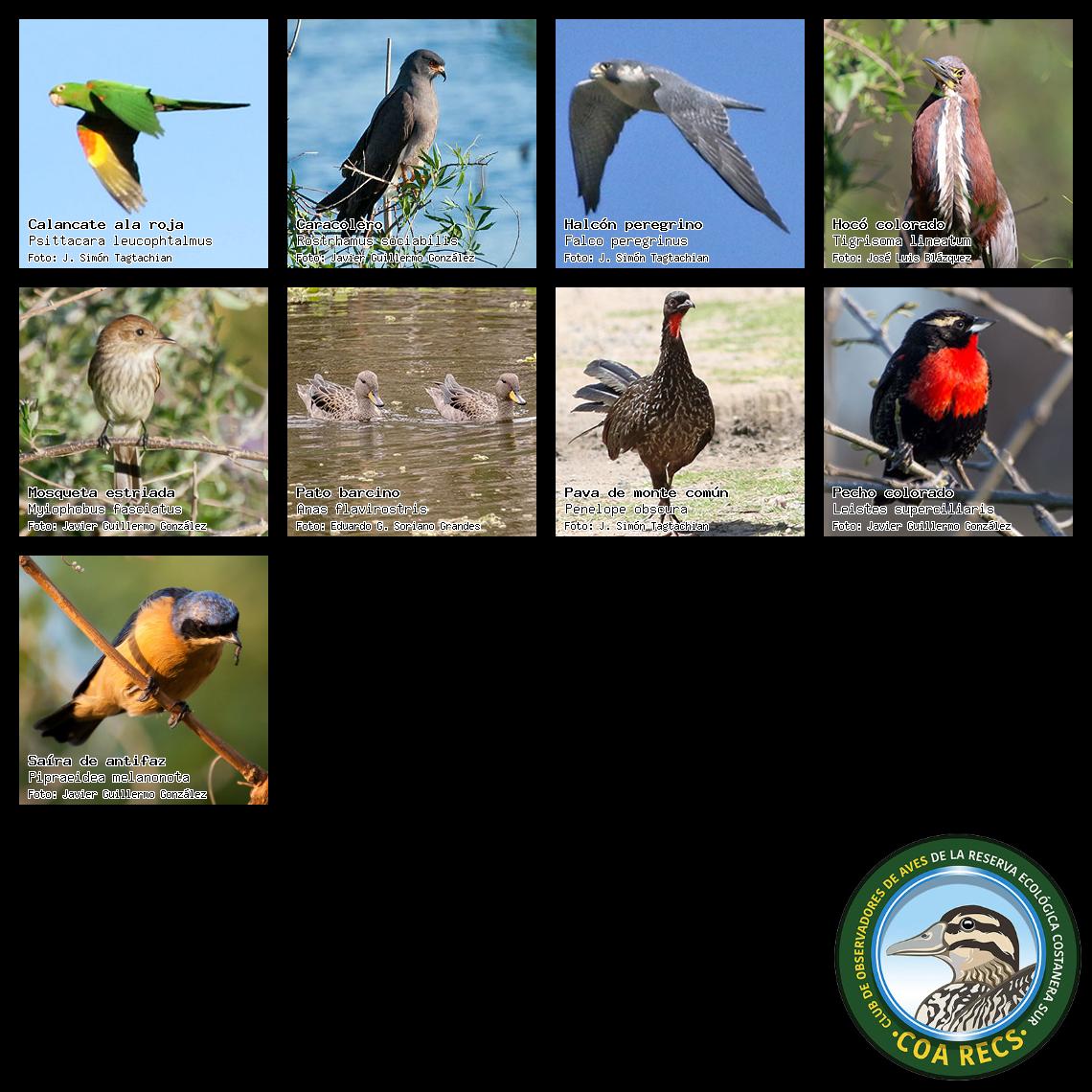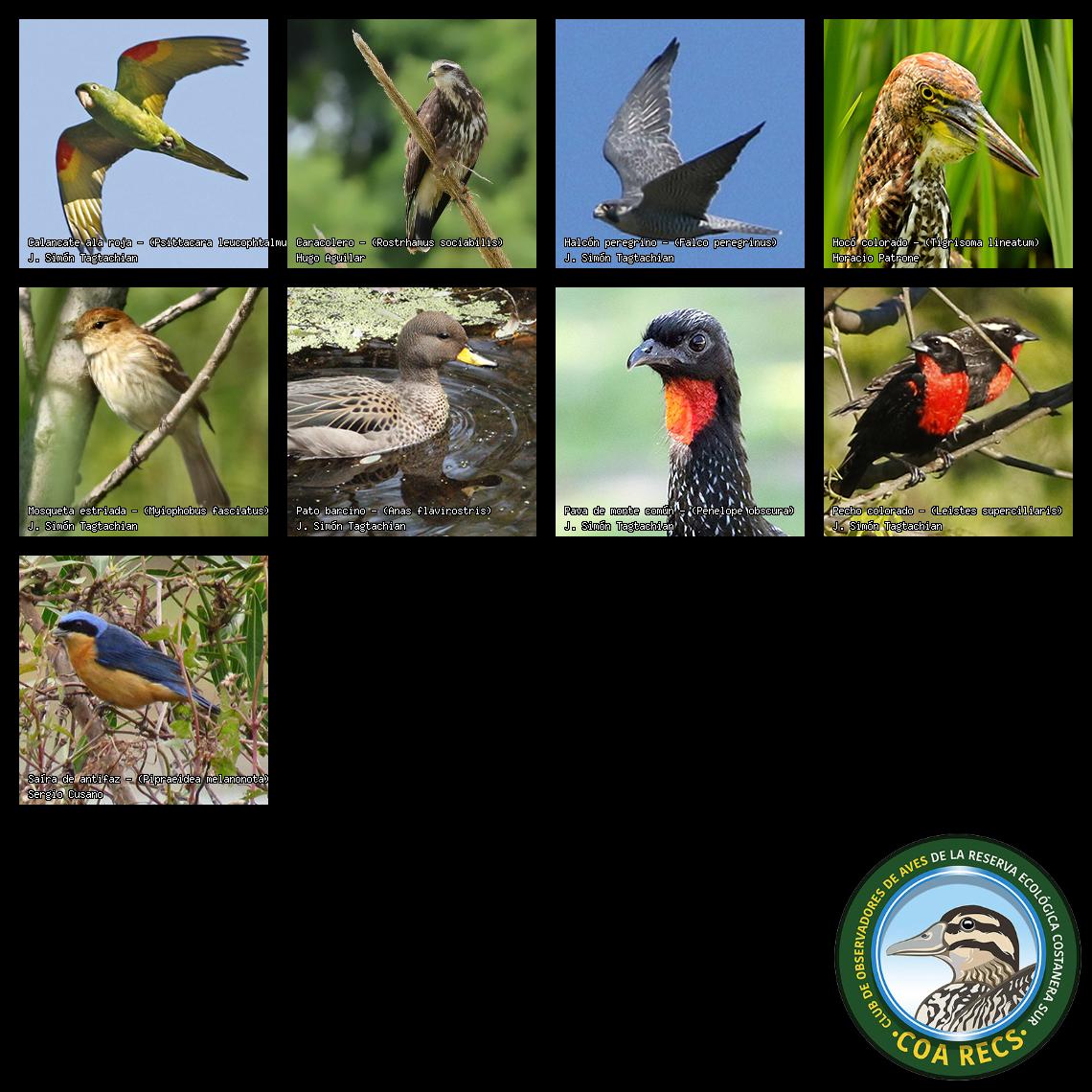 (Gavilán mixto, Carancho, Chimango, Benteveo común, Hornero, Carpintero real y Estornino pinto)