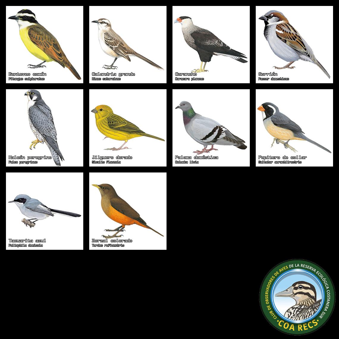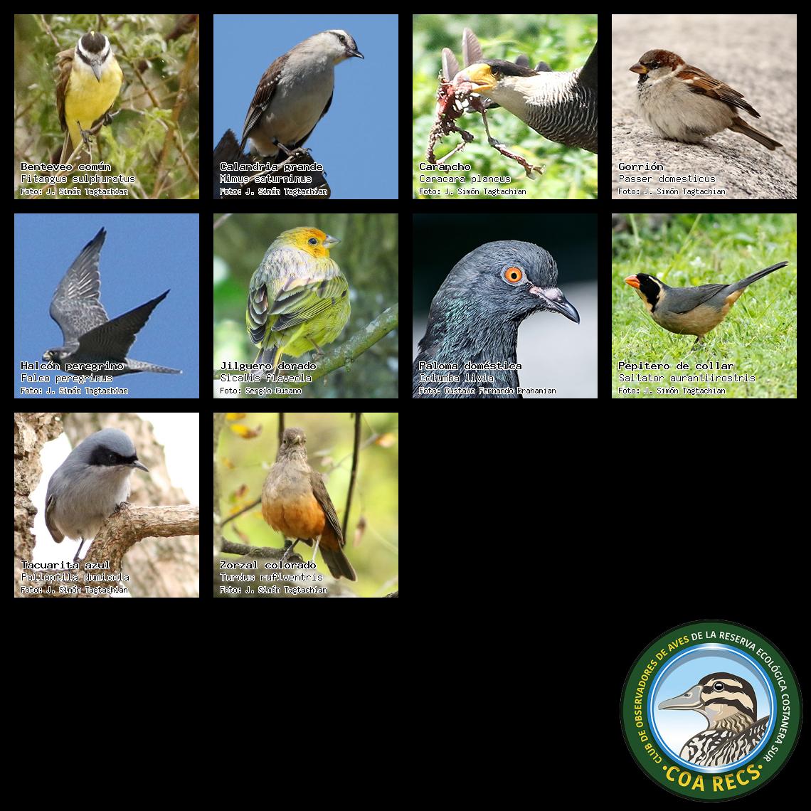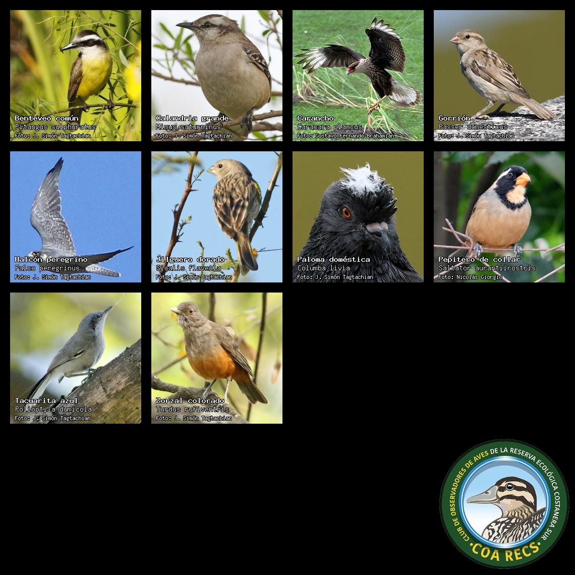 (Gavilán mixto, Carancho, Chimango, Benteveo común, Hornero, Carpintero real y Estornino pinto)