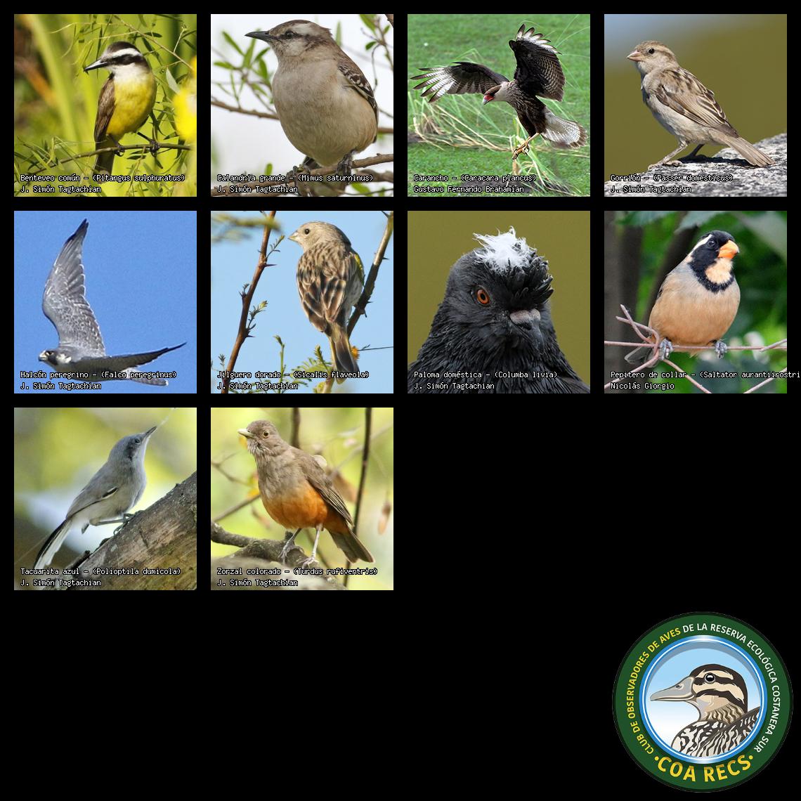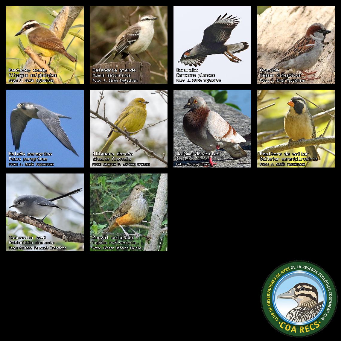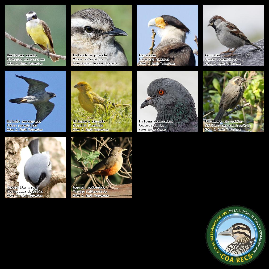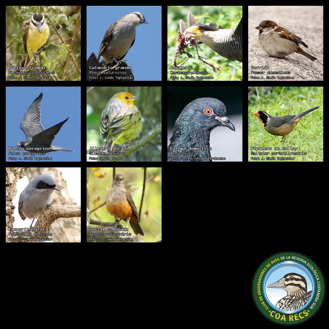 (Gavilán mixto, Carancho, Chimango, Benteveo común, Hornero, Carpintero real y Estornino pinto)