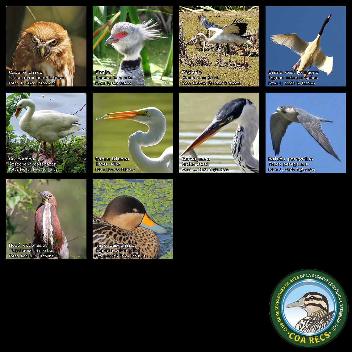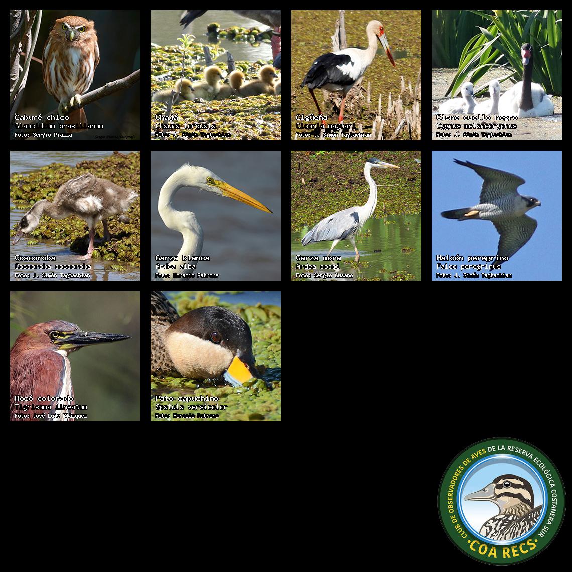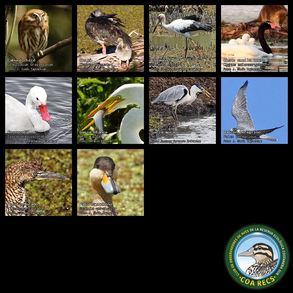 (Gavilán mixto, Carancho, Chimango, Benteveo común, Hornero, Carpintero real y Estornino pinto)