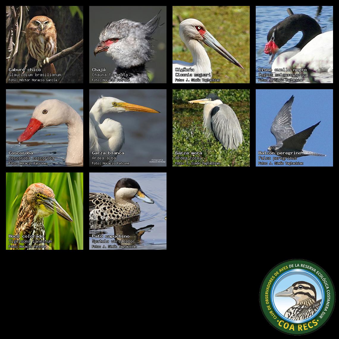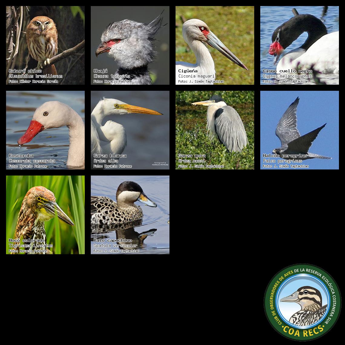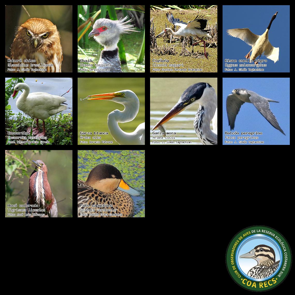 (Gavilán mixto, Carancho, Chimango, Benteveo común, Hornero, Carpintero real y Estornino pinto)