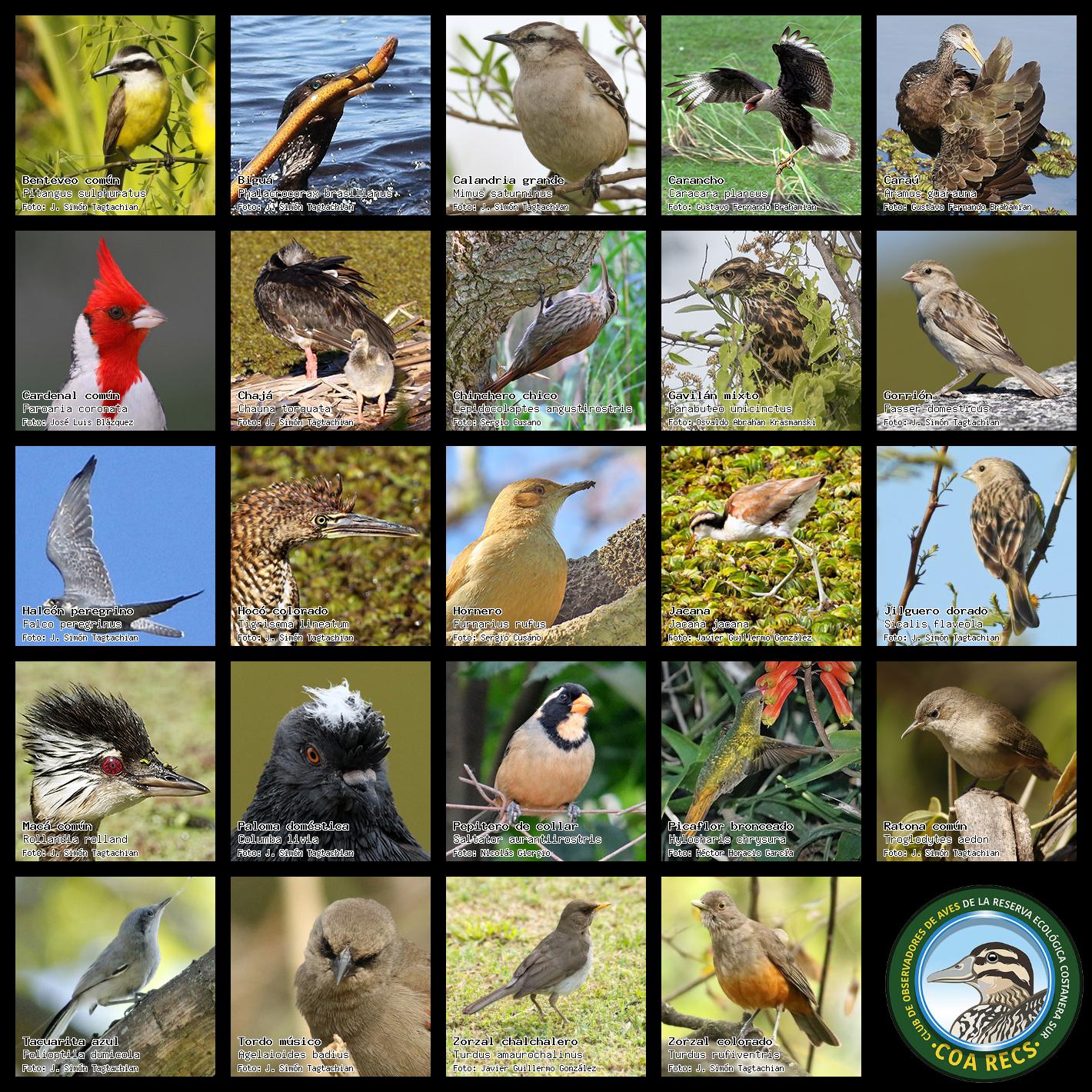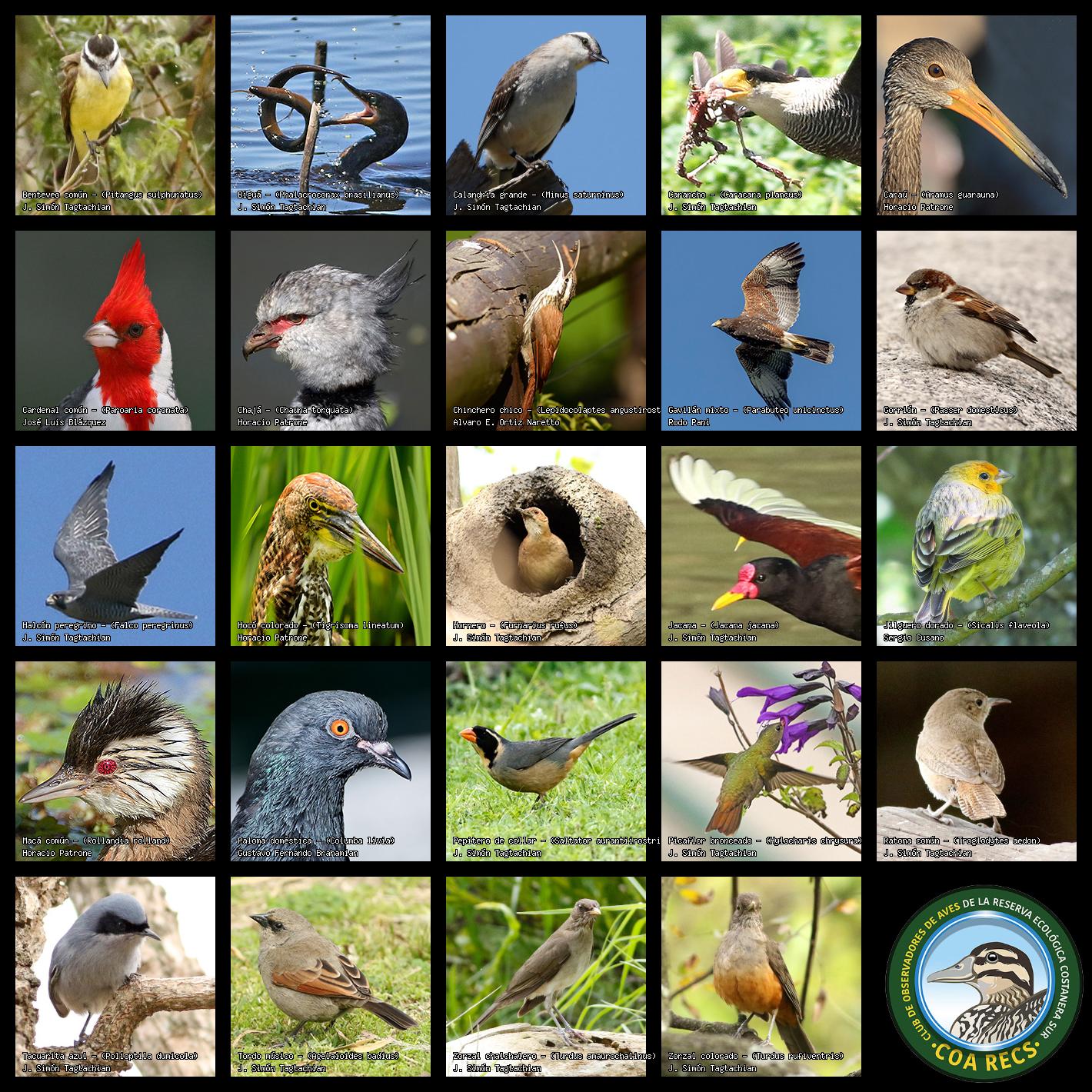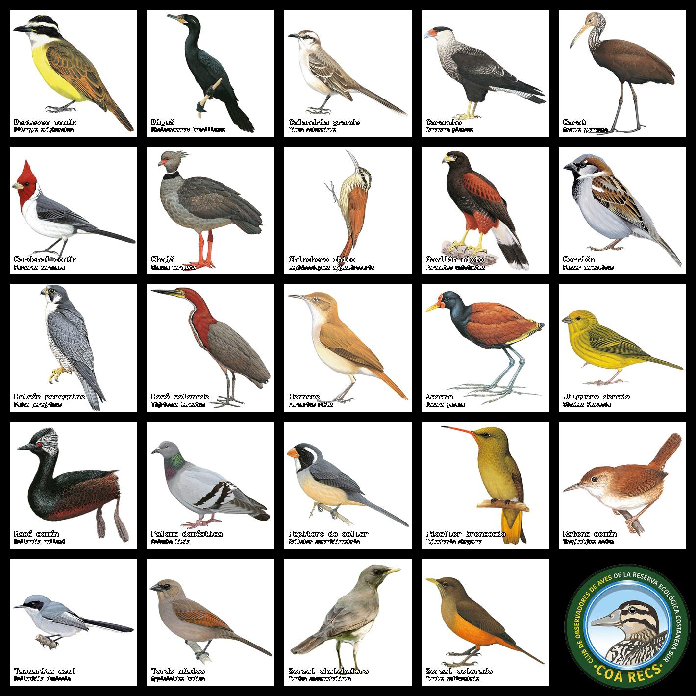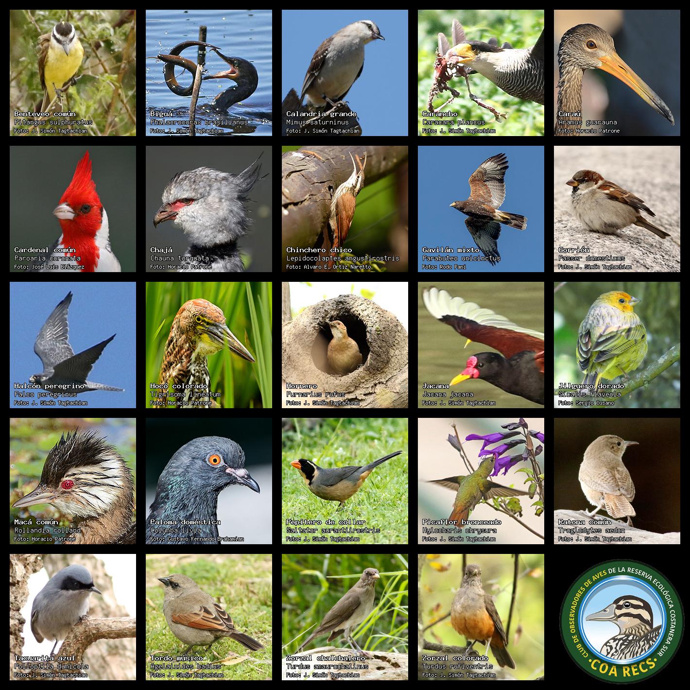 (Gavilán mixto, Carancho, Chimango, Benteveo común, Hornero, Carpintero real y Estornino pinto)
