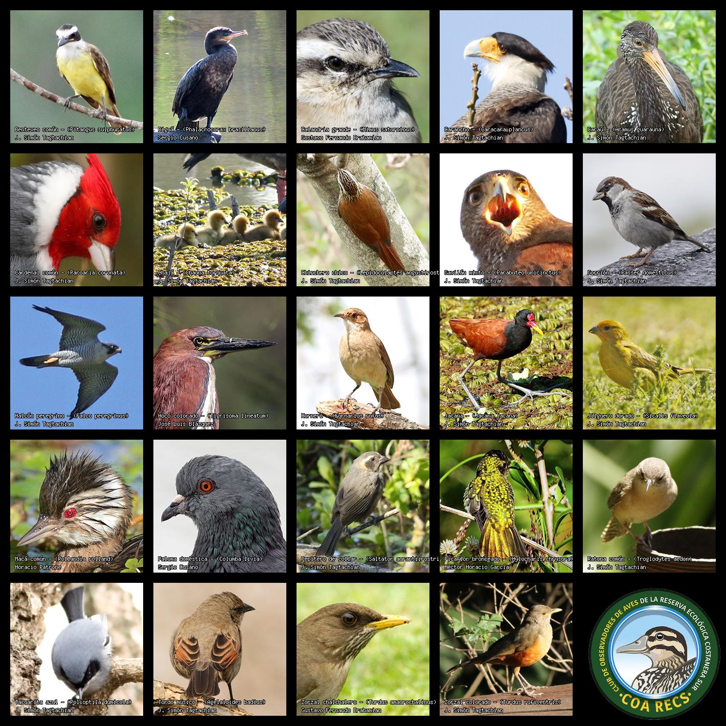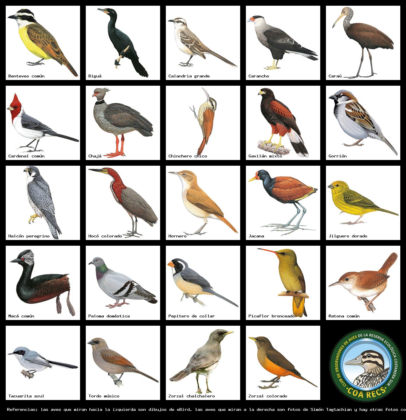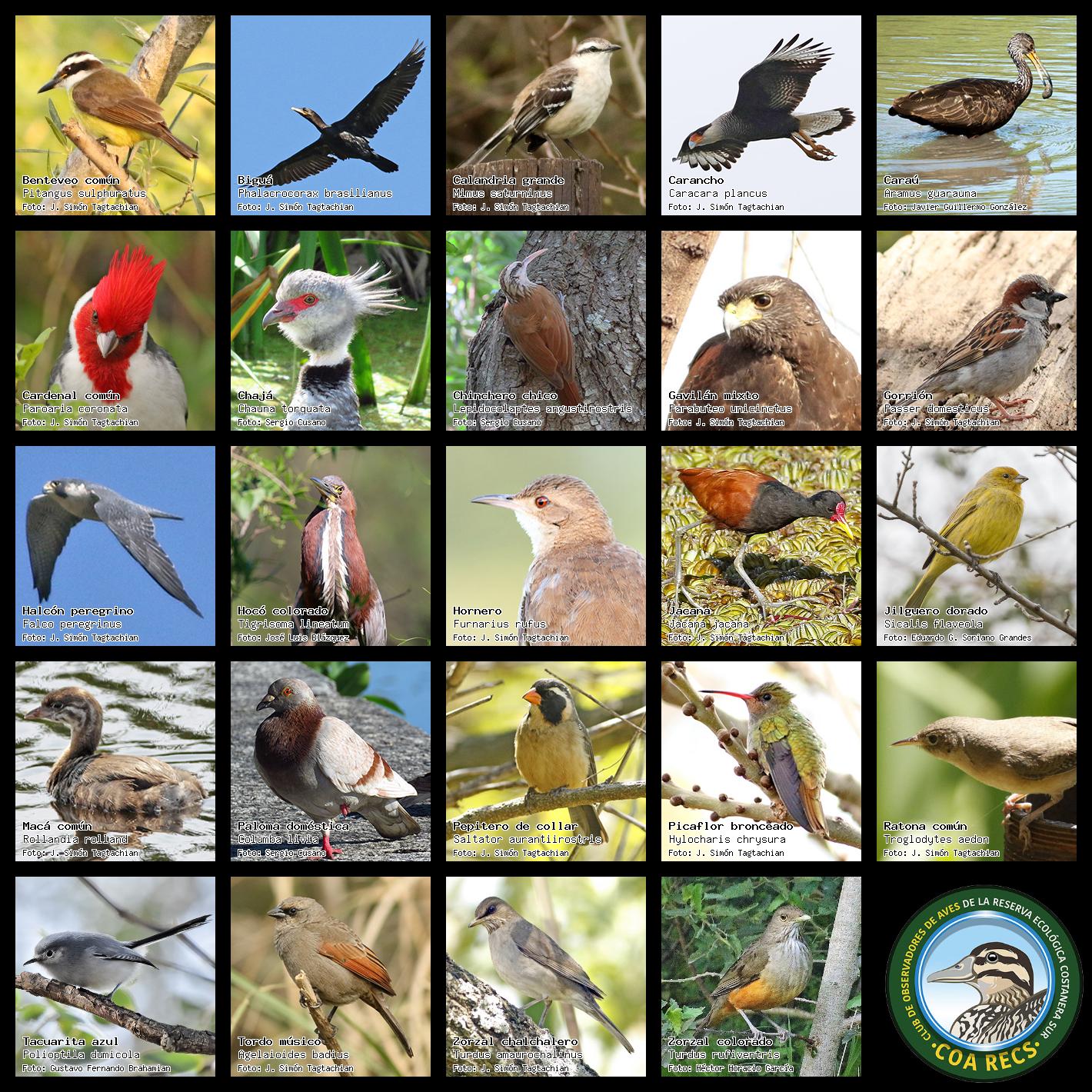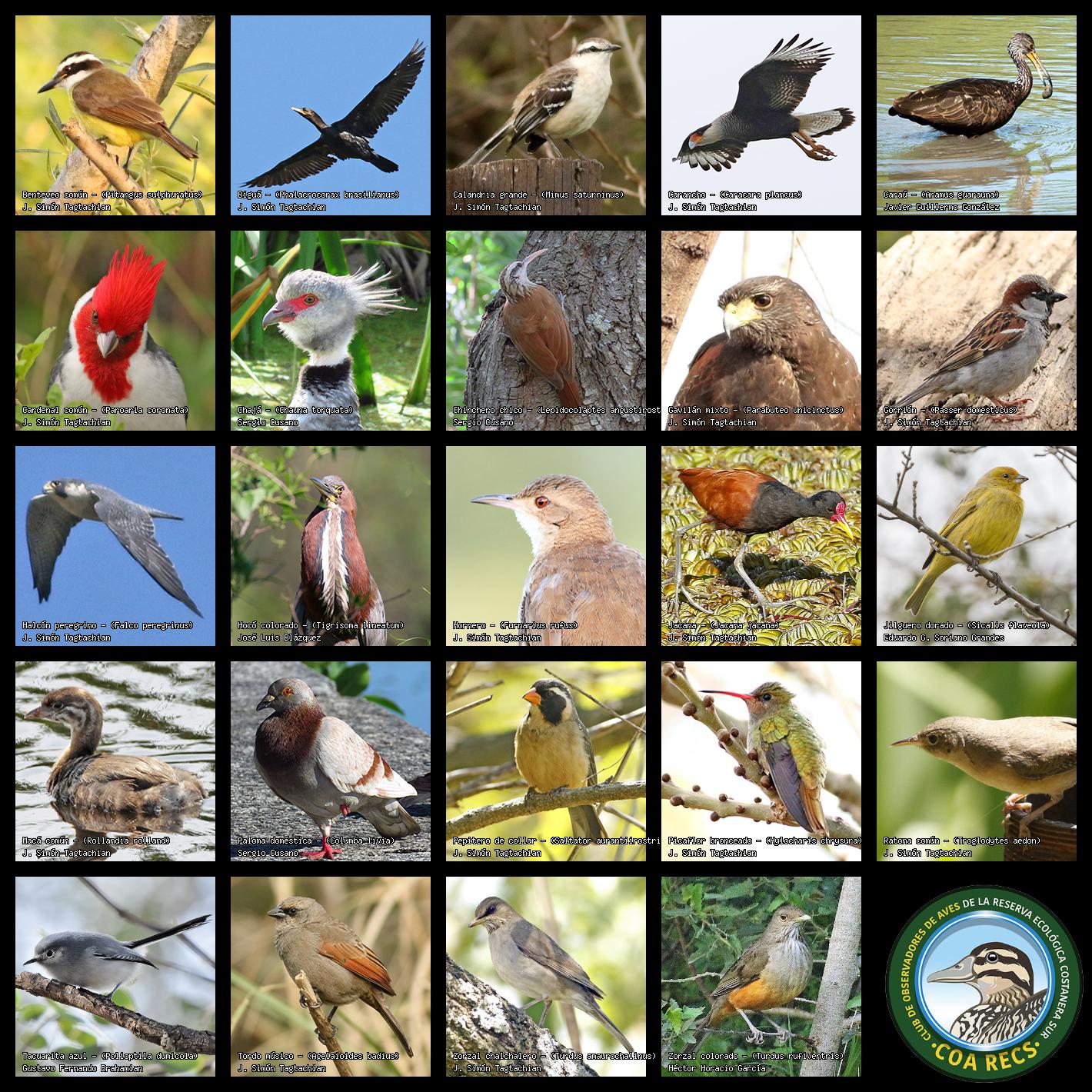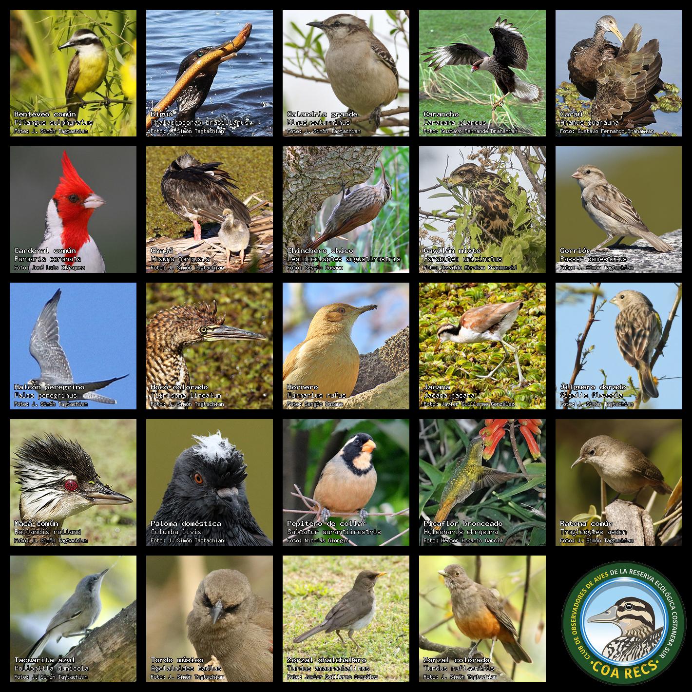 (Gavilán mixto, Carancho, Chimango, Benteveo común, Hornero, Carpintero real y Estornino pinto)
