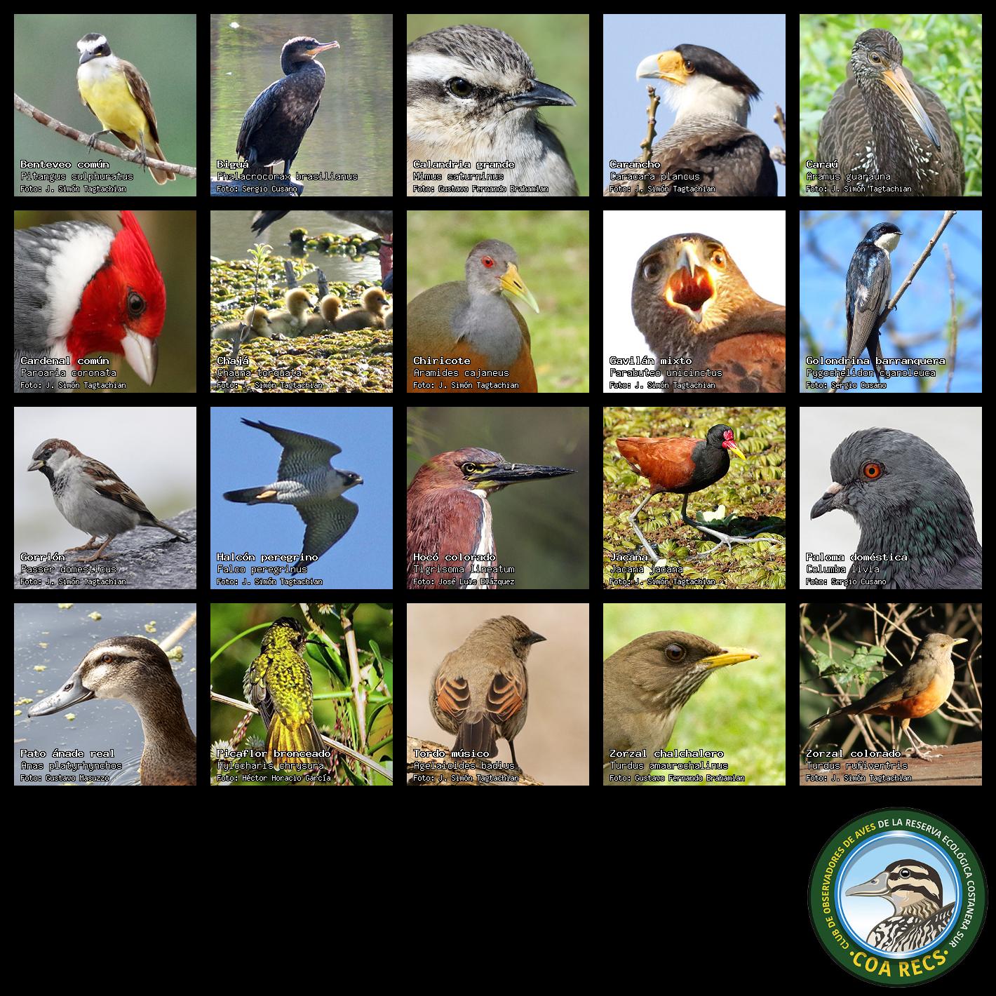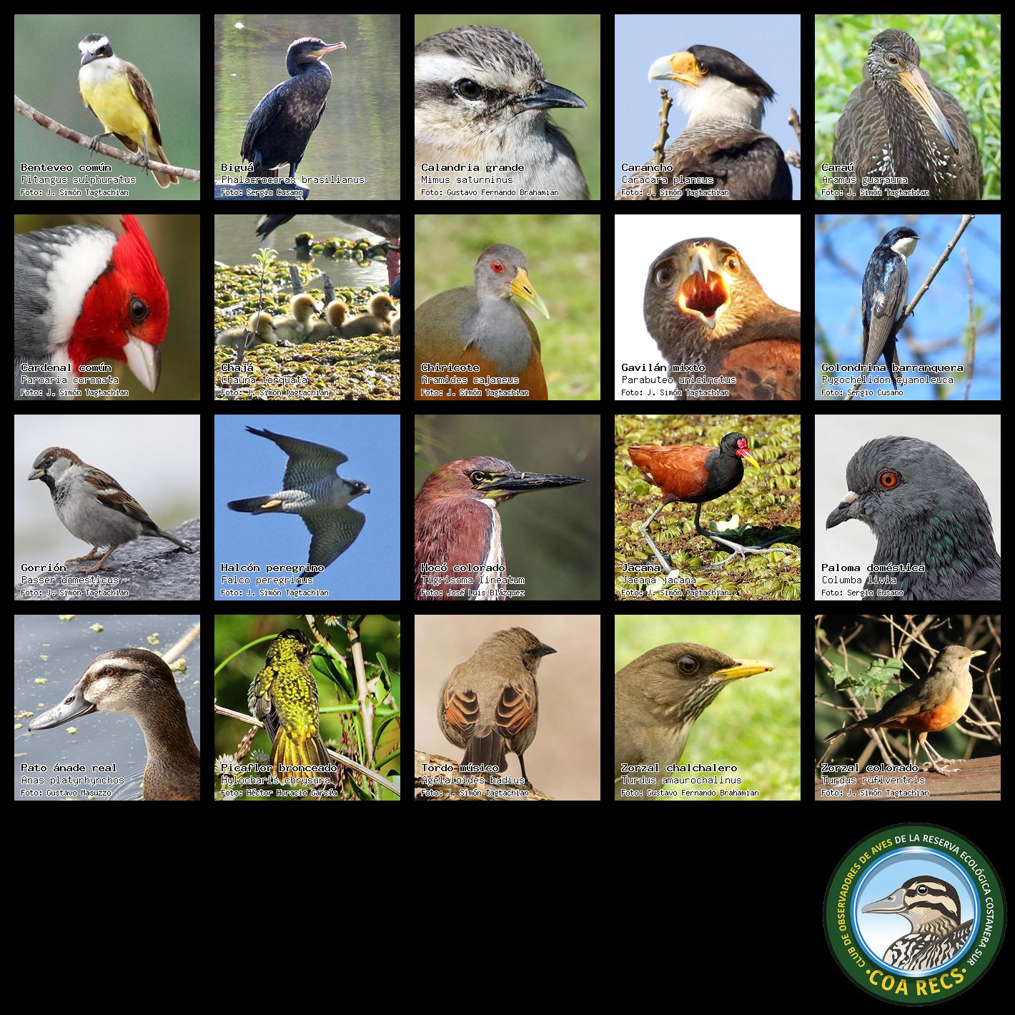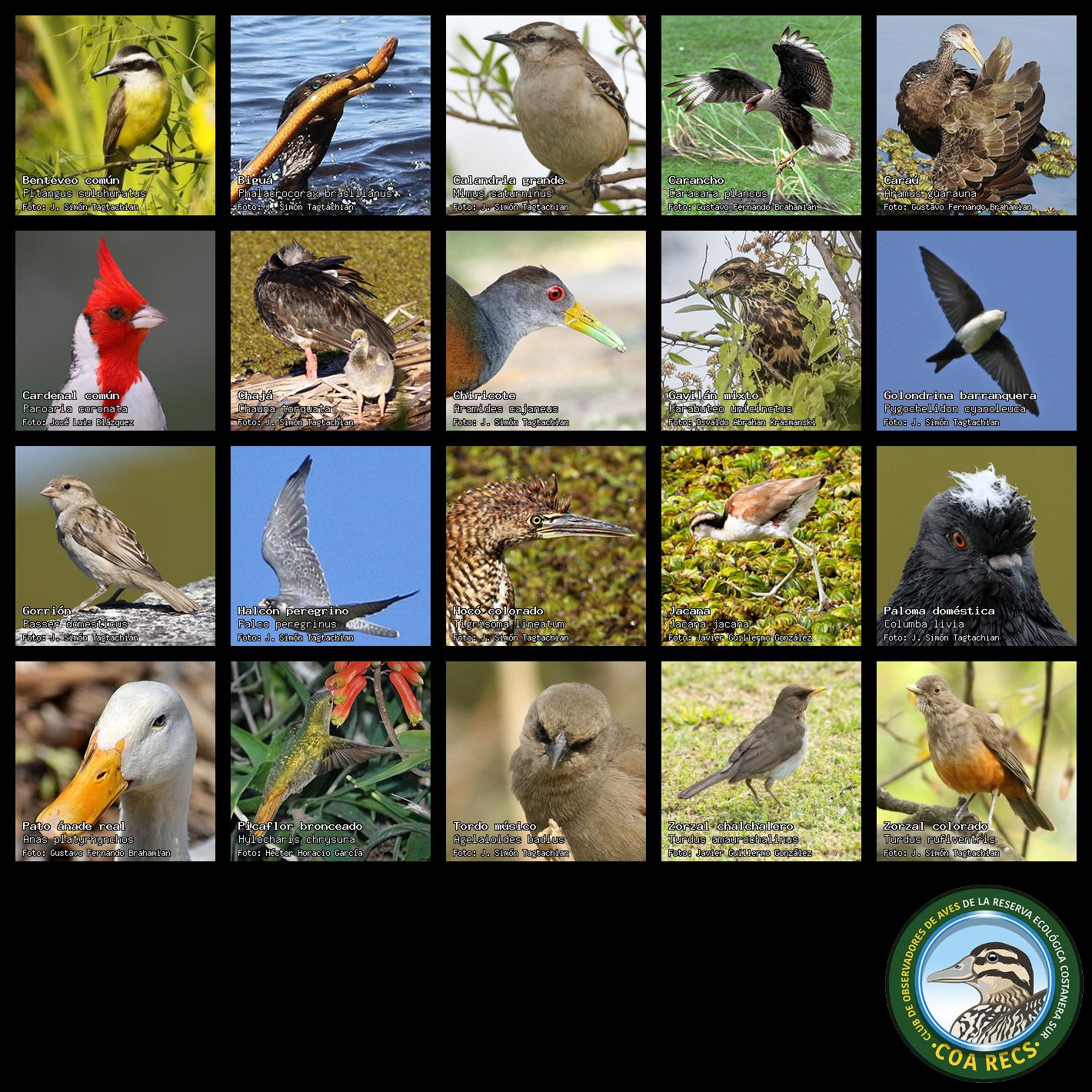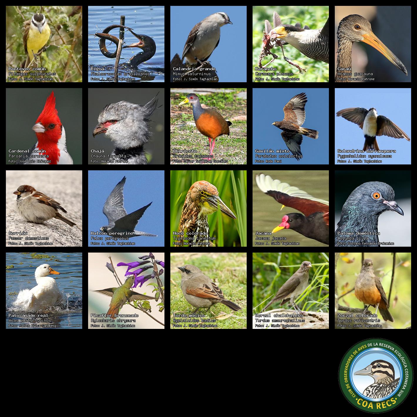 (Gavilán mixto, Carancho, Chimango, Benteveo común, Hornero, Carpintero real y Estornino pinto)