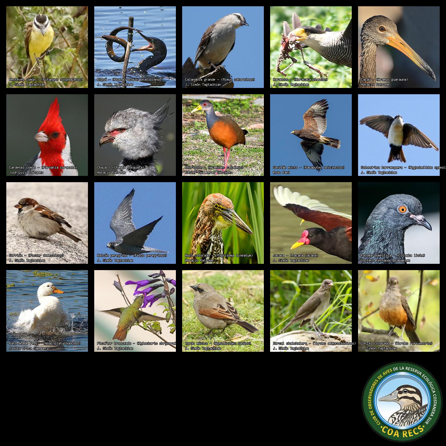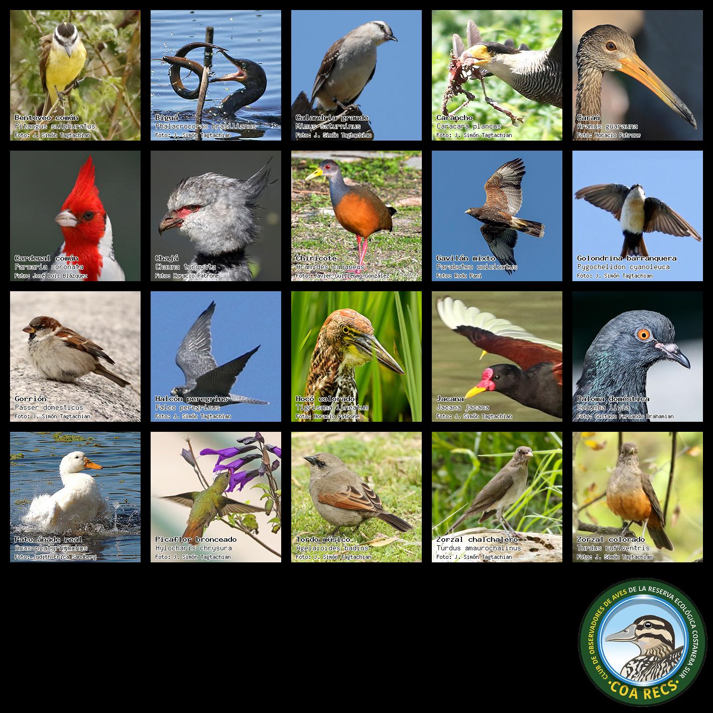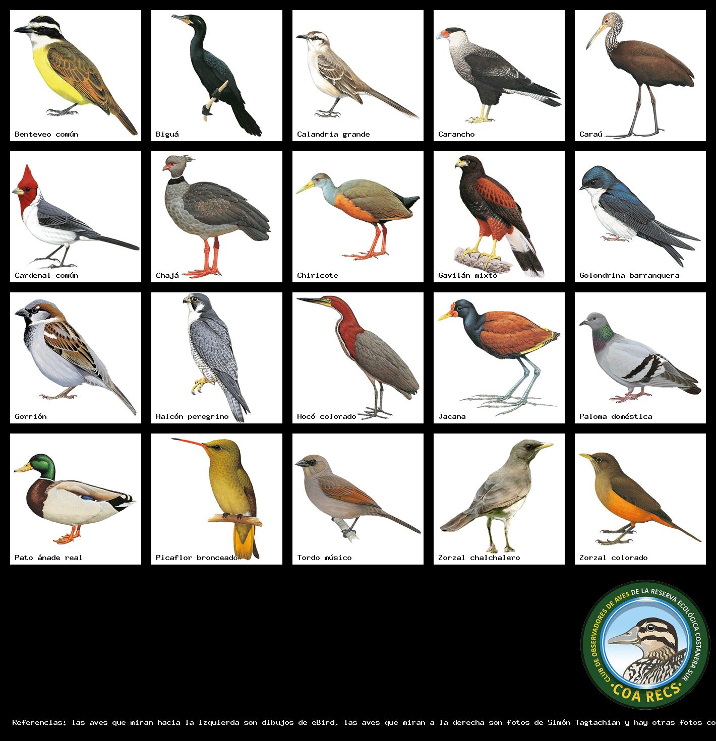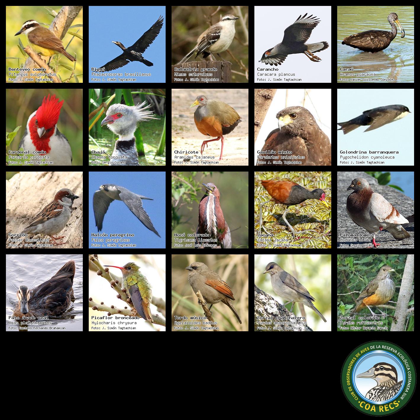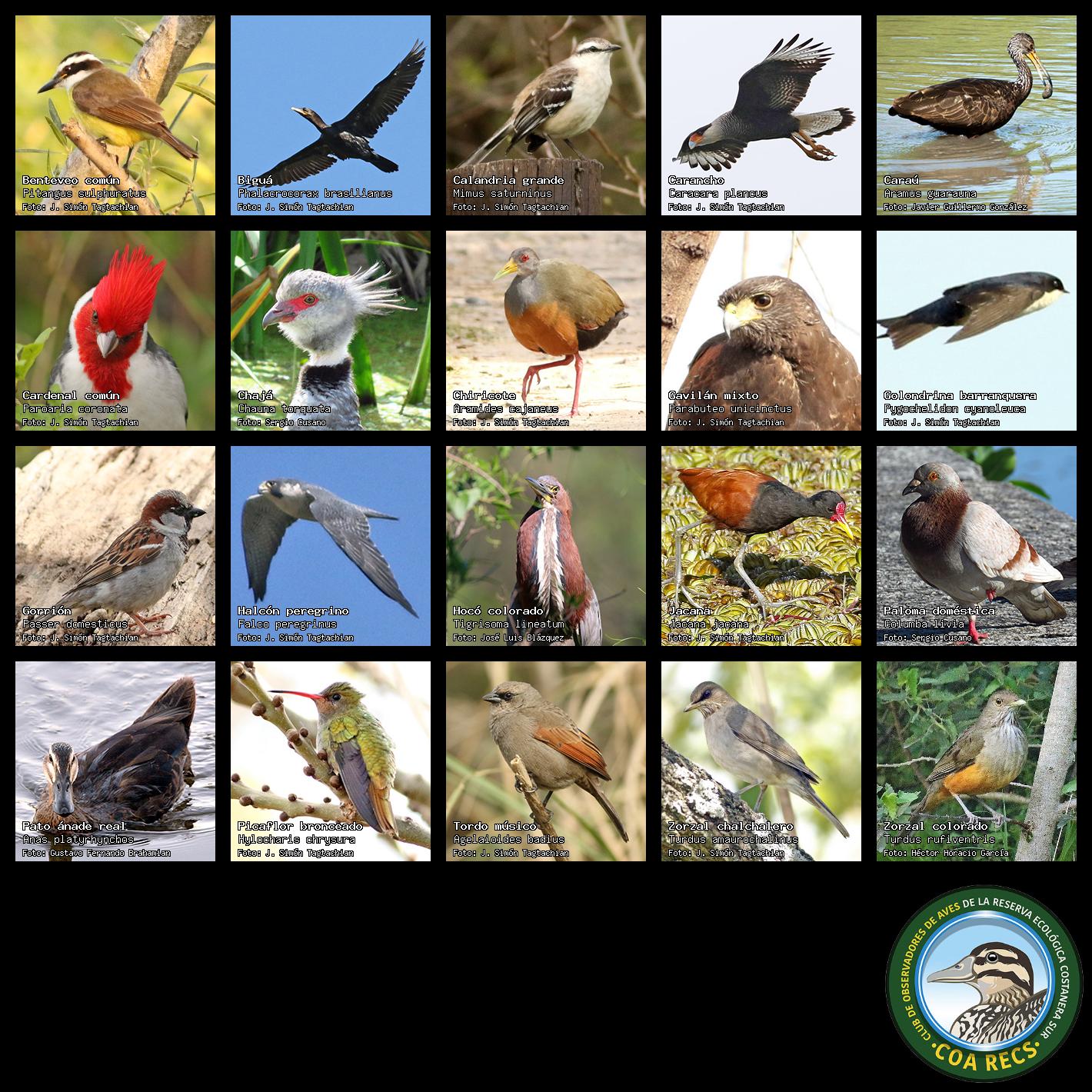 (Gavilán mixto, Carancho, Chimango, Benteveo común, Hornero, Carpintero real y Estornino pinto)