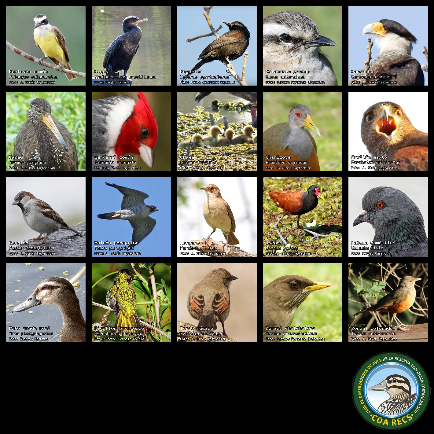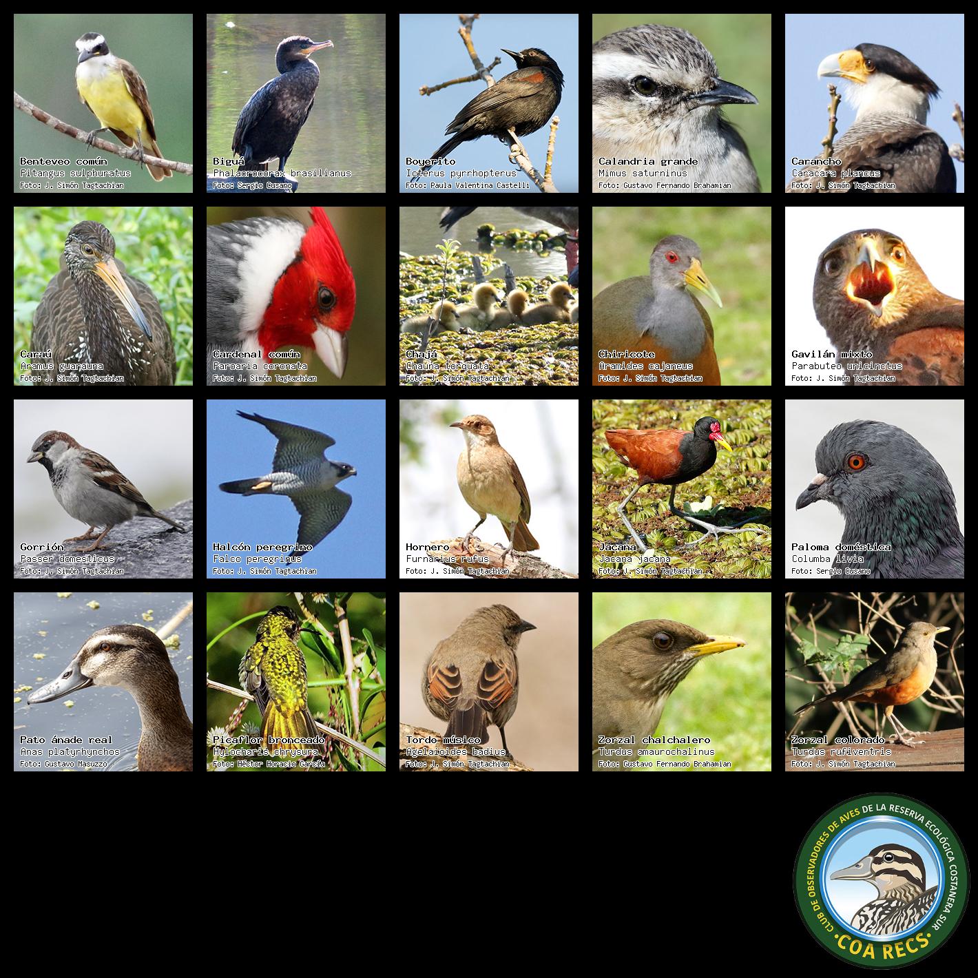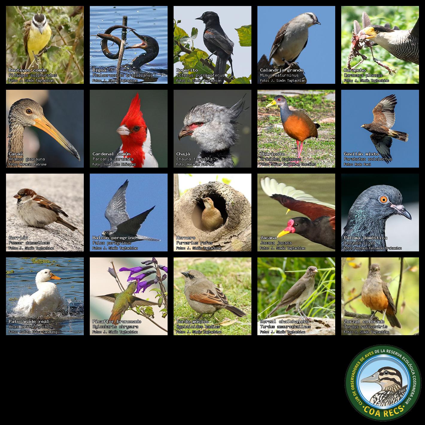 (Gavilán mixto, Carancho, Chimango, Benteveo común, Hornero, Carpintero real y Estornino pinto)