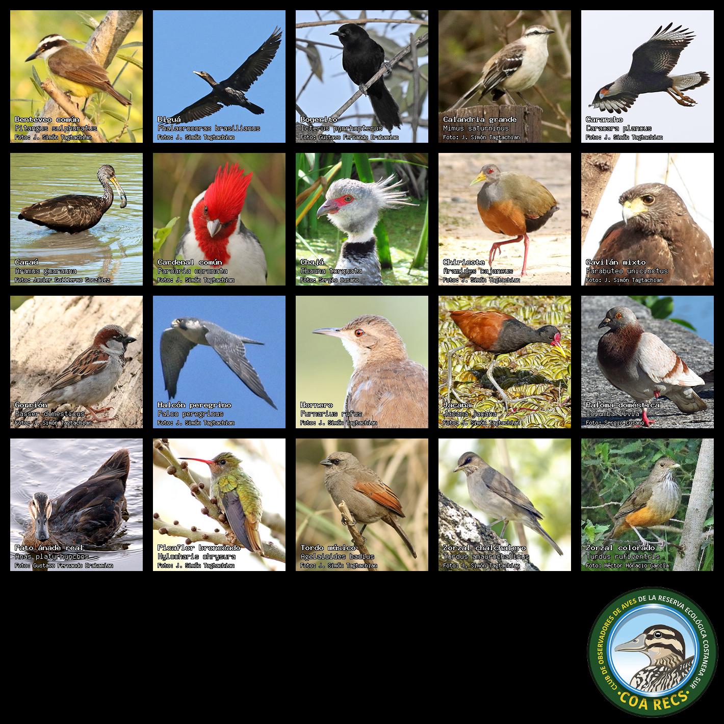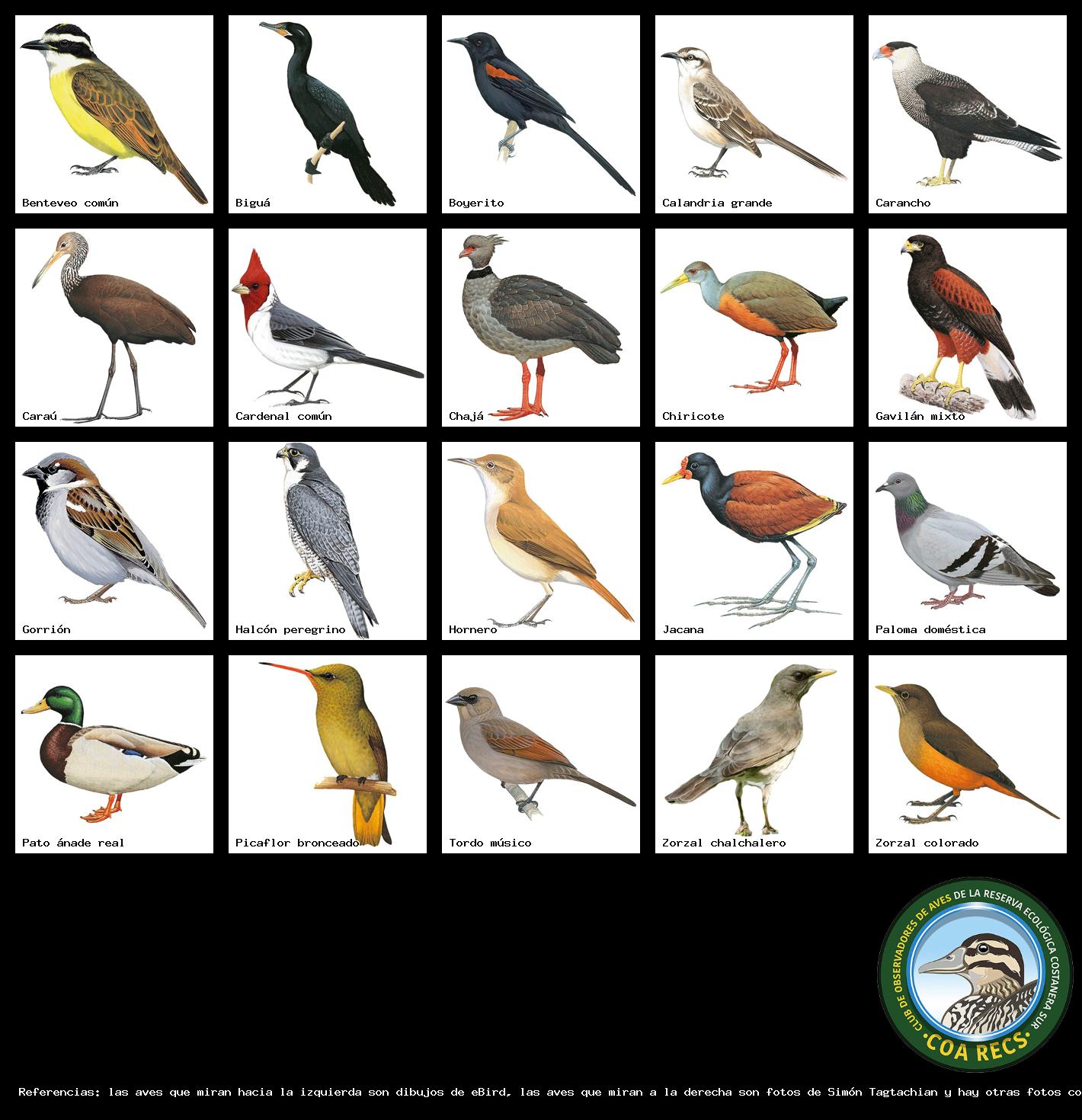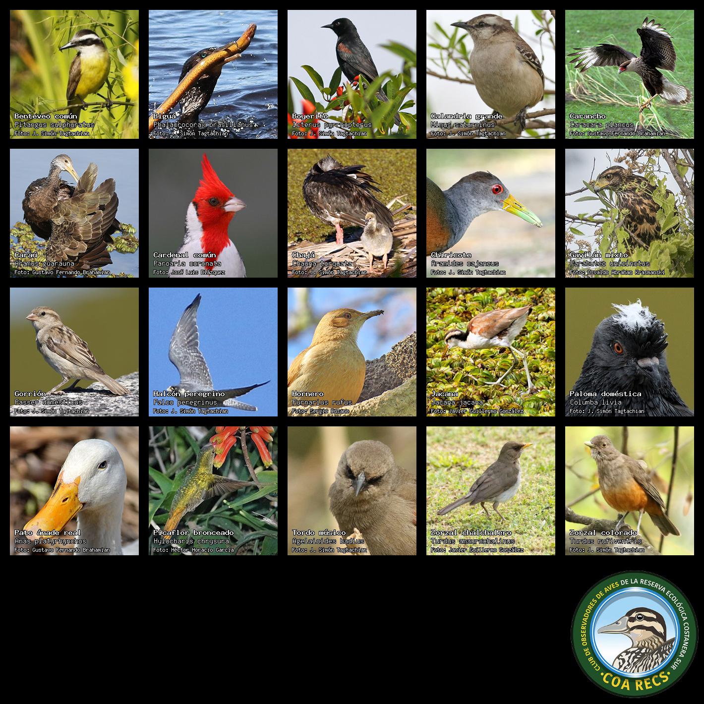 (Gavilán mixto, Carancho, Chimango, Benteveo común, Hornero, Carpintero real y Estornino pinto)