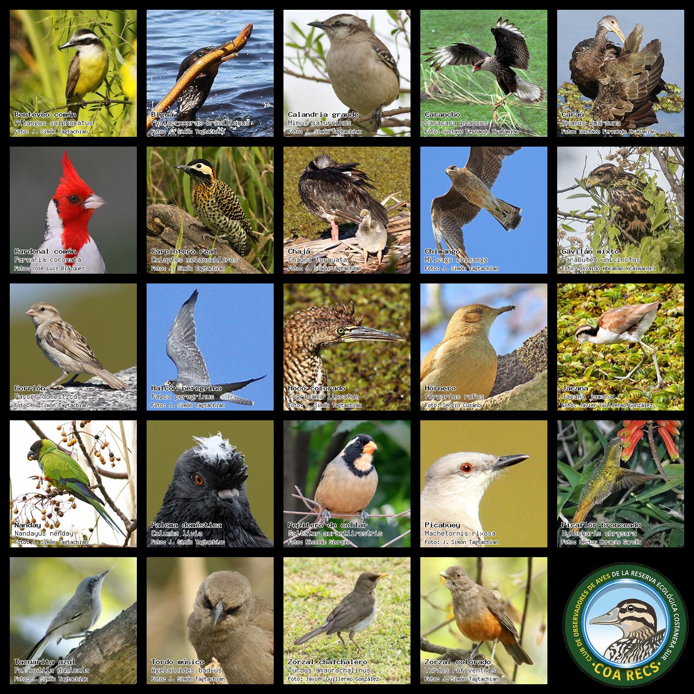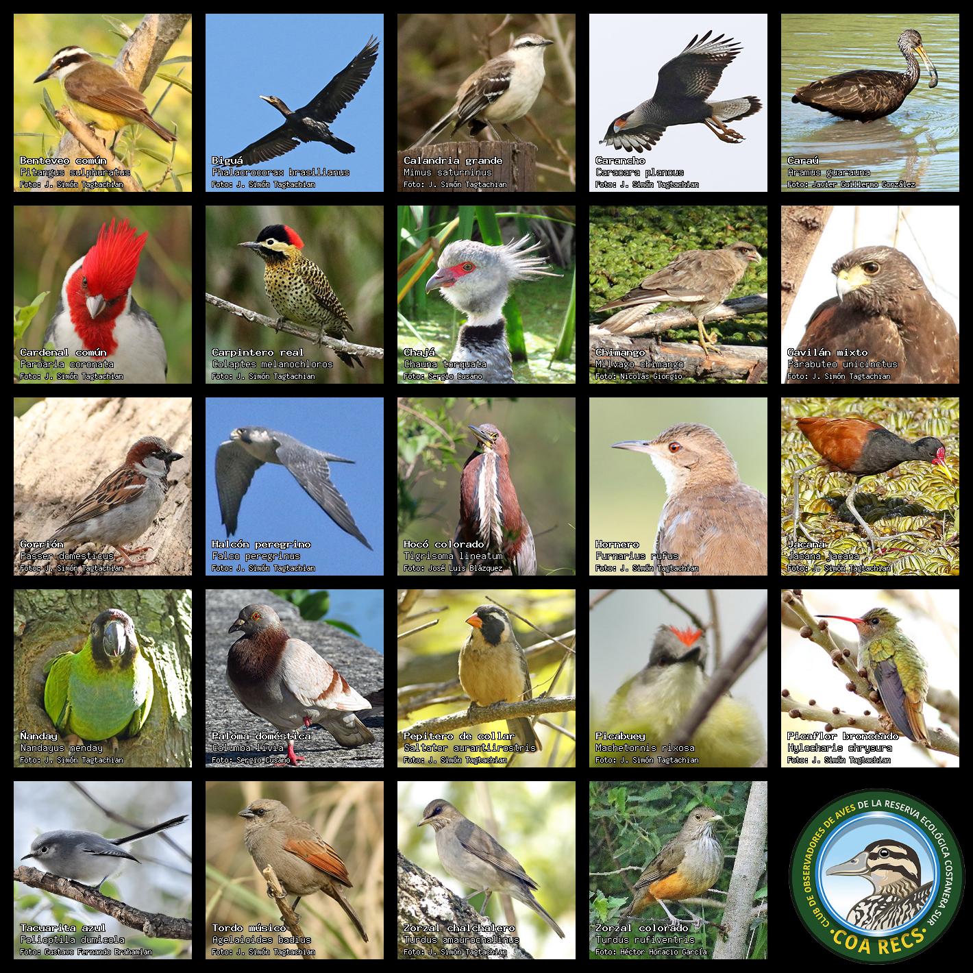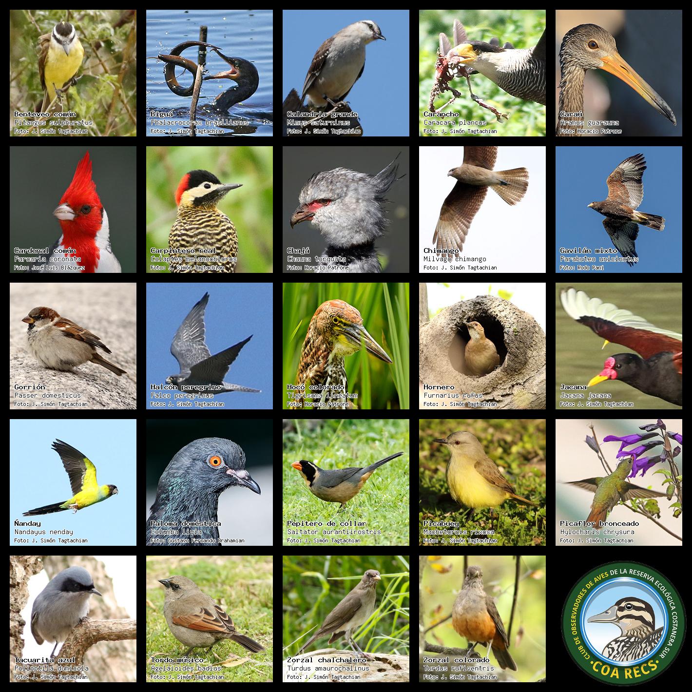(Gavilán mixto, Carancho, Chimango, Benteveo común, Hornero, Carpintero real y Estornino pinto)