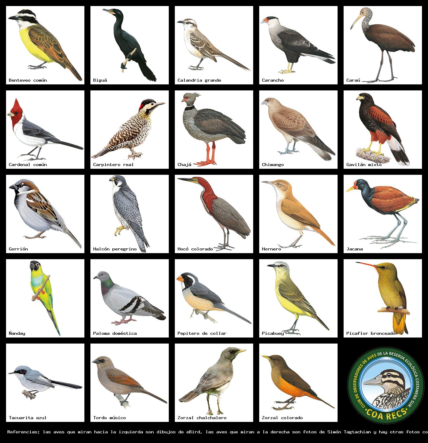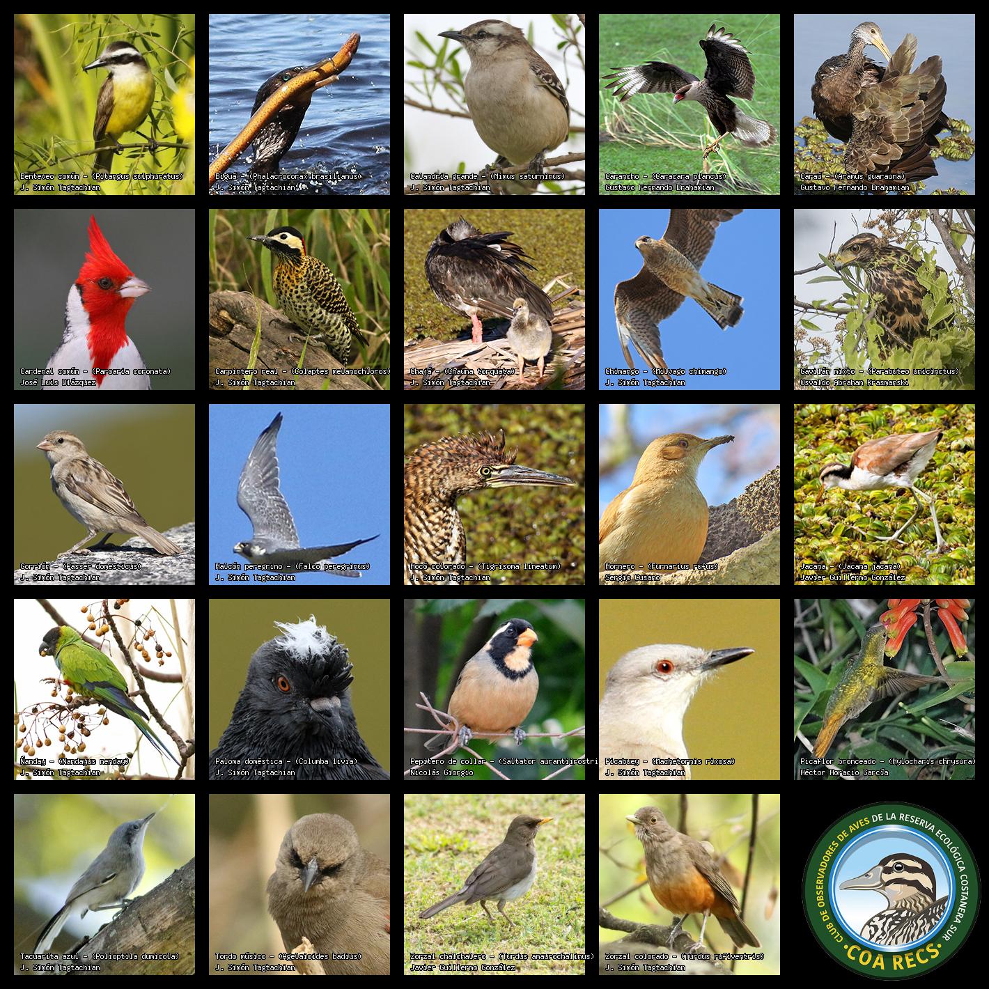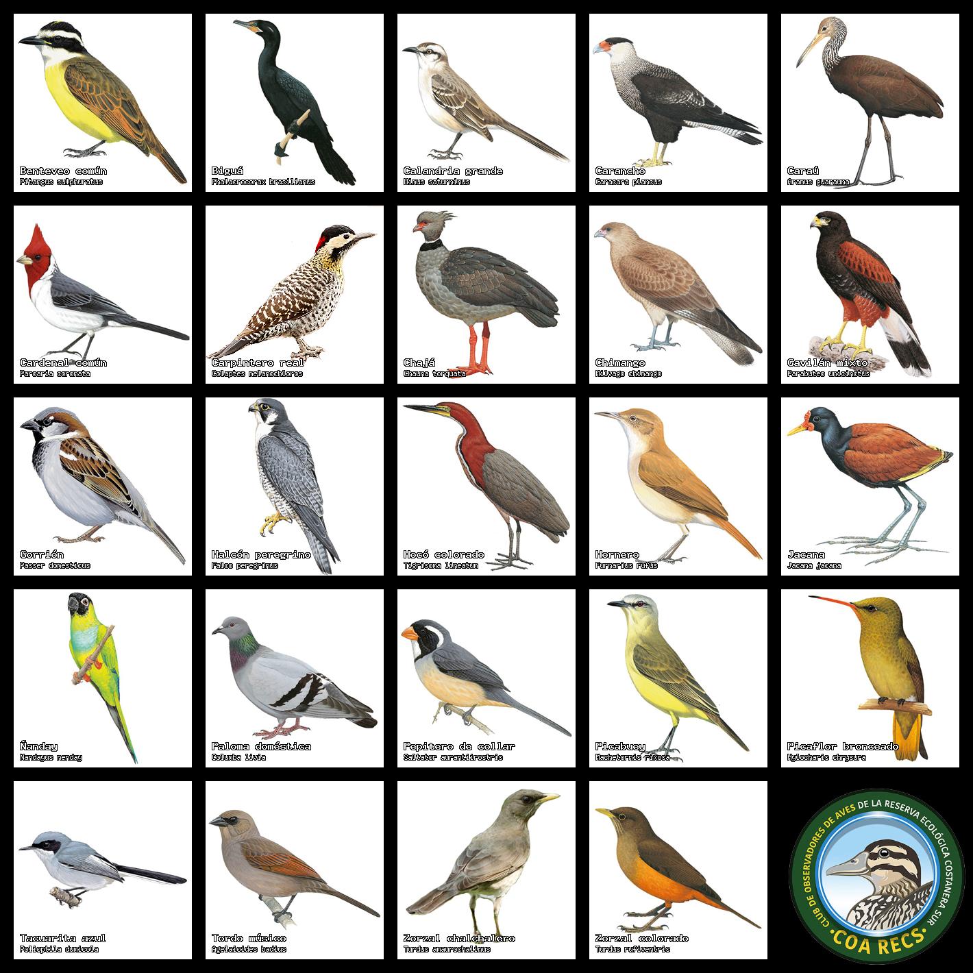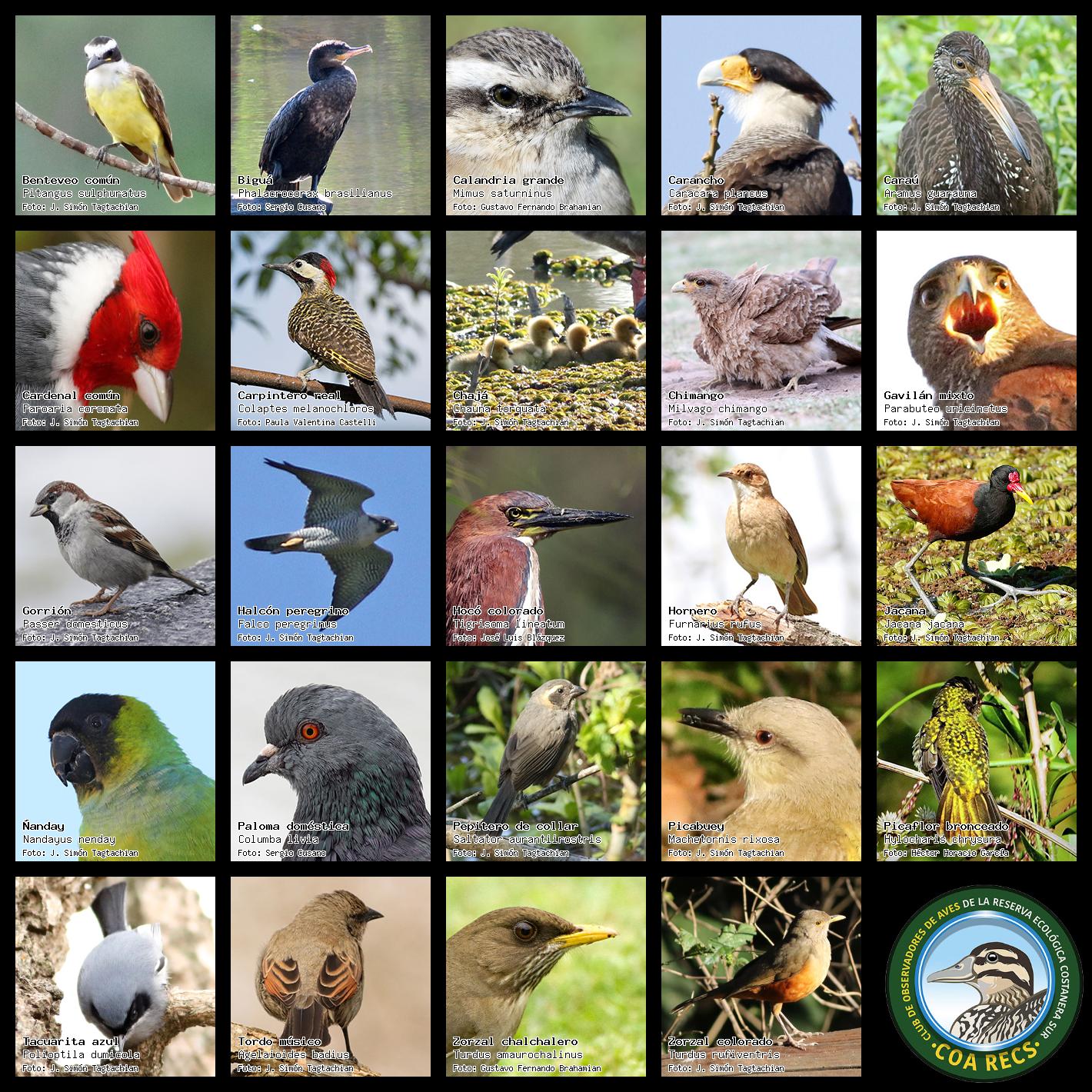 (Gavilán mixto, Carancho, Chimango, Benteveo común, Hornero, Carpintero real y Estornino pinto)