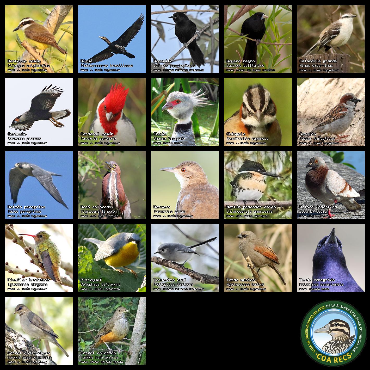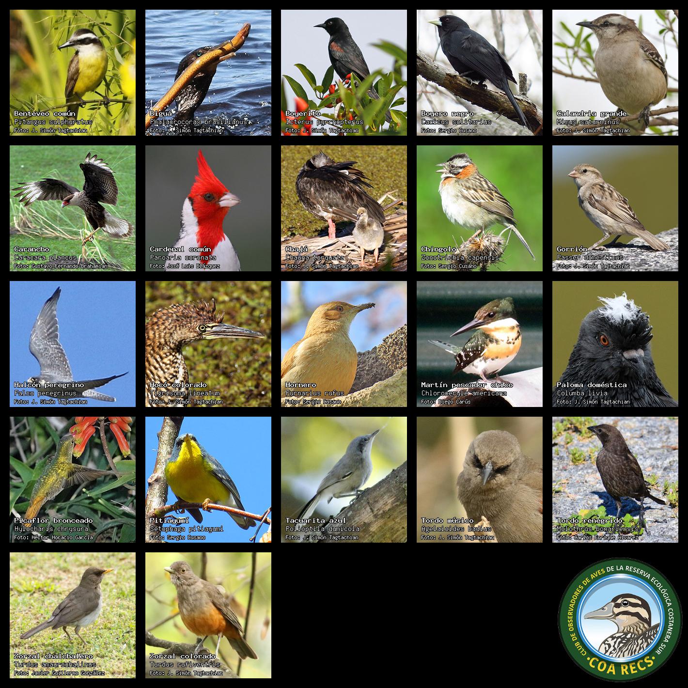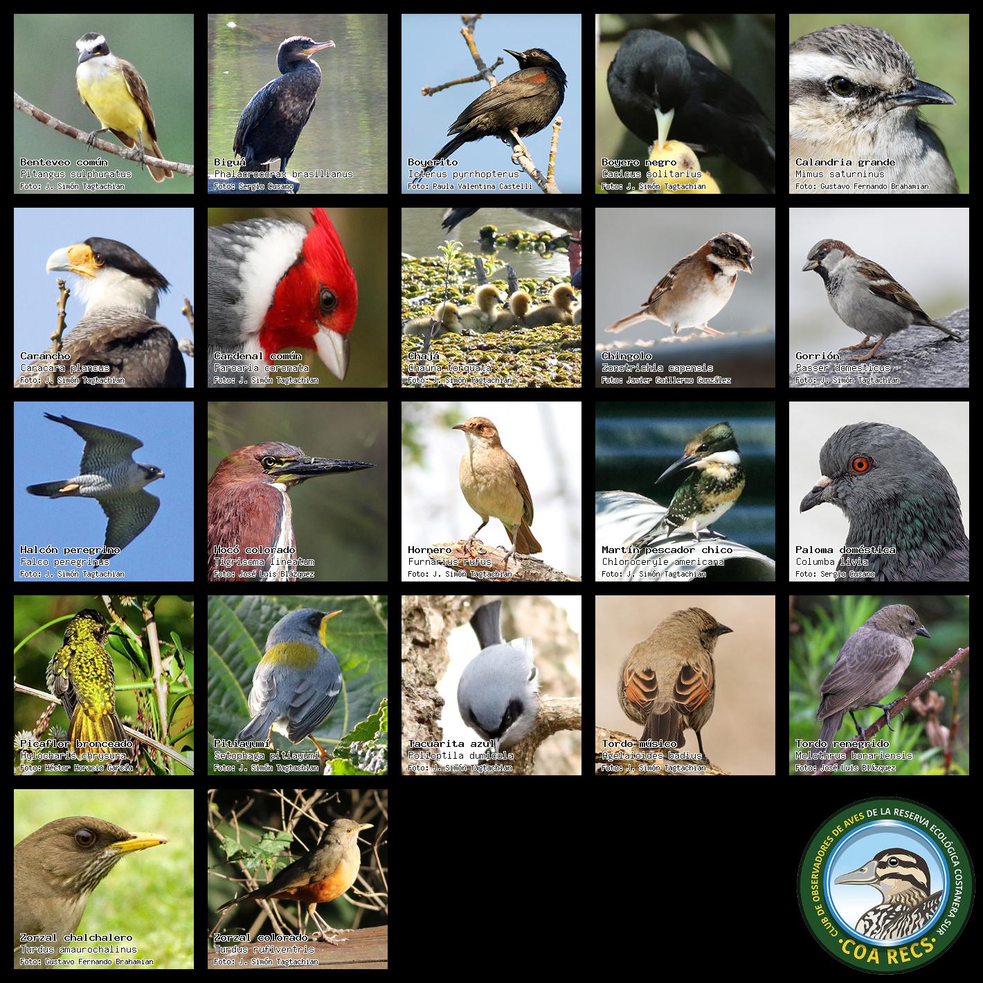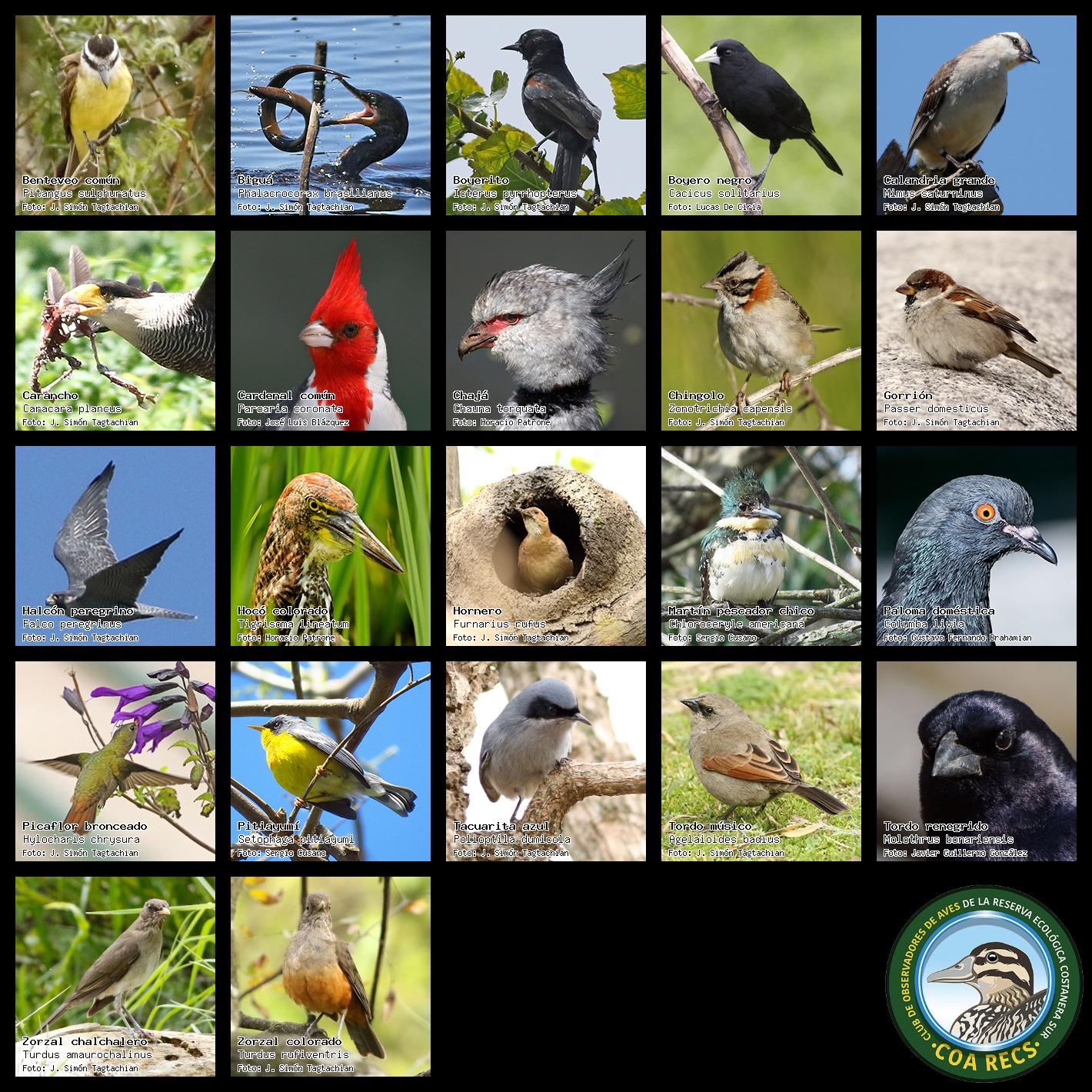 (Gavilán mixto, Carancho, Chimango, Benteveo común, Hornero, Carpintero real y Estornino pinto)
